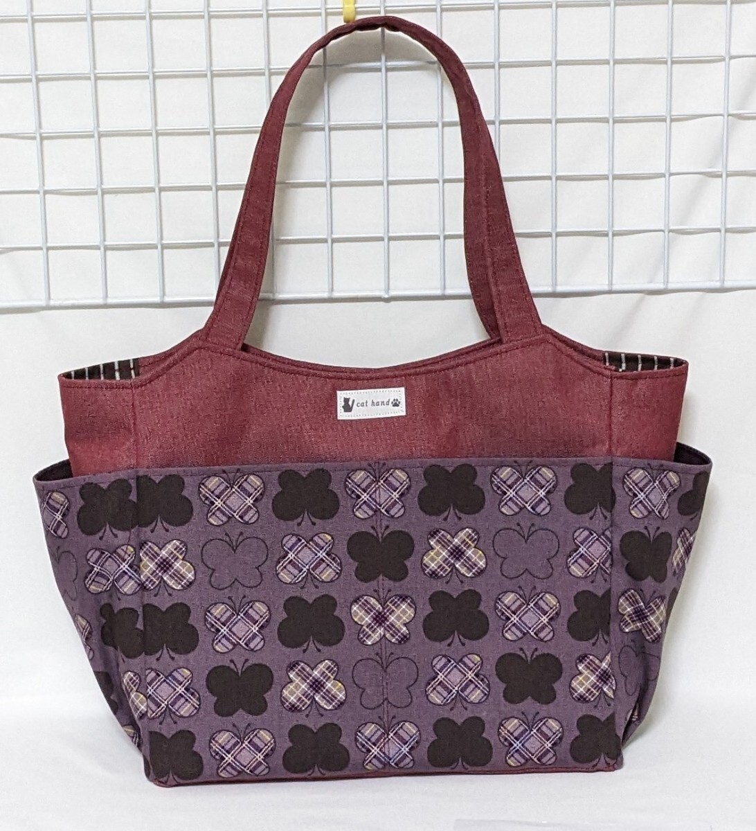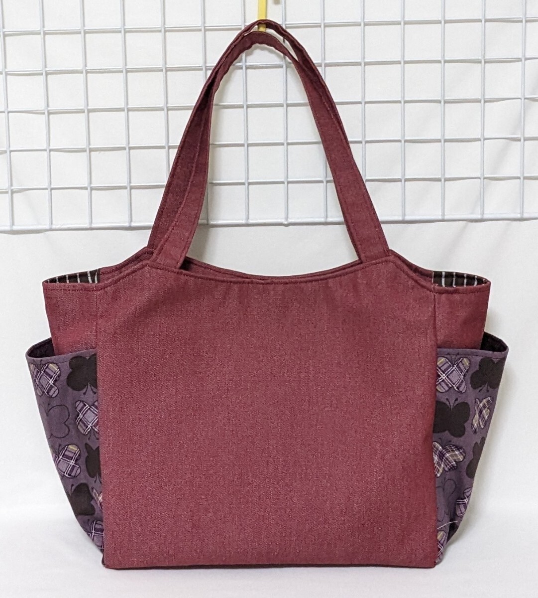 シンプルな蝶々のデザインが可愛い、シルエットバタフラ(蝶々)・パープルの生地をポケットにしたカラーデニム・ガーネット(赤紫)のサイドポケット付きトートバッグです。