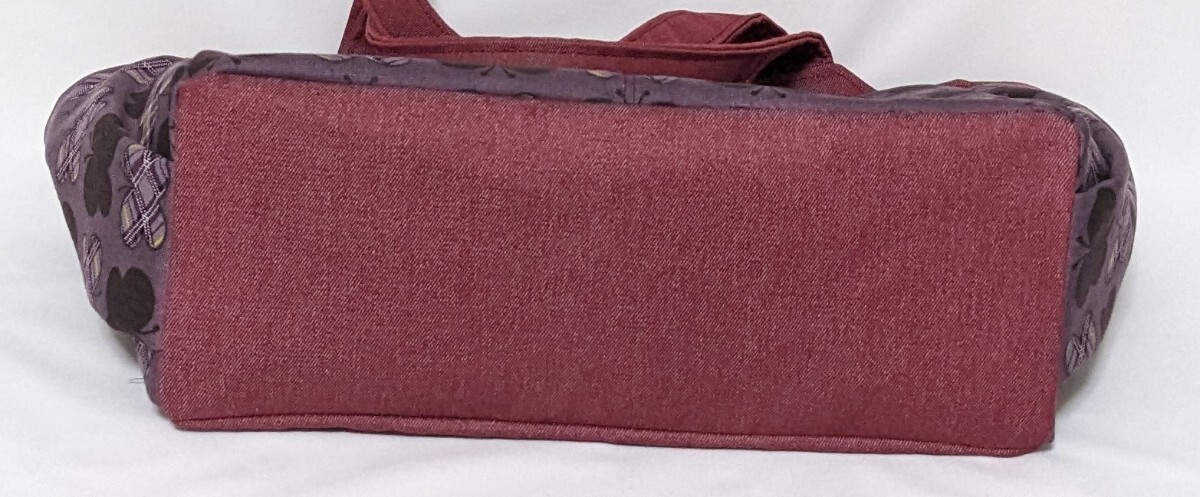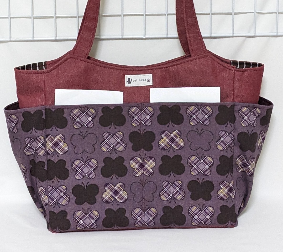 シルエットバタフライ・パープル・デニムガーネットのサイドポケット付きトートバッグ・ハンドメイド