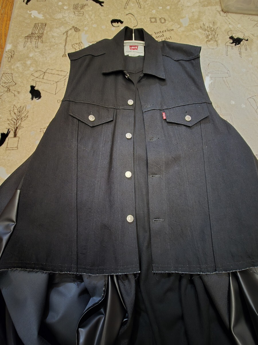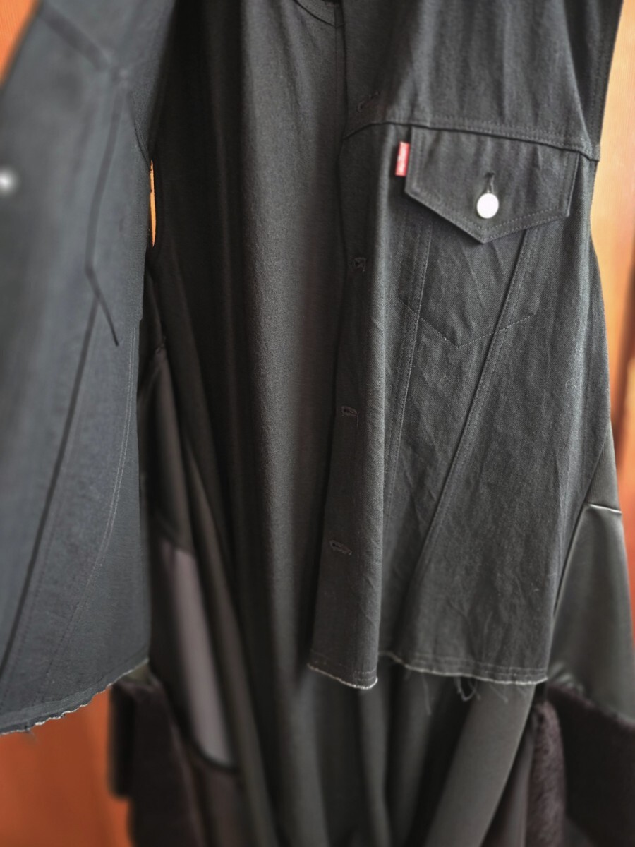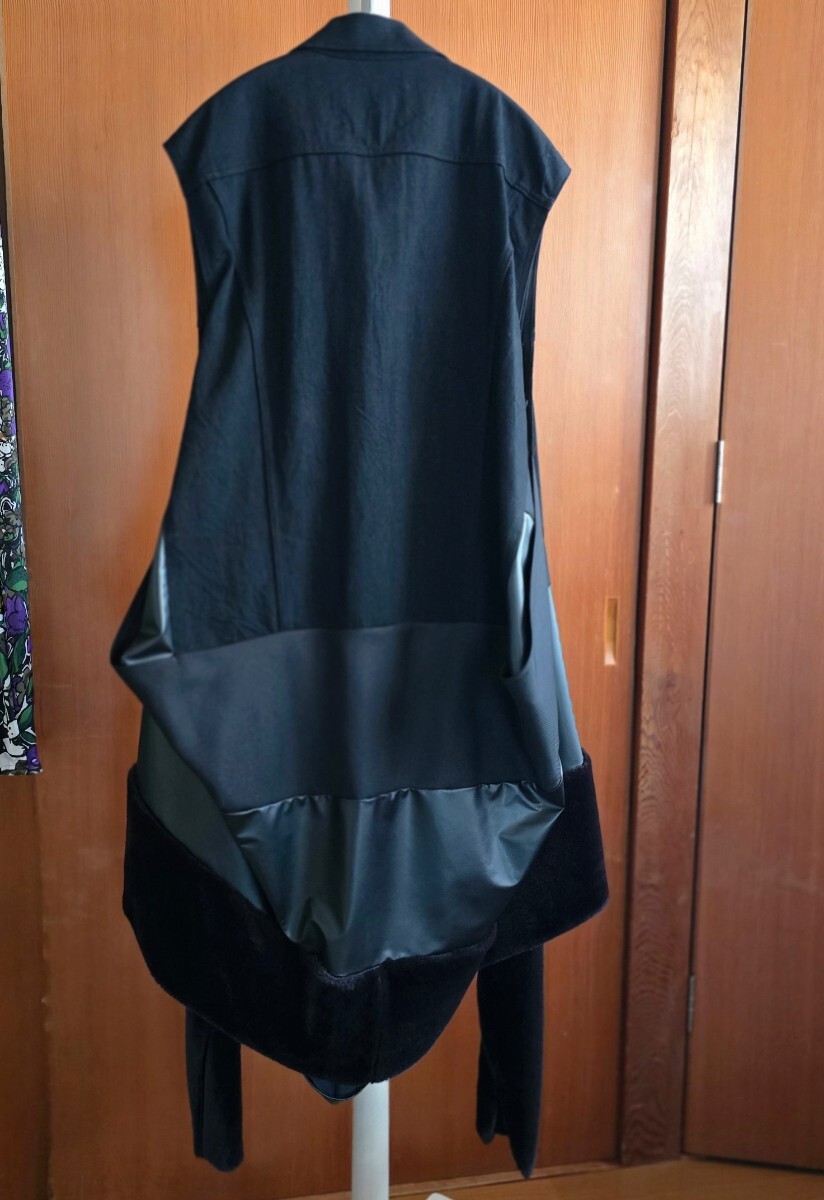 ウールの前身頃にブラックデニムのベストをはおっています。ウール生地は前身頃のみで背中はデニムです。