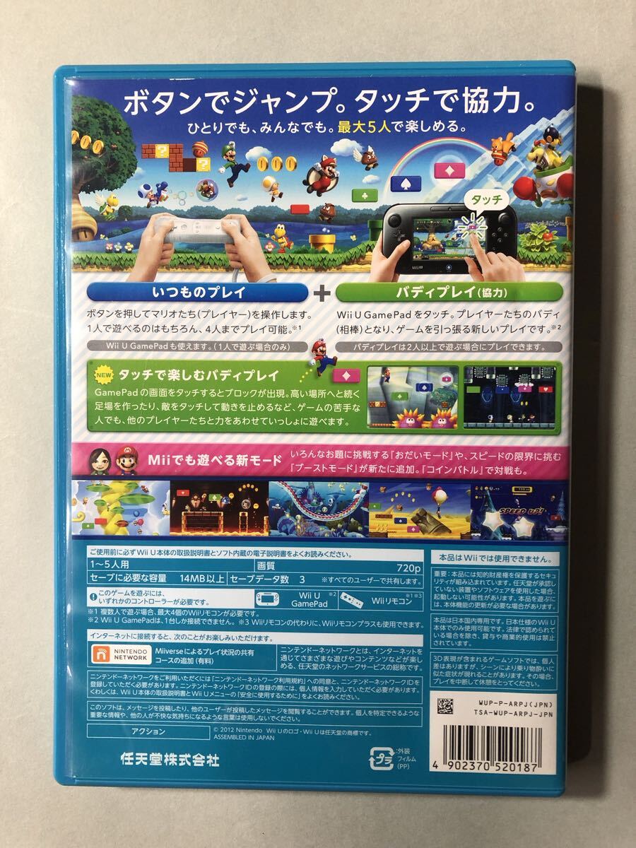 Wii Uソフト NewスーパーマリオブラザーズU「ボタンでジャンプ。タッチで協力。ひとりでも、みんなでも。最大5人で楽しめる。」任天堂です。ケースに擦れ、細かな傷、線傷、線状や点状のへこみ跡があります。ディスクのデータ読み取り面に細かな傷、微細な線傷が少しだけあります。起動、動作確認済みです。写真のモノが全てです。新品をお探しの方や神経質な方の入札はご遠慮下さい。ノークレーム・ノーリターンで、お願いします。入札よろしくお願いいたします。 C06-423-092907