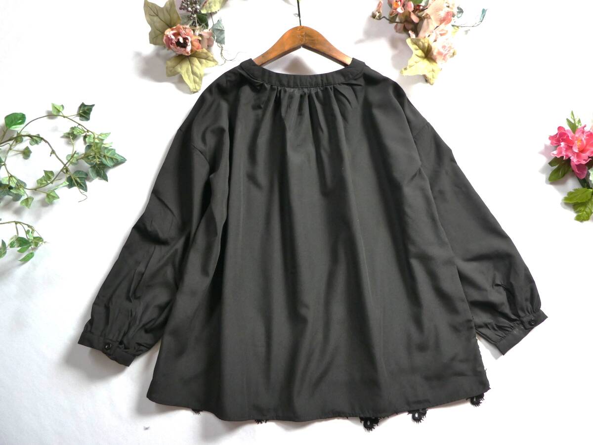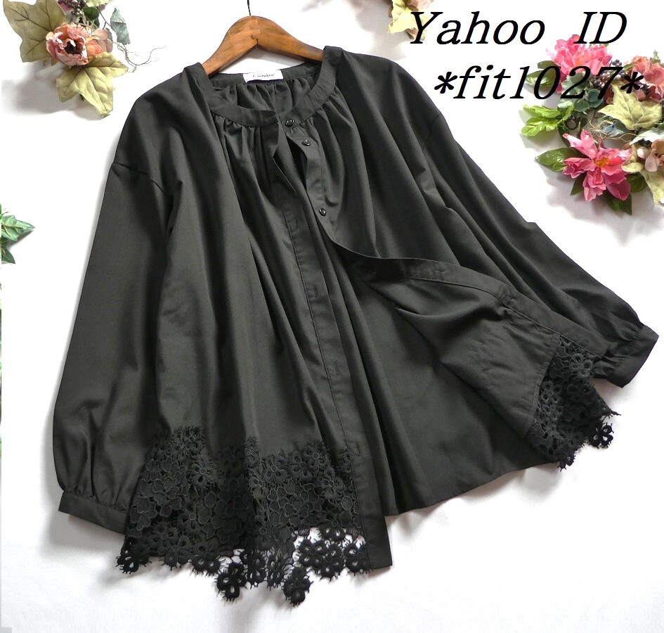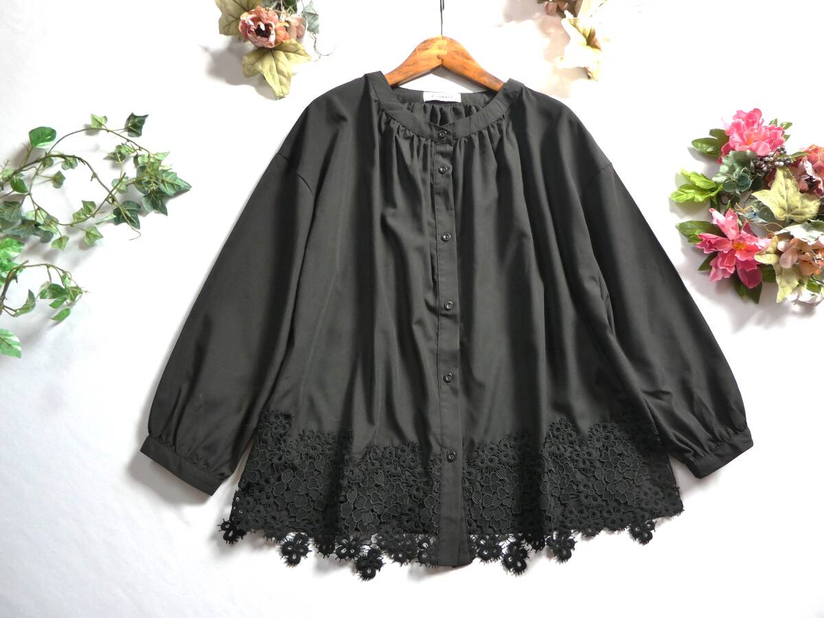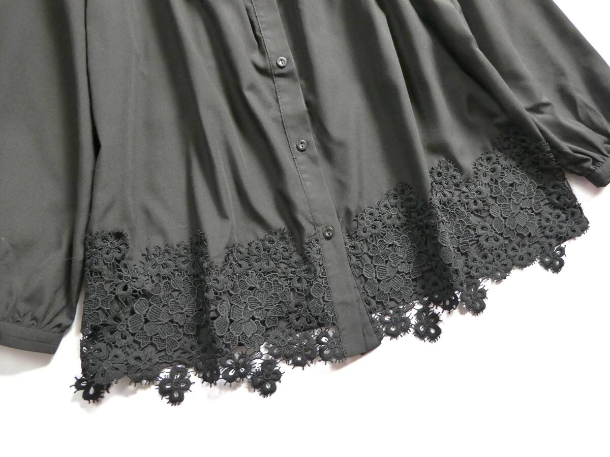 ゆったりサイズ【新品】ナチュラルでフェミニン♪ヨークカラーでふんわり☆裾レースシャツチュニック◇羽織り物・黒◆fit1027◆