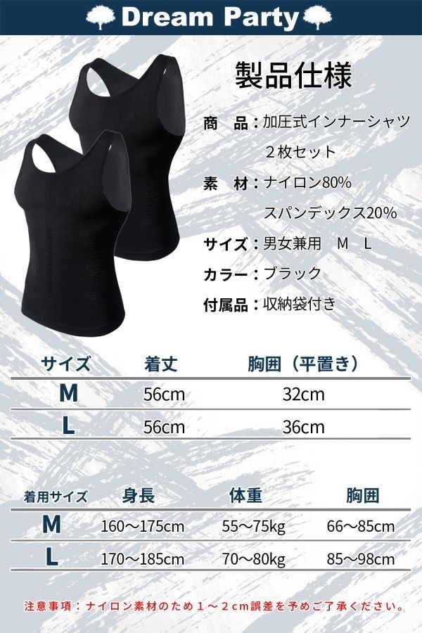 【サイズ】(男女兼用)M:着丈56cm、胸囲32cm/L:着丈56m、胸囲36cm 【カラー】ブラック×2枚セット 【素材】ナイロン80%、スパンデックス20% 【付属品】専用収納袋