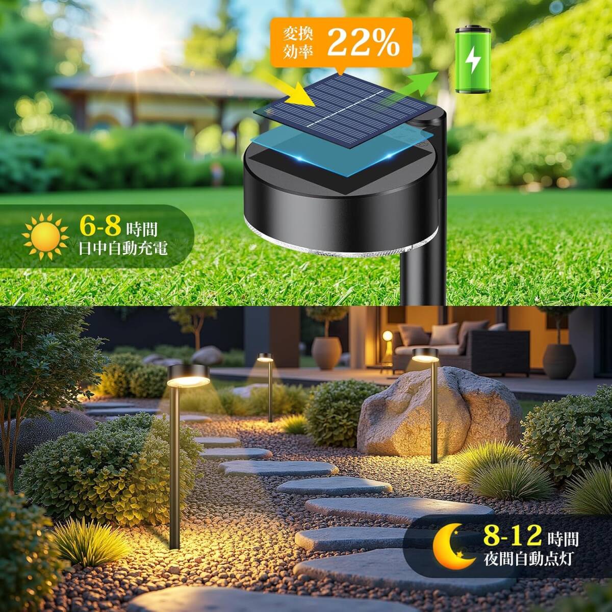 昼間は太陽光で自動充電し、夜になると自動で点灯。満充電で最大12時間以上点灯可能です。