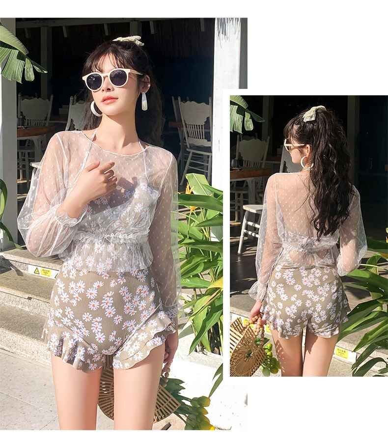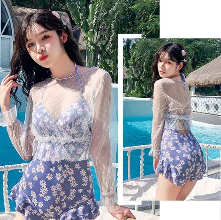 ・裾フリルが効いた上品な花柄のワンピース水着。露出は控えめです。