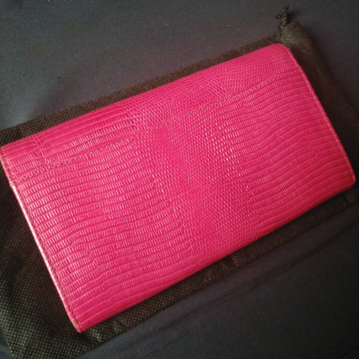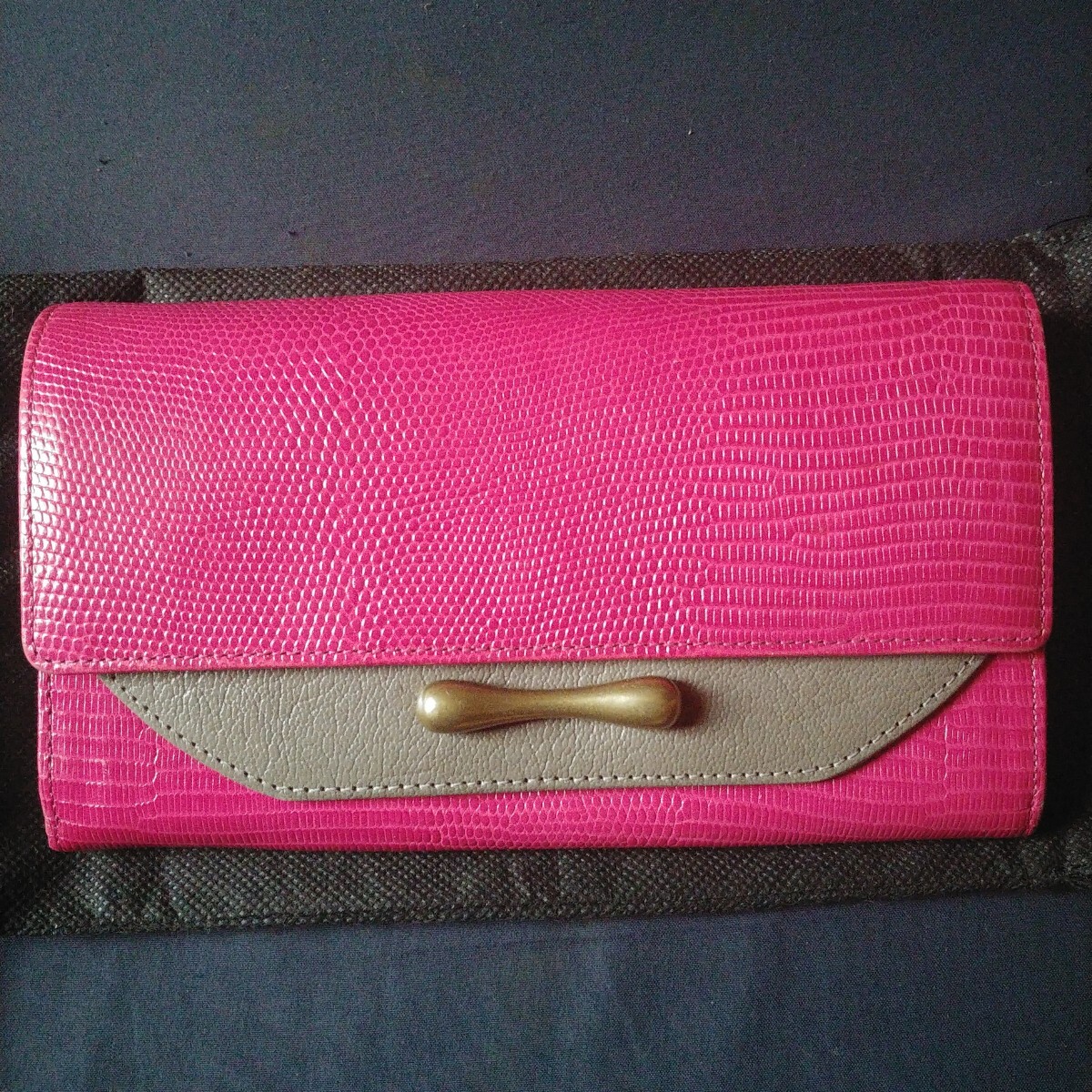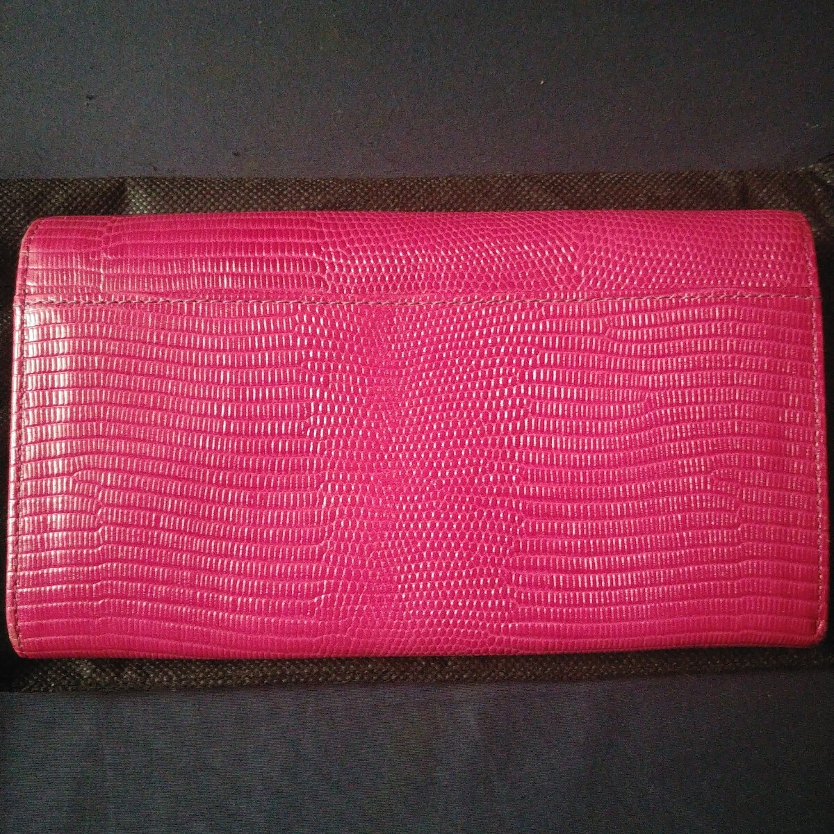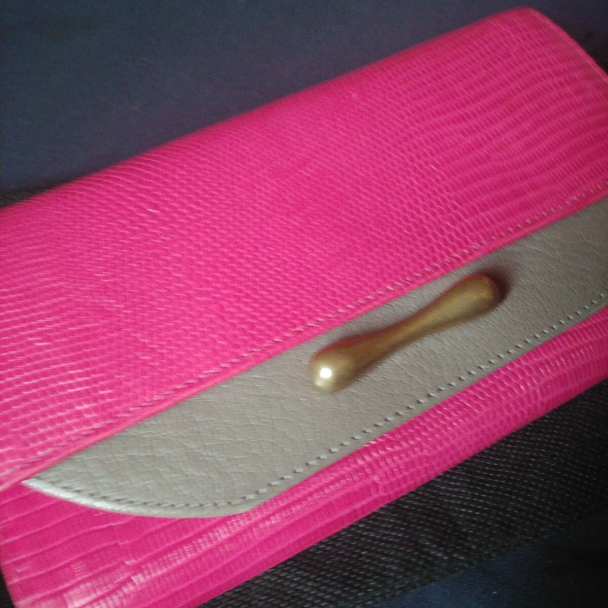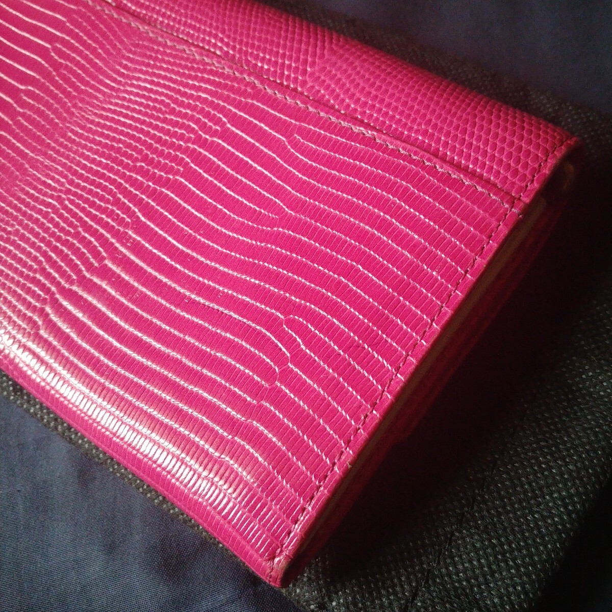 高級感あふれるクロコダイル型押しレザーに人気色のpink!! ブランドアイコンの真鍮金具が映える上品な作りになっています。