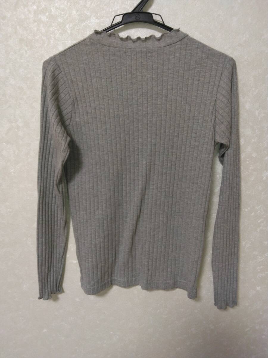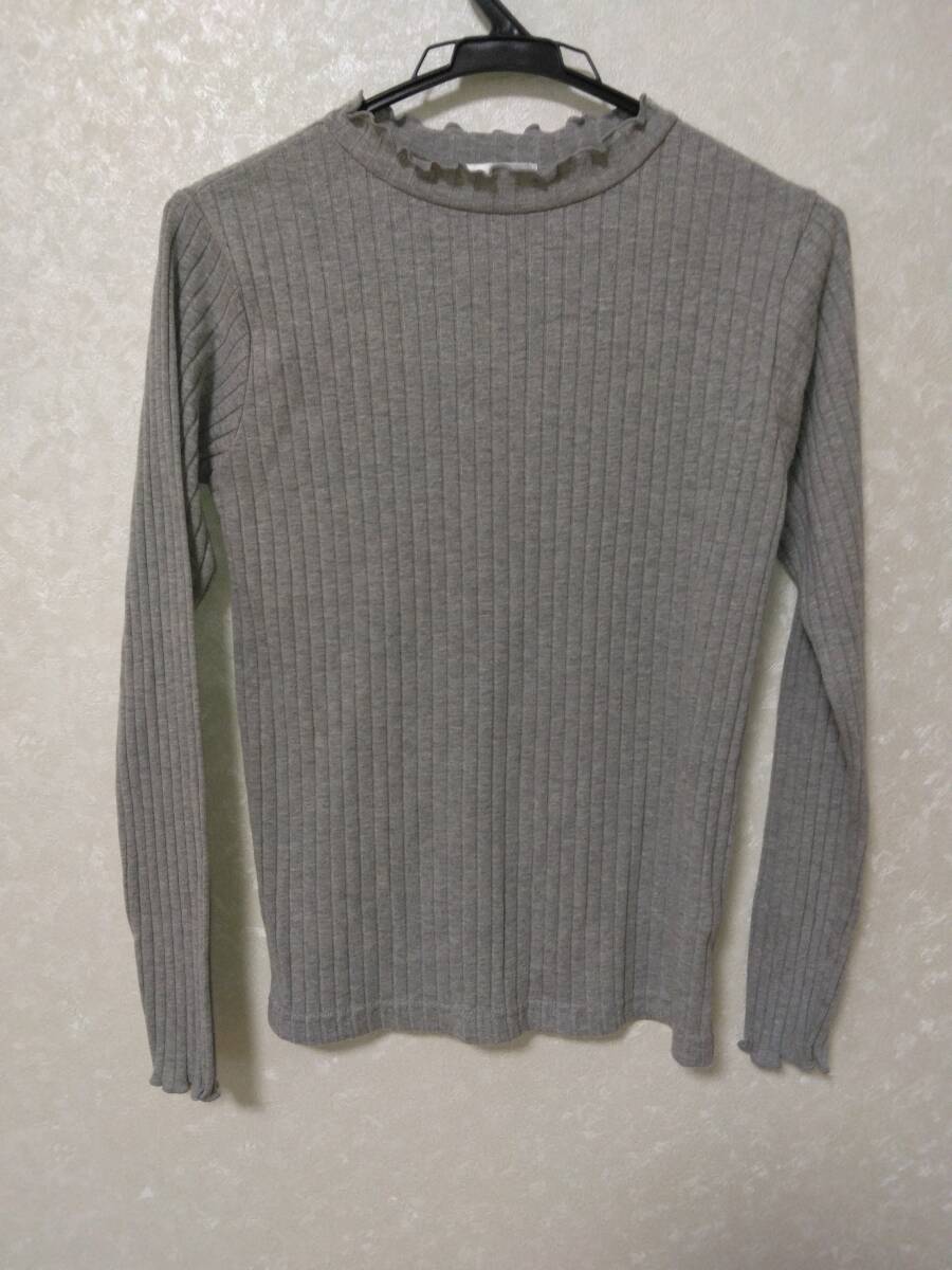 リブ編みデザインのグレーの長袖トップス、フリル襟が特徴。