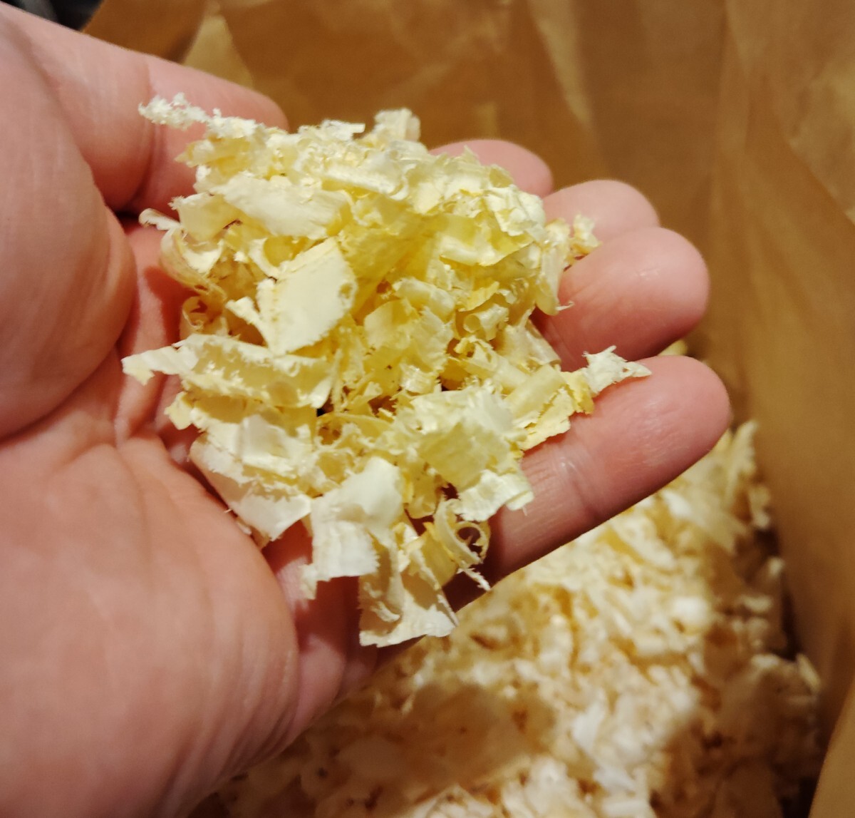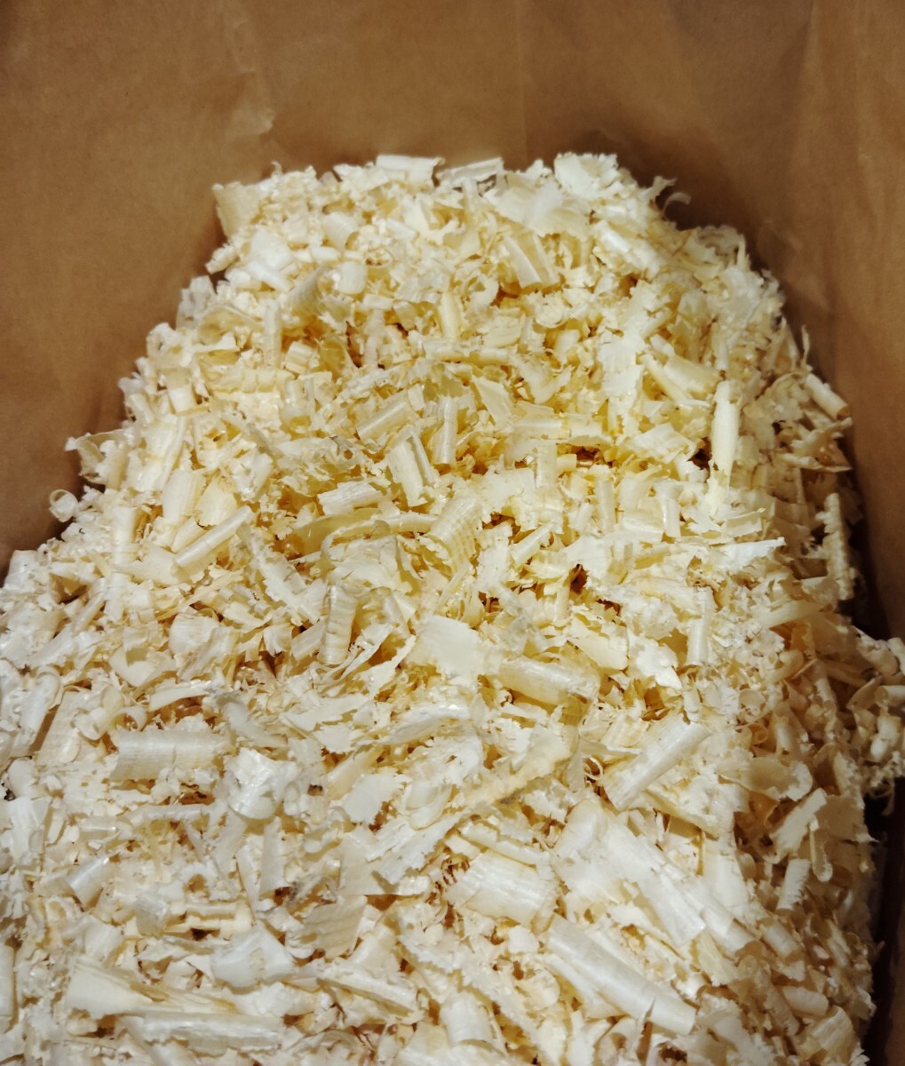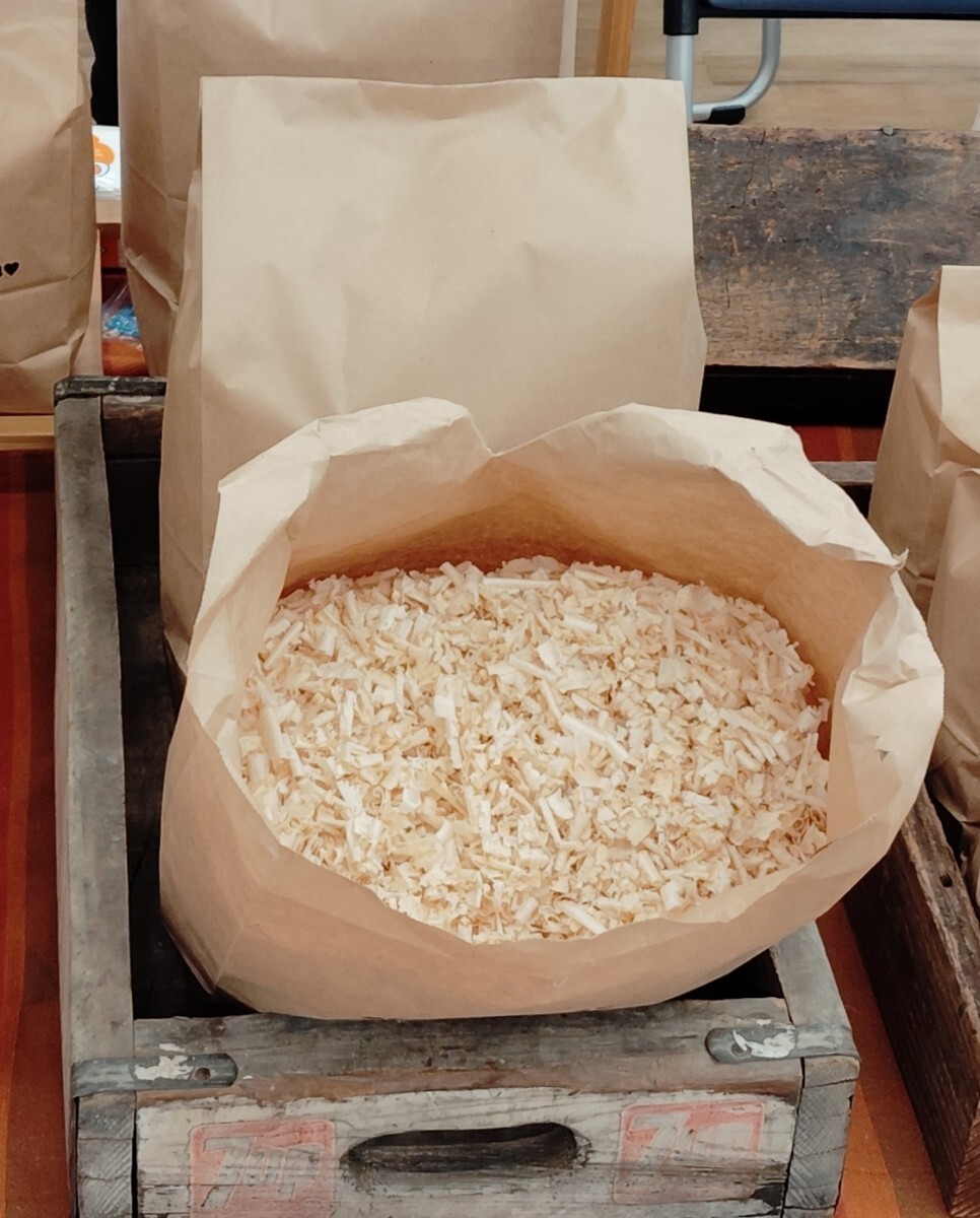天然木の風合いを感じられ、香りも楽しめる素材です。削り立てでしっかりと乾燥(水分含有率3〜5%前後)しているのでフワフワです。また、粉状の物ではないかんなくずで粒が大きい所も特徴的です。沢山入るようにトントンしながら詰めましたが、あえてギュウギュウに押し込まず、フワフワ感を損なわない様に絶妙なバランスで封入しております。