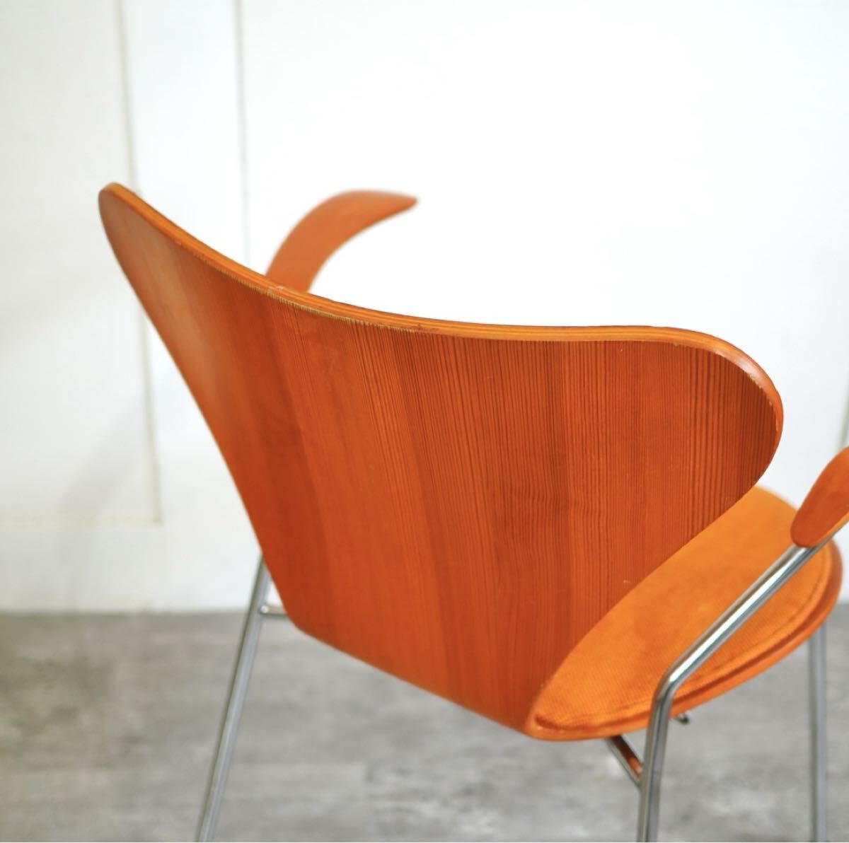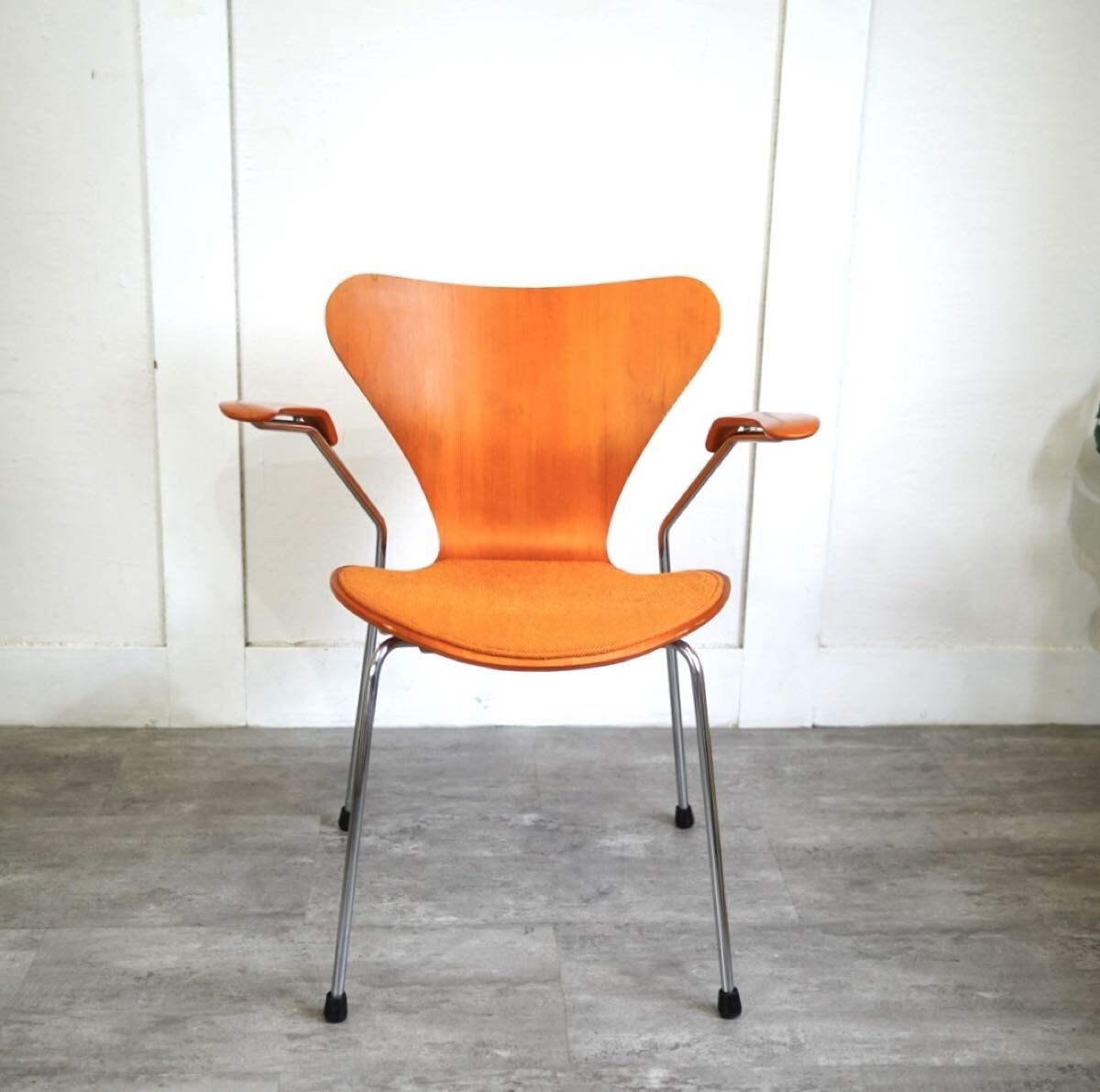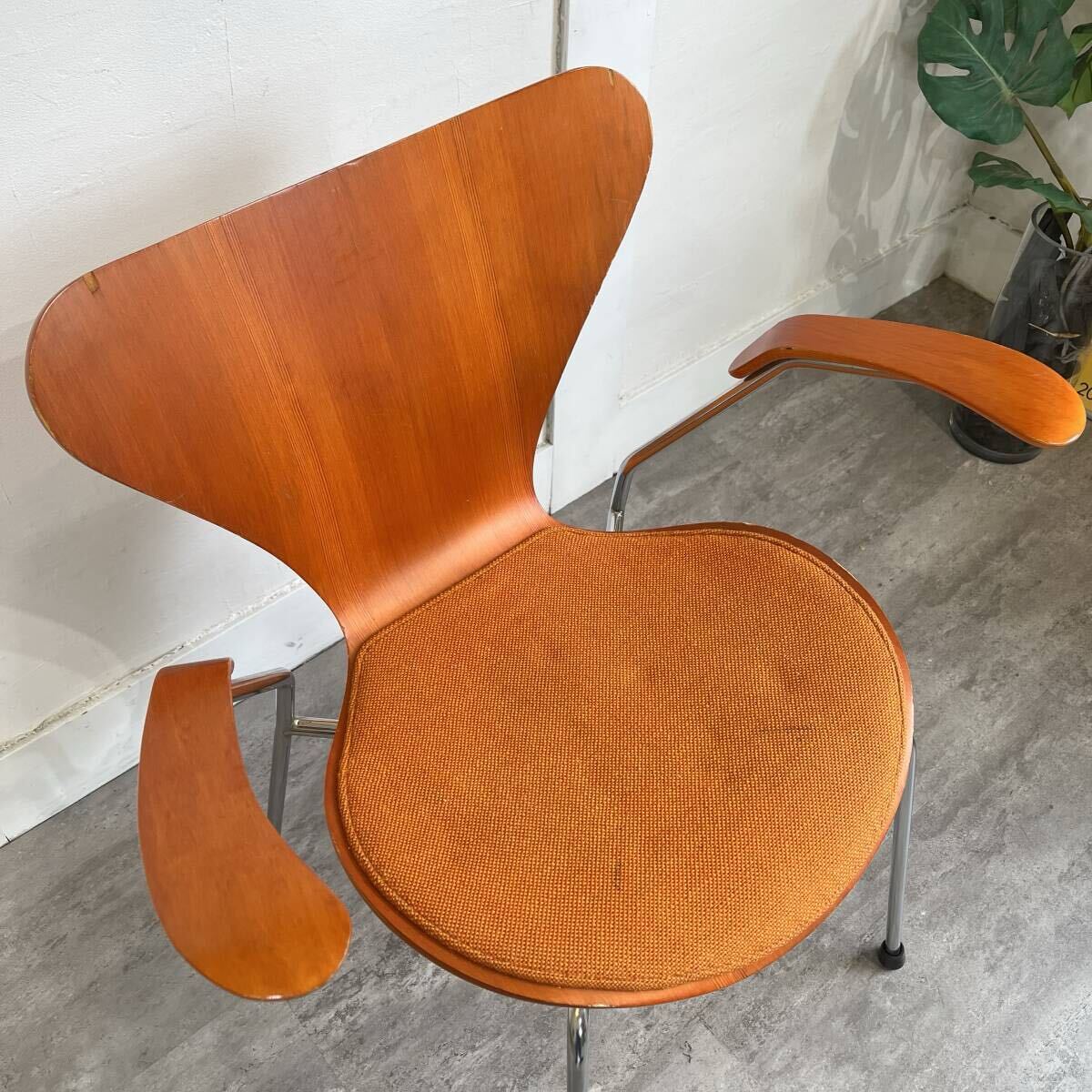 名作チェアのアイコン、セブンチェアですが、希少なビーチ・オレンジのヴィンテージアームチェアです。座面のみパッド付で座り心地もソフト。インテリアとして飾るのにもおすすめです。