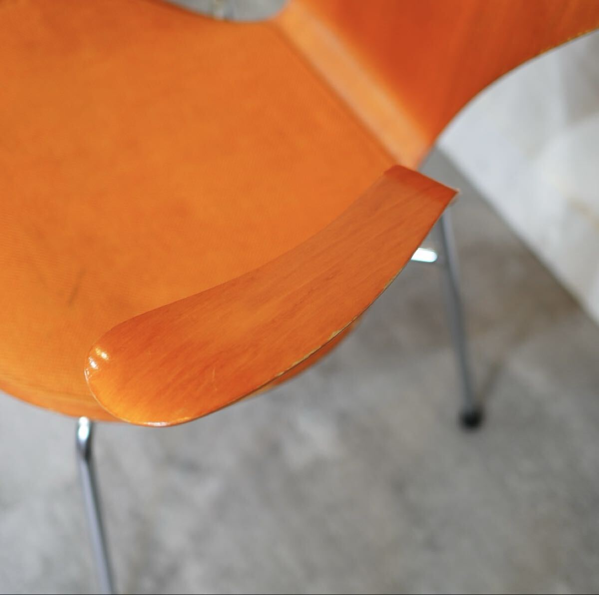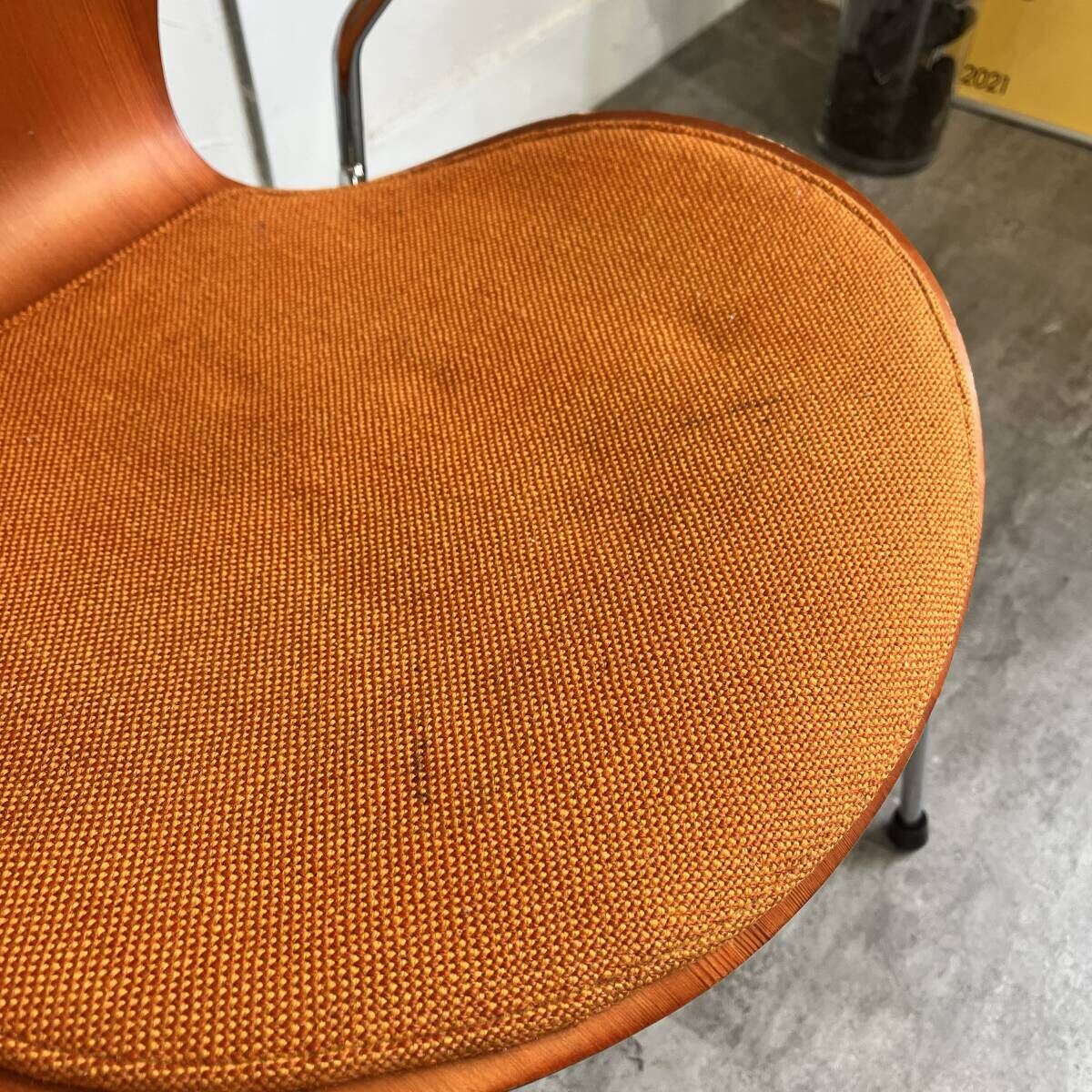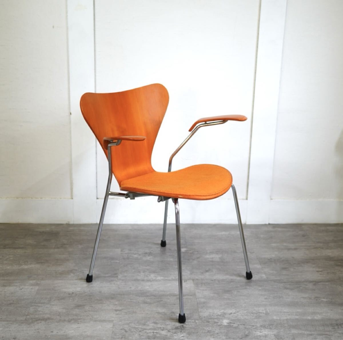 名作チェアのアイコン、セブンチェアですが、希少なビーチ・オレンジのヴィンテージアームチェアです。座面のみパッド付で座り心地もソフト。インテリアとして飾るのにもおすすめです。