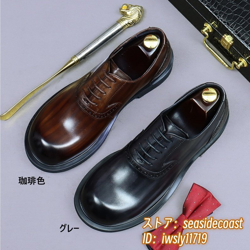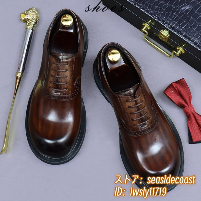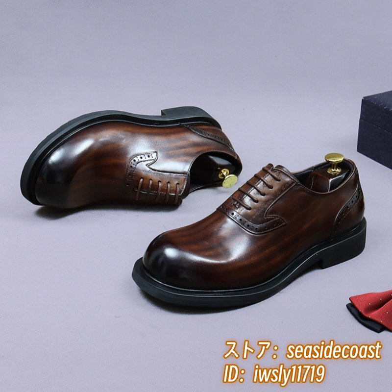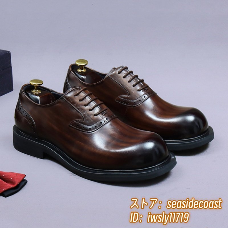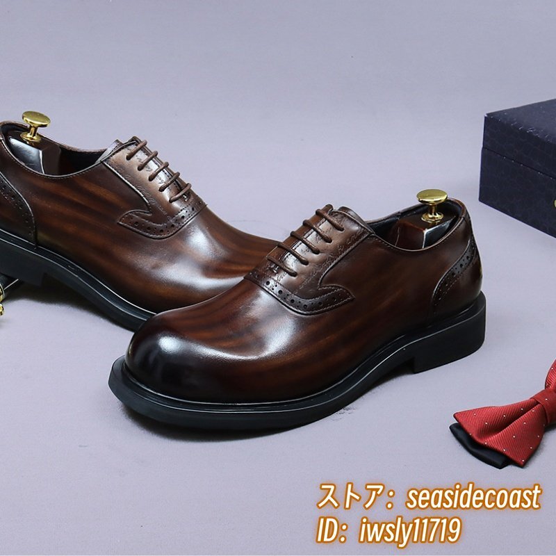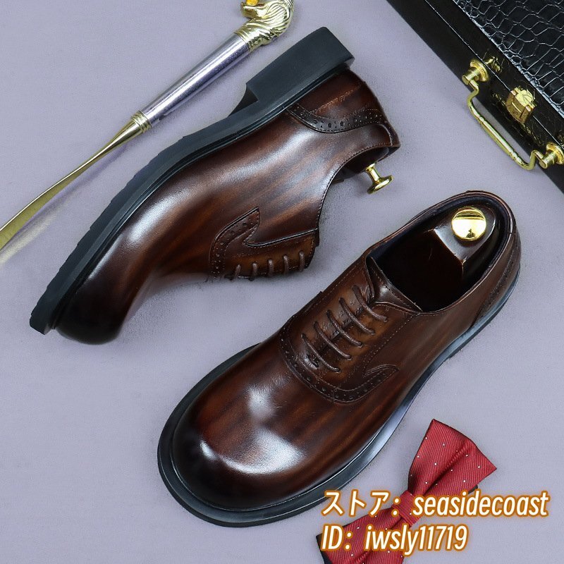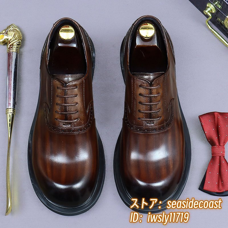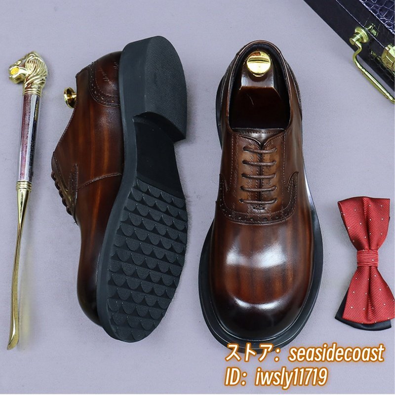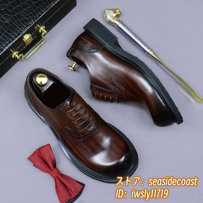 最上級◆定価13万 本革 ビジネスシューズ メンズ 本牛革 レザーシューズ 職人手作り 彫り 紳士靴 厚底 イギリス風 冠婚葬祭 珈琲色 24.5cm