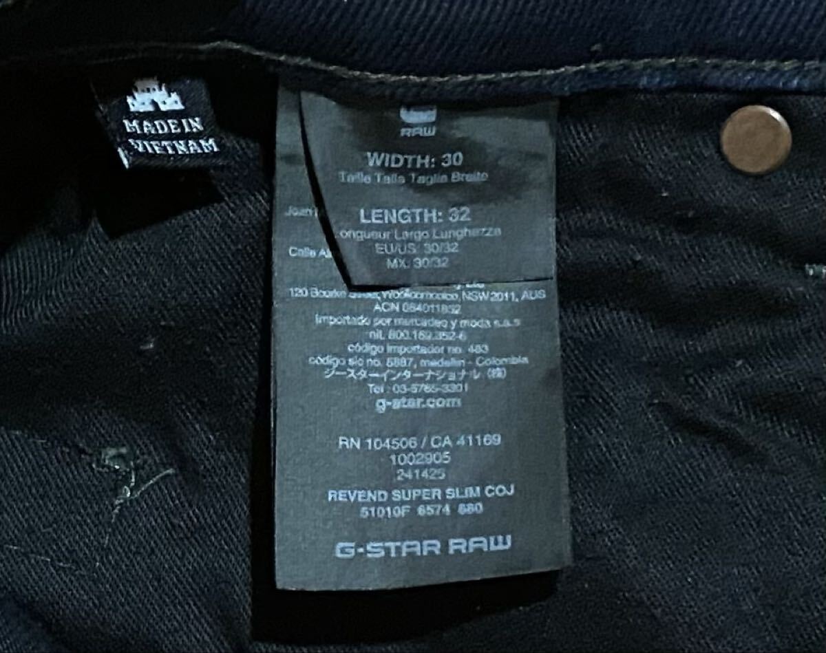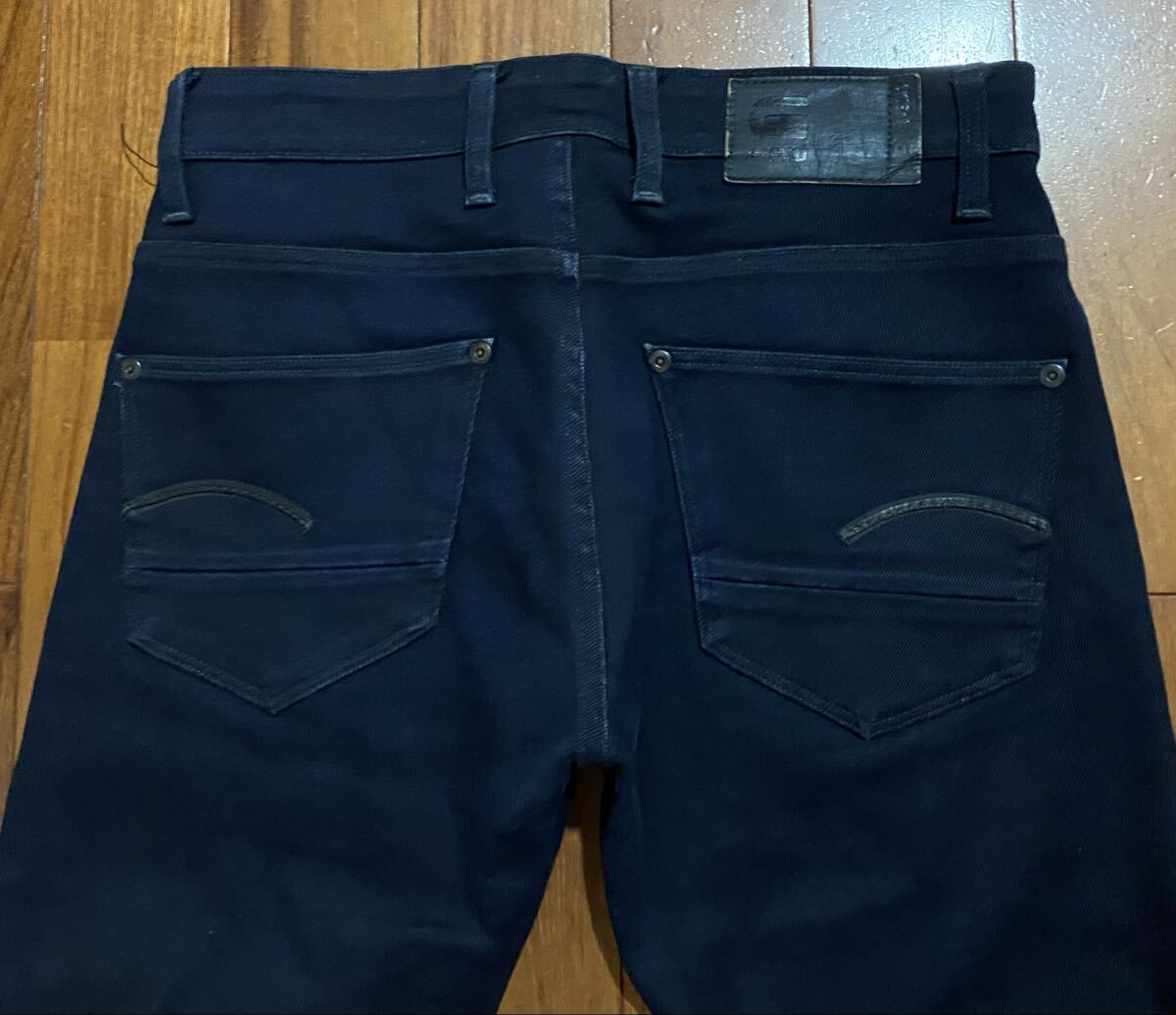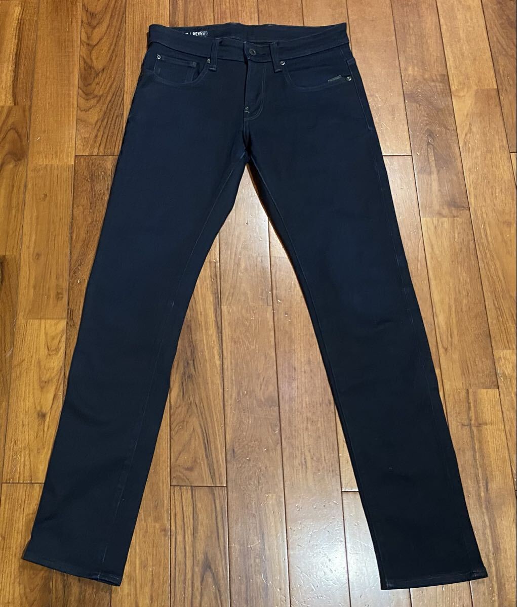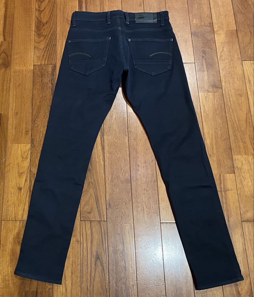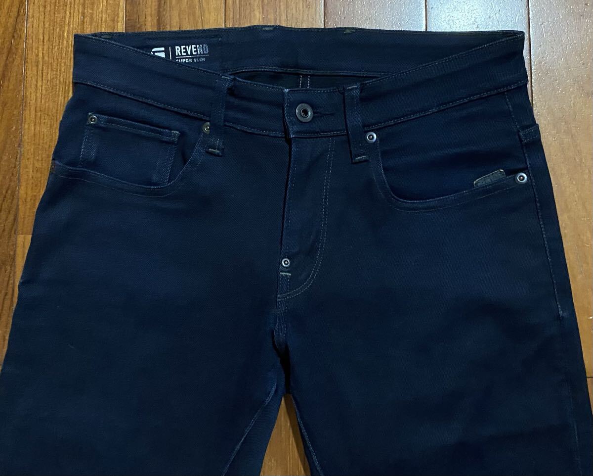 ジースターロウのストレッチデニム(ジーンズ)、REVEND SUPER SLIM COJ 51010F 6574 880です。色はインディゴブルーです。USEDですが状態は良いです(10段階中8程度)。紙パッチ、ジッパーフライ、裾はチェーンステッチです。生地はストレッチ入りで綿70%、ポリエステル28%、ポリウレタン2%です。正規品です(ジースターインターナショナル(株)、ベトナム製)。サイズはW30×L32でウエストは重ねずに平置きで約78cm、ヒップ約96cm、股上約23cm、股下約80cm、股下15cmのふともも部分約47cm、裾まわり約30cm、重量約610gです。発送はゆうパケットポストになります。