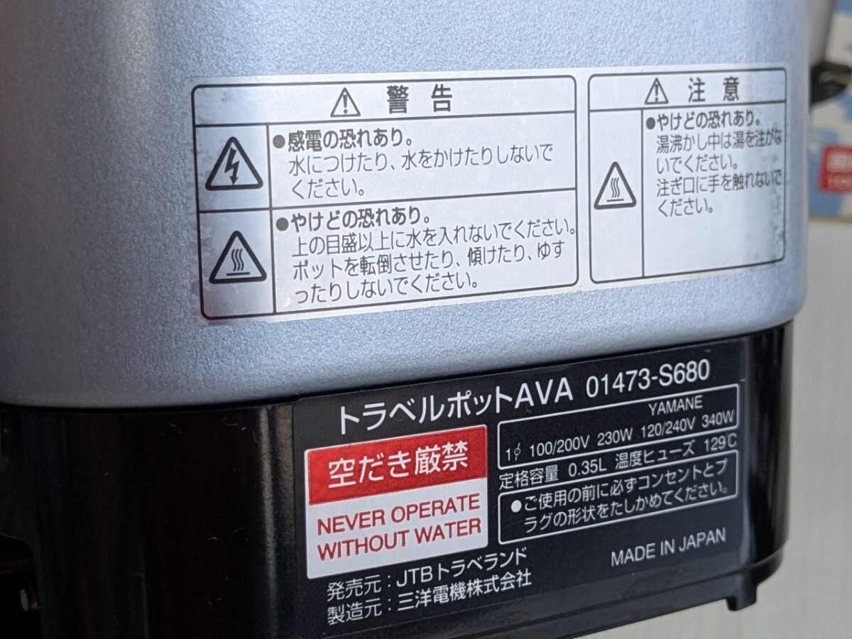 箱にカビ トラベルポット AVA 旅行用湯沸かし器 サンヨー SANYO JTBトラベランド 100V~240V対応 0.35 made in japan