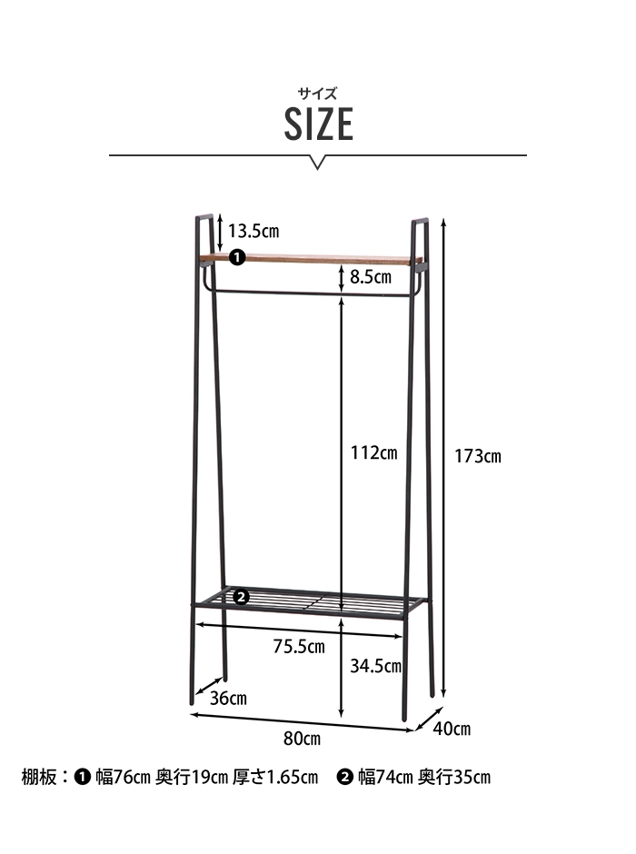 | [全体]約幅80×奥行40×高さ173cm [上棚板サイズ]約幅76×奥行19×高さ1.7cm [下棚板サイズ]約74×35cm [パイプ直径]約1.9cm |