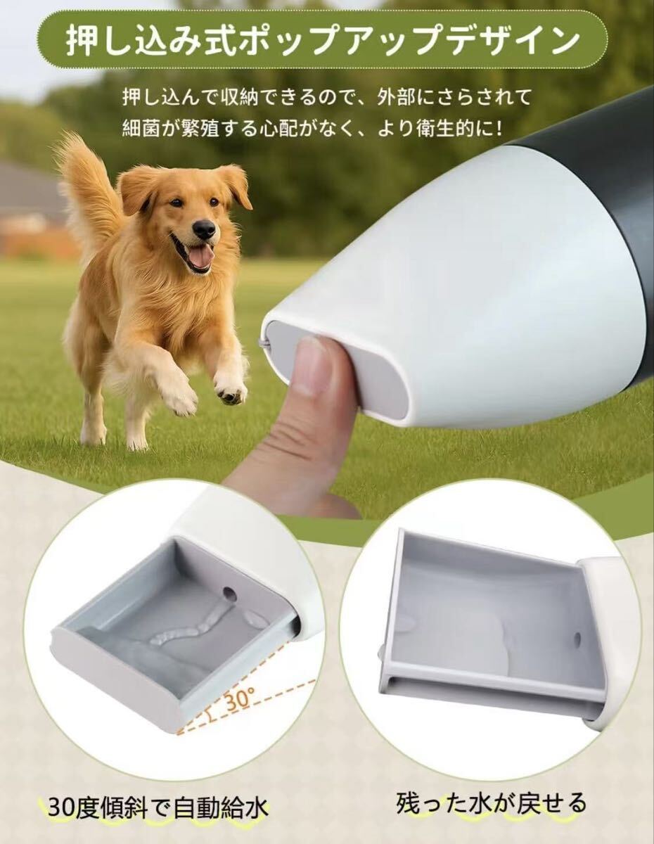 【1本2役ペット給水ボトル】ワンタッチで水を出せる便利な操作性。片手でボタンを押すだけで、内蔵されたお皿に水が流れ出す。水はもちろん、ちょっとしたおやつも携行できる犬用給水ボトル、お水とおやつを一緒に運べるからお散歩がもっと楽しくなる!