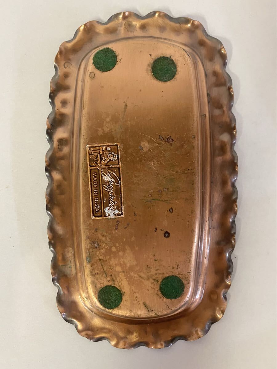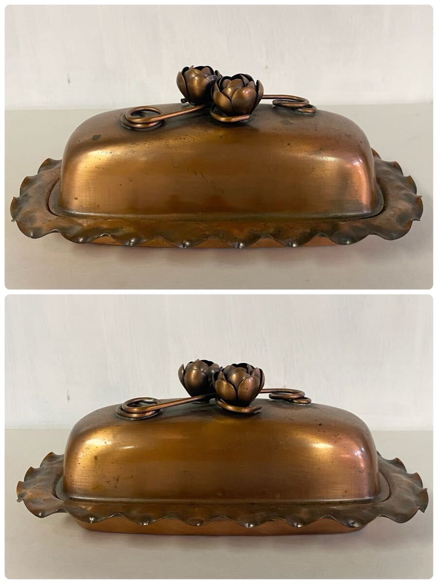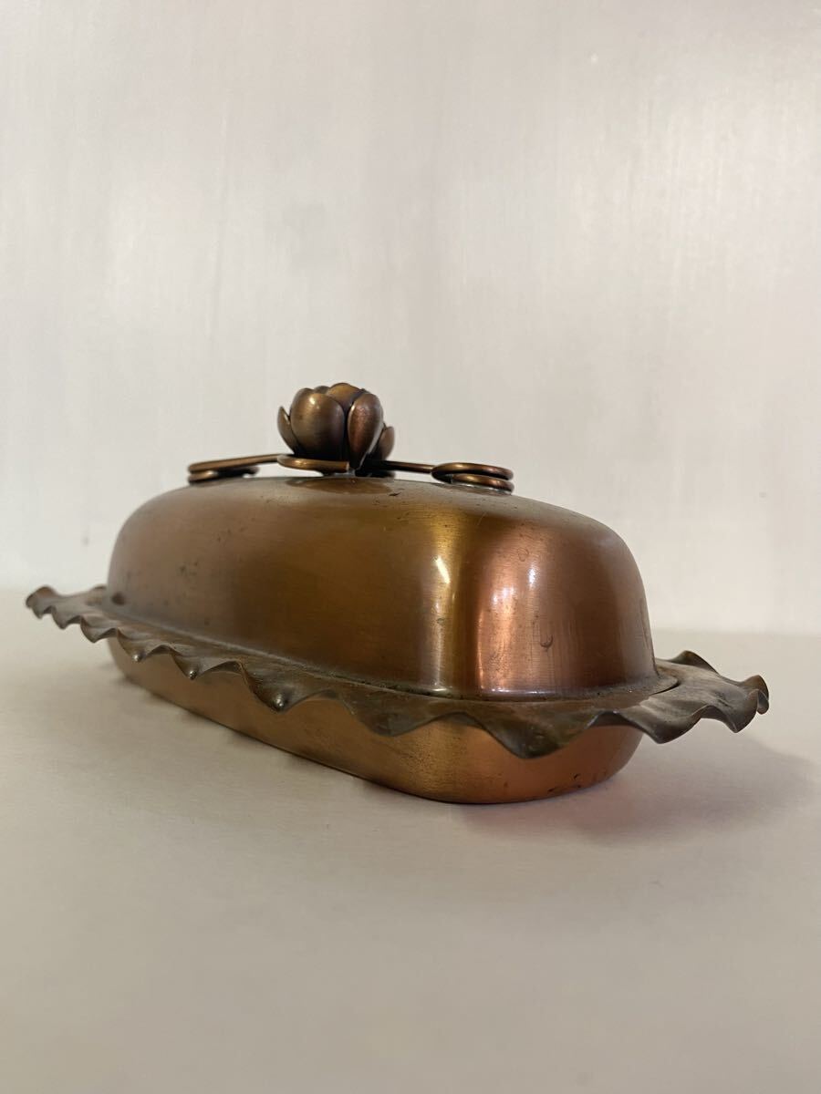 1960年代~、GREGORIANのバターケースです。 数多くの銅細工製品を世に送り出したGregorian Copper。 美しい細工に銅の鈍い輝きが魅力の一品。 中にガラス皿が入ります。 バターケースだけでなく、ジュエリーケースや灰皿としてもオススメです。 【サイズ】 高さ85mm 幅198mm 奥行き90mm 【状態】 小傷や細かな汚れ、銅のくすみなどございますが、目立つようなダメージはございません。 商品No:z00787 |