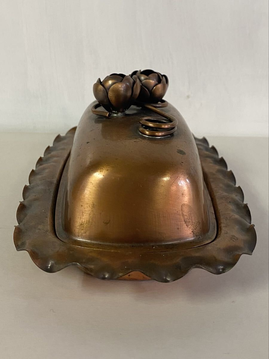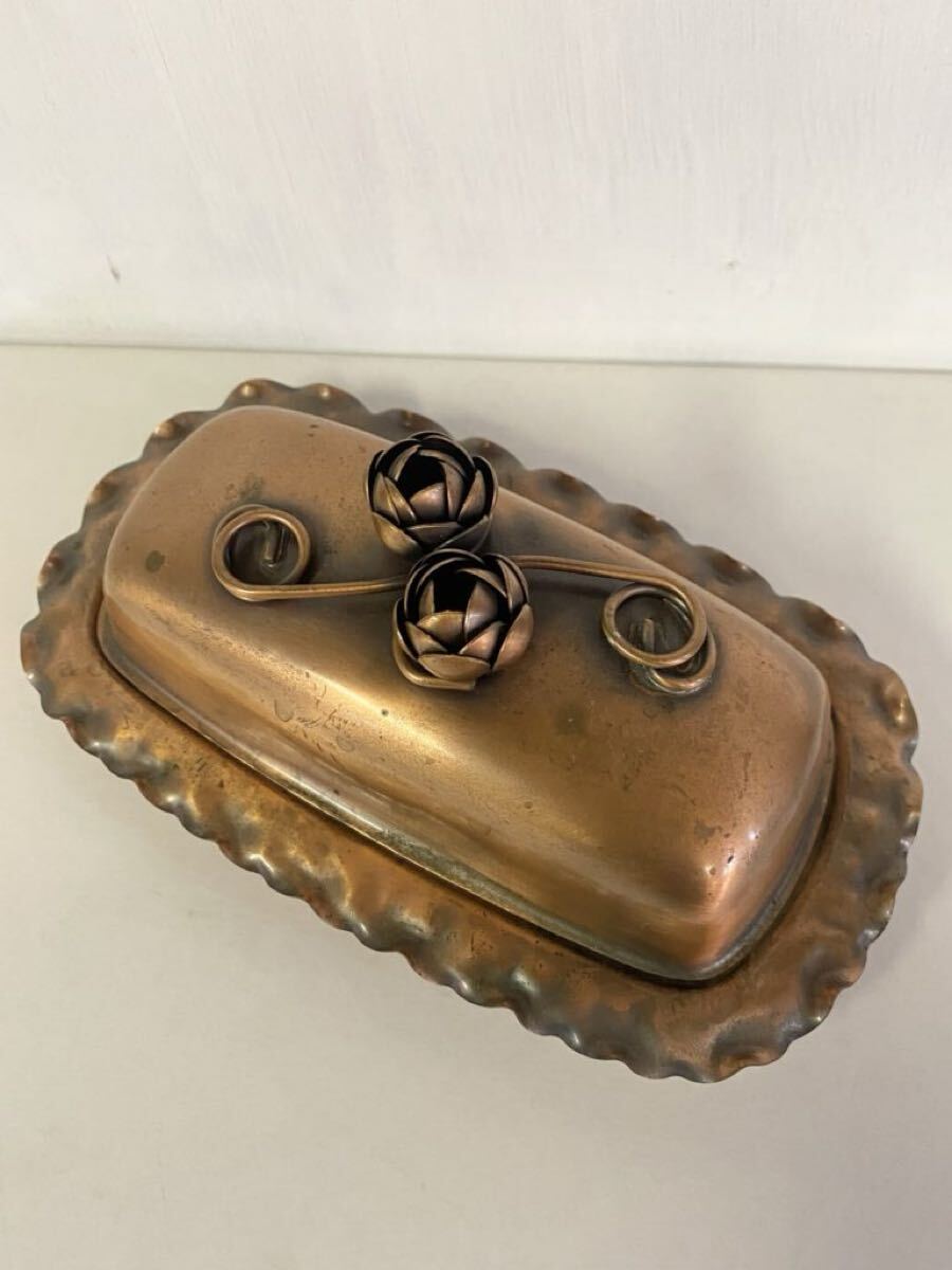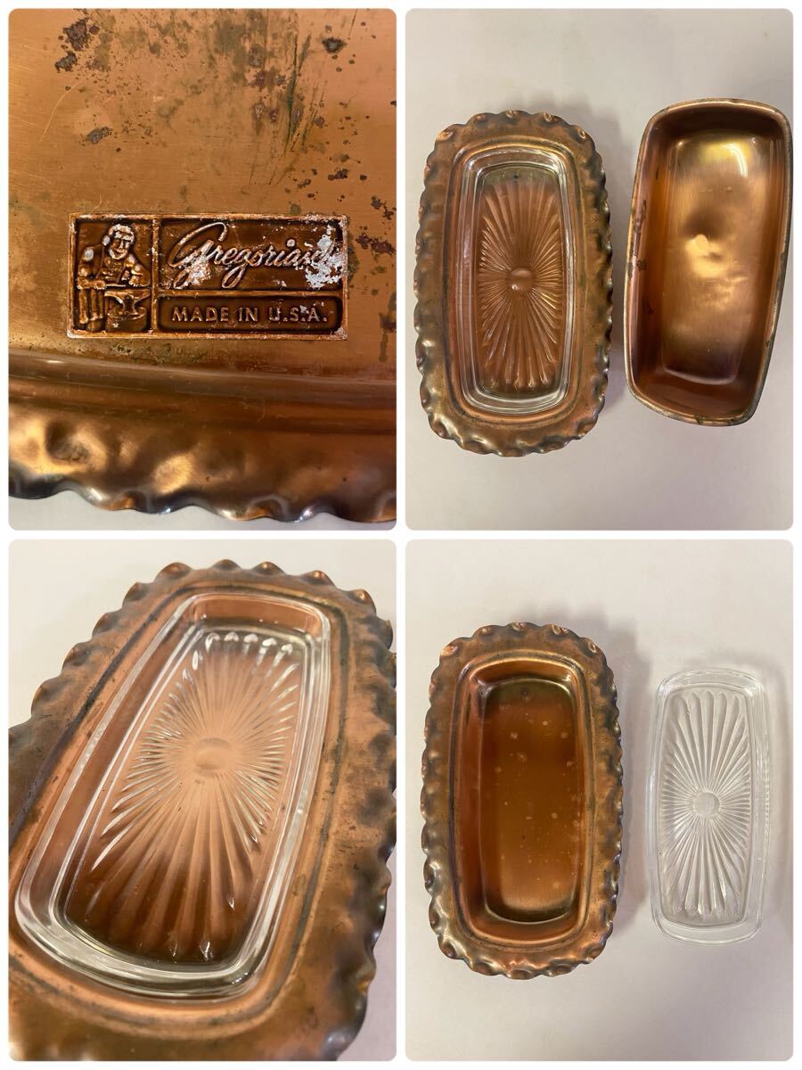 1960年代~、GREGORIANのバターケースです。 数多くの銅細工製品を世に送り出したGregorian Copper。 美しい細工に銅の鈍い輝きが魅力の一品。 中にガラス皿が入ります。 バターケースだけでなく、ジュエリーケースや灰皿としてもオススメです。 【サイズ】 高さ85mm 幅198mm 奥行き90mm 【状態】 小傷や細かな汚れ、銅のくすみなどございますが、目立つようなダメージはございません。 商品No:z00787 |