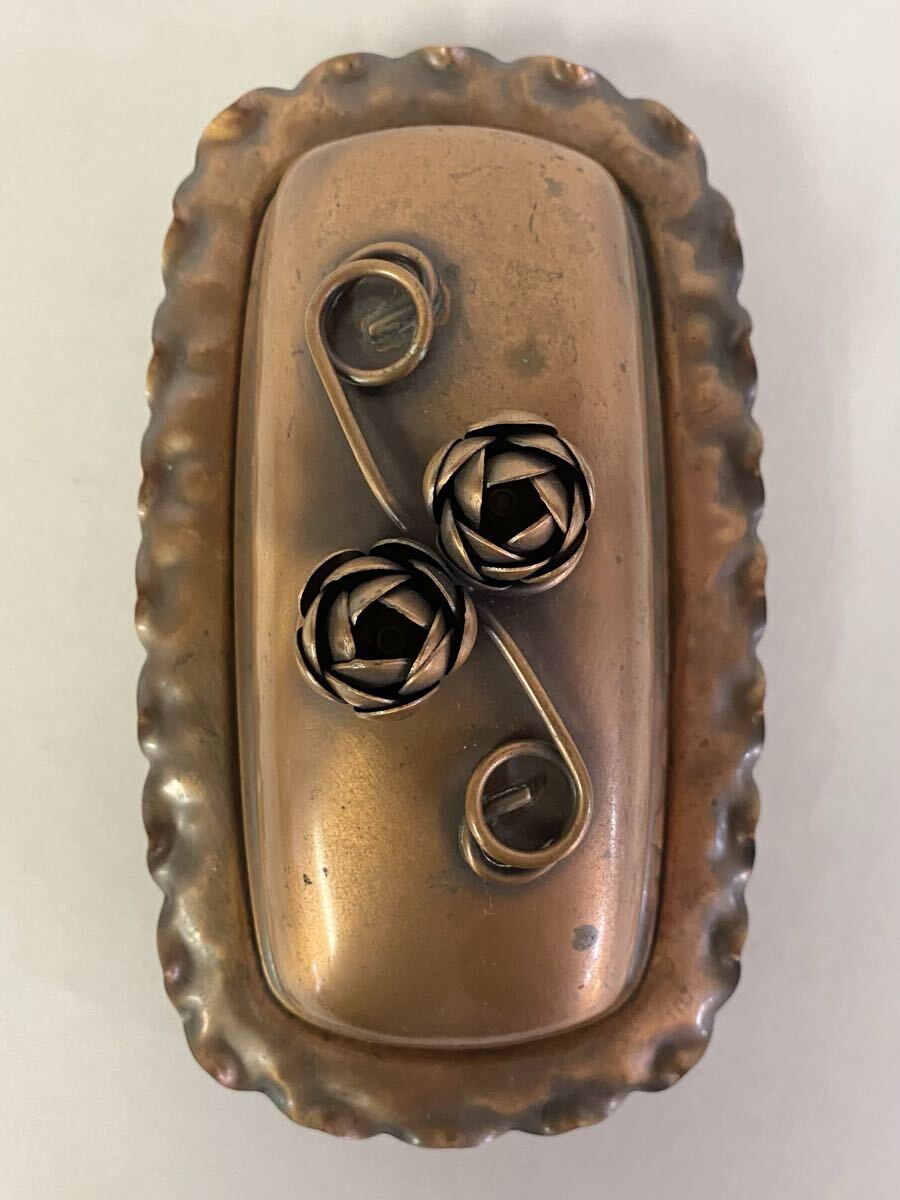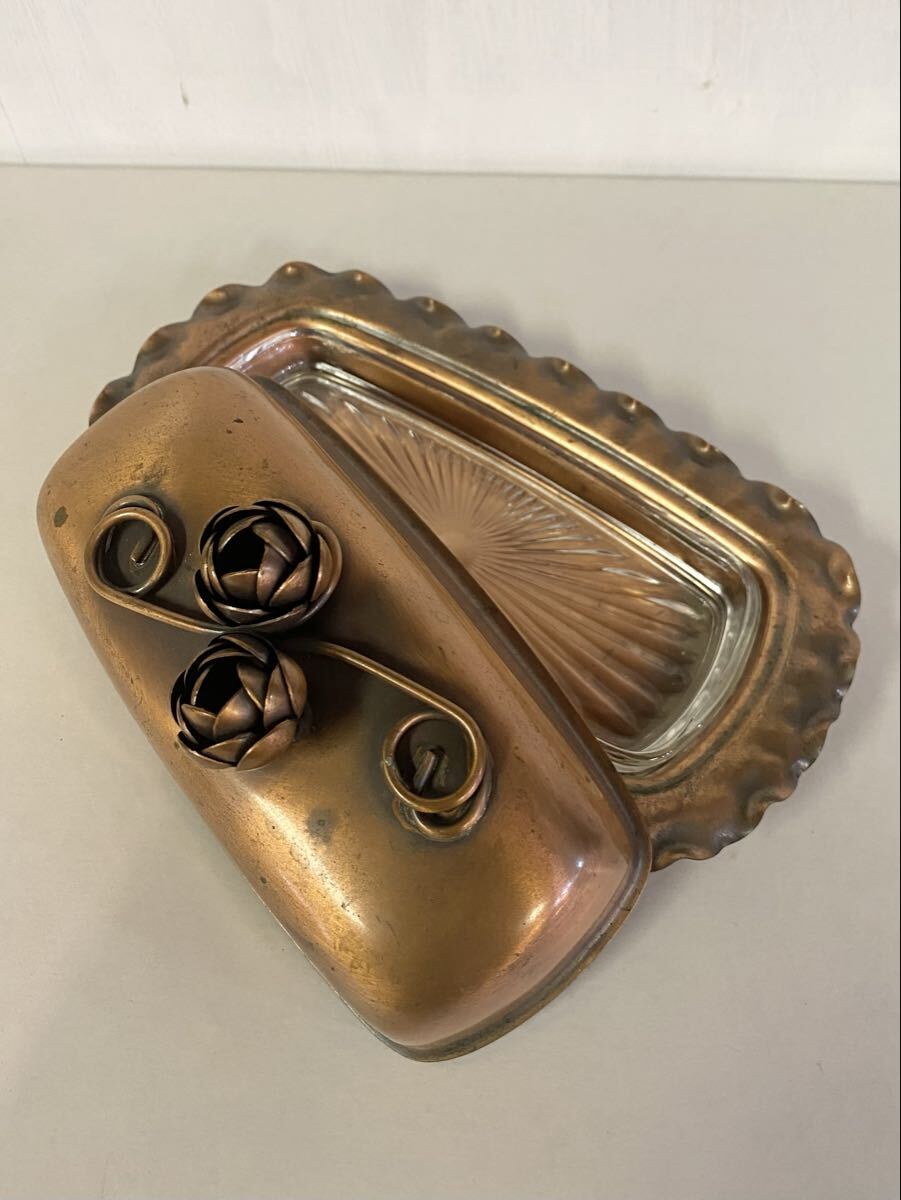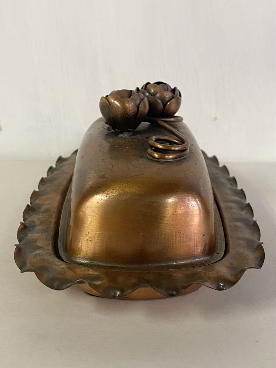 1960年代~、GREGORIANのバターケースです。 数多くの銅細工製品を世に送り出したGregorian Copper。 美しい細工に銅の鈍い輝きが魅力の一品。 中にガラス皿が入ります。 バターケースだけでなく、ジュエリーケースや灰皿としてもオススメです。 【サイズ】 高さ85mm 幅198mm 奥行き90mm 【状態】 小傷や細かな汚れ、銅のくすみなどございますが、目立つようなダメージはございません。 商品No:z00787 |