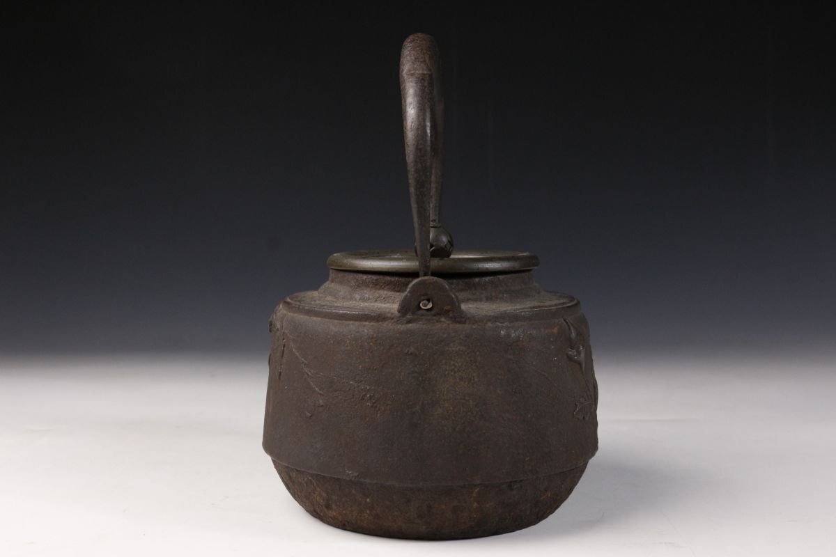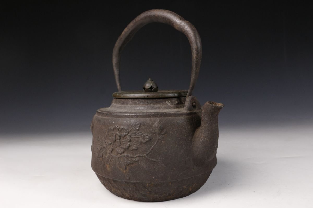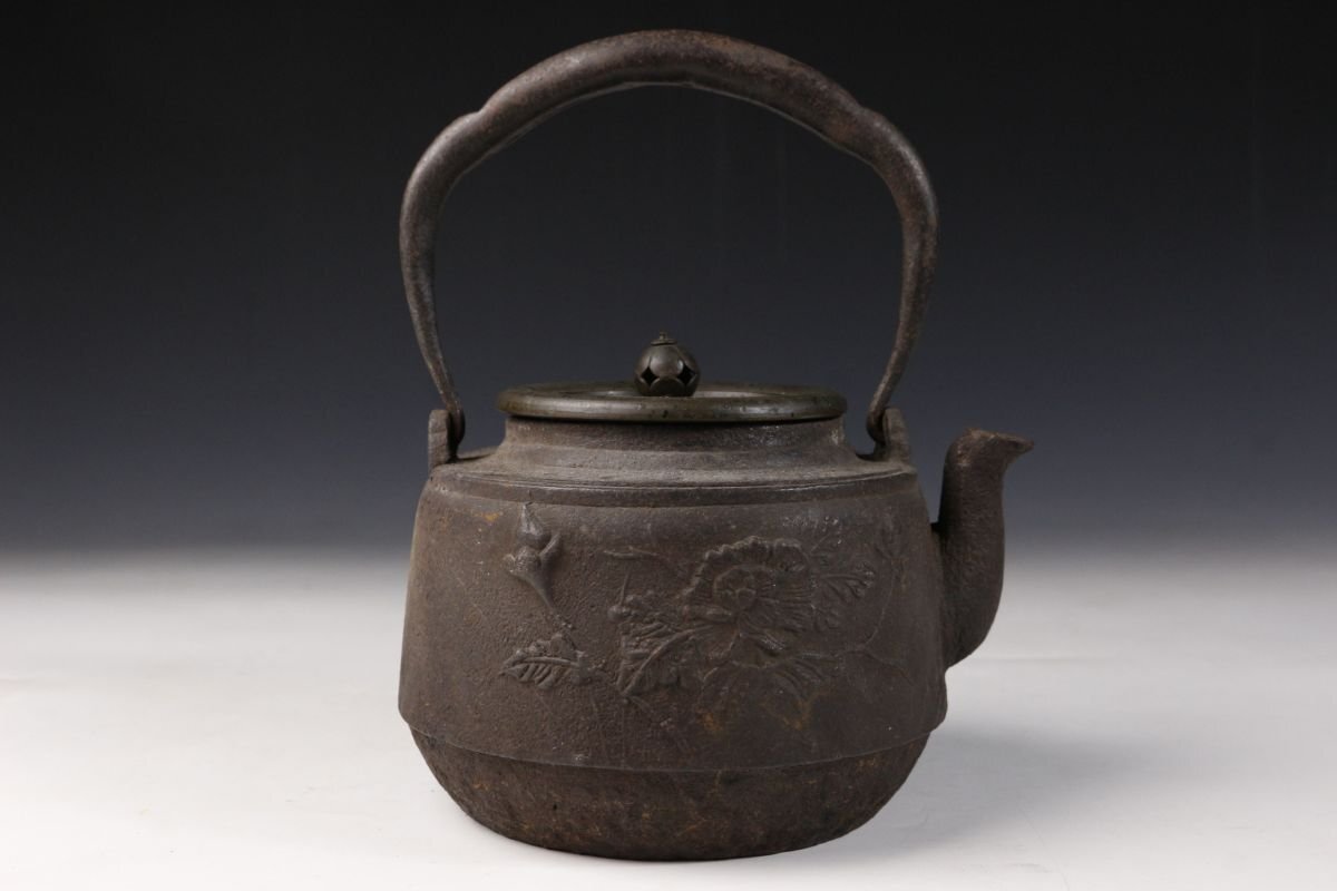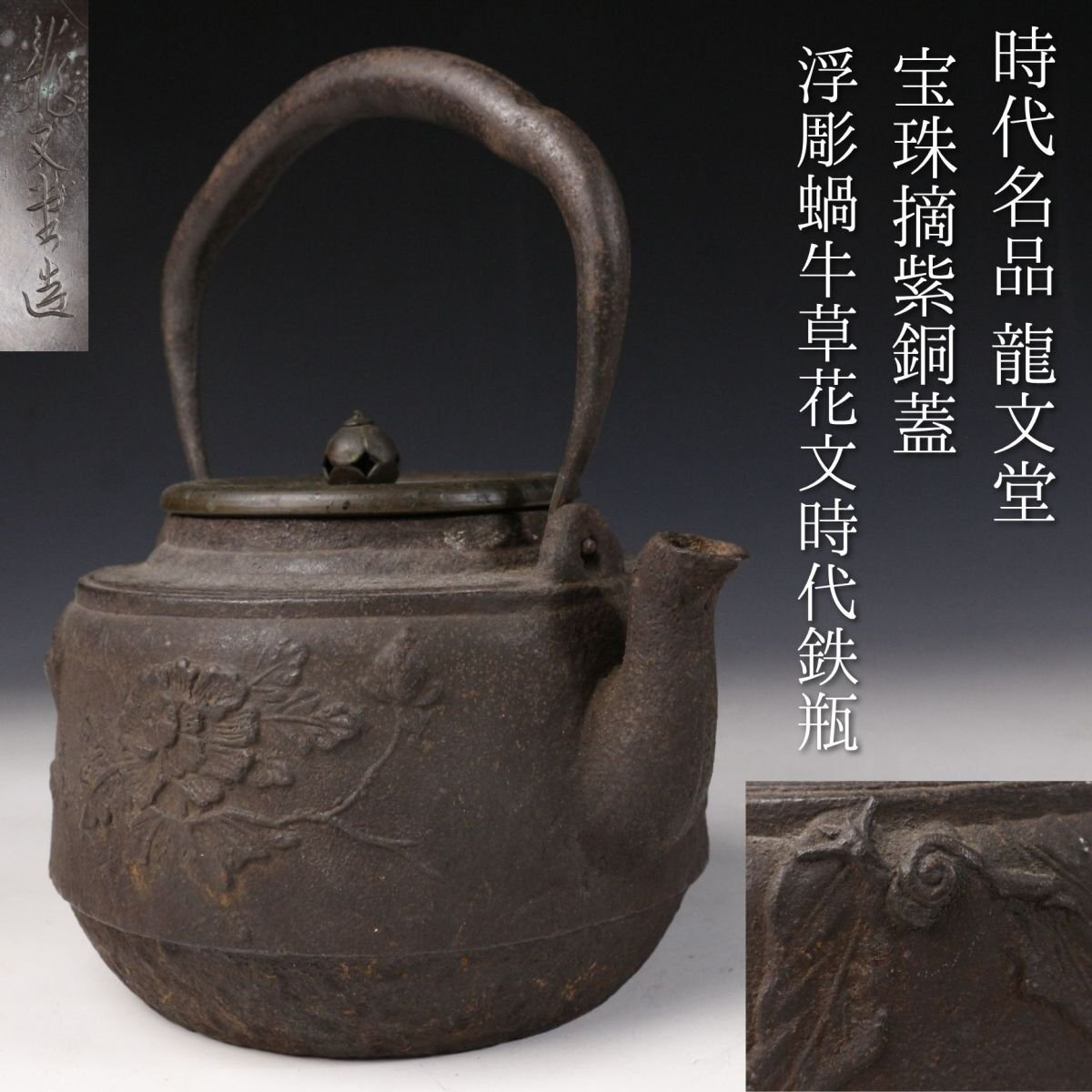* * * 商品詳細 * * * ここでしか出逢うことのできない唯一の美をご紹介させて頂きます。 龍文堂の手による浮彫蝸牛草花文 時代鉄瓶でございます。 静かに佇む草花の中に、ふと現れる一匹の蝸牛。 その愛らしくも詩的な姿は、自然と共にある暮らしの情景を想起させ、 使う者の心に静かな喜びを灯します。 胴部には、繊細な浮彫技法で描かれた草花が広がり、 その間をゆっくりと這う蝸牛の姿は、まるで時を忘れたかのよう。 控えめながらも豊かな表情を持つその意匠には、 “侘び寂び”の美意識が見事に表現されています。 蓋摘みや口造りにも気品が漂い、茶の湯の道具としてはもちろん、 四季折々の床飾りや静物としても映える逸品でございます。 時代を経た鉄肌の味わいと、自然へのまなざしが宿る造形美。 日々の湯に、ひとしずくの詩情を添える、 龍文堂ならではの名品でございます。 ■サイズ/横15㎝×高19.5㎝×奥行13㎝ ■状態/ スレ、傷、汚れ、錆がございます。 ※水漏れはございません。 ※写真にてご確認、ご了承の上ご入札下さい。
