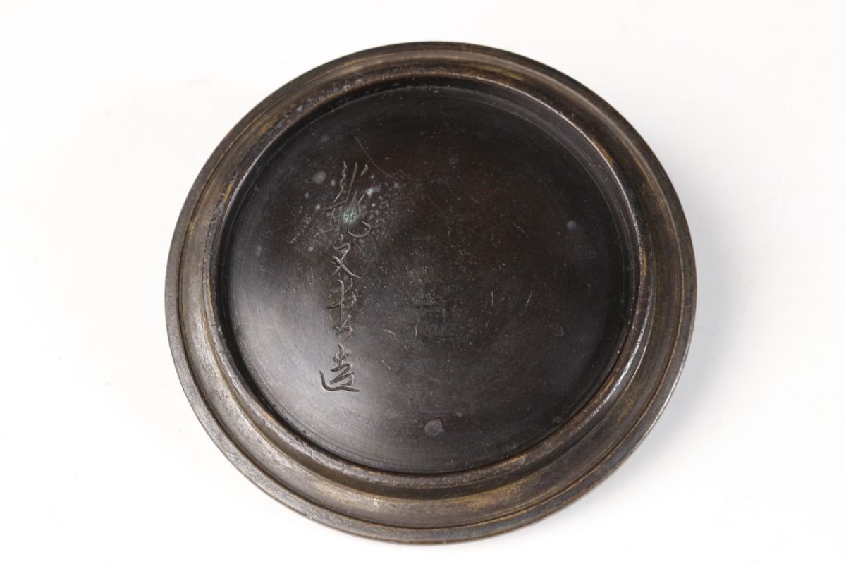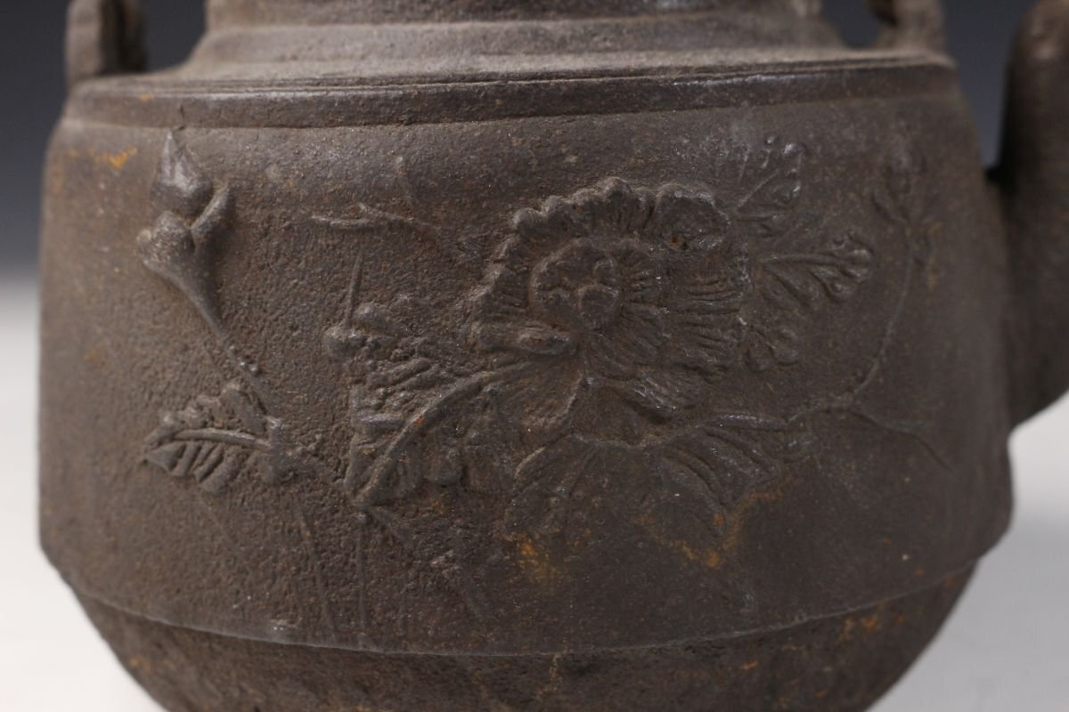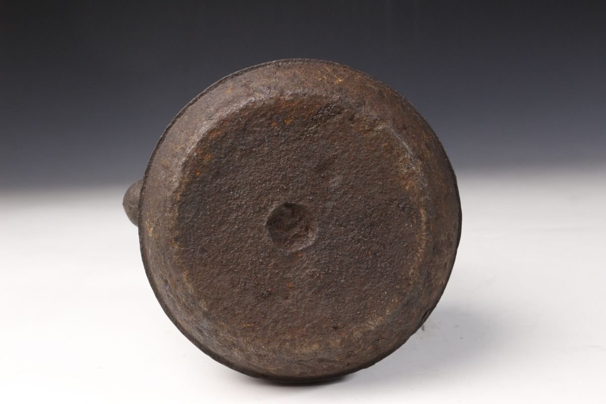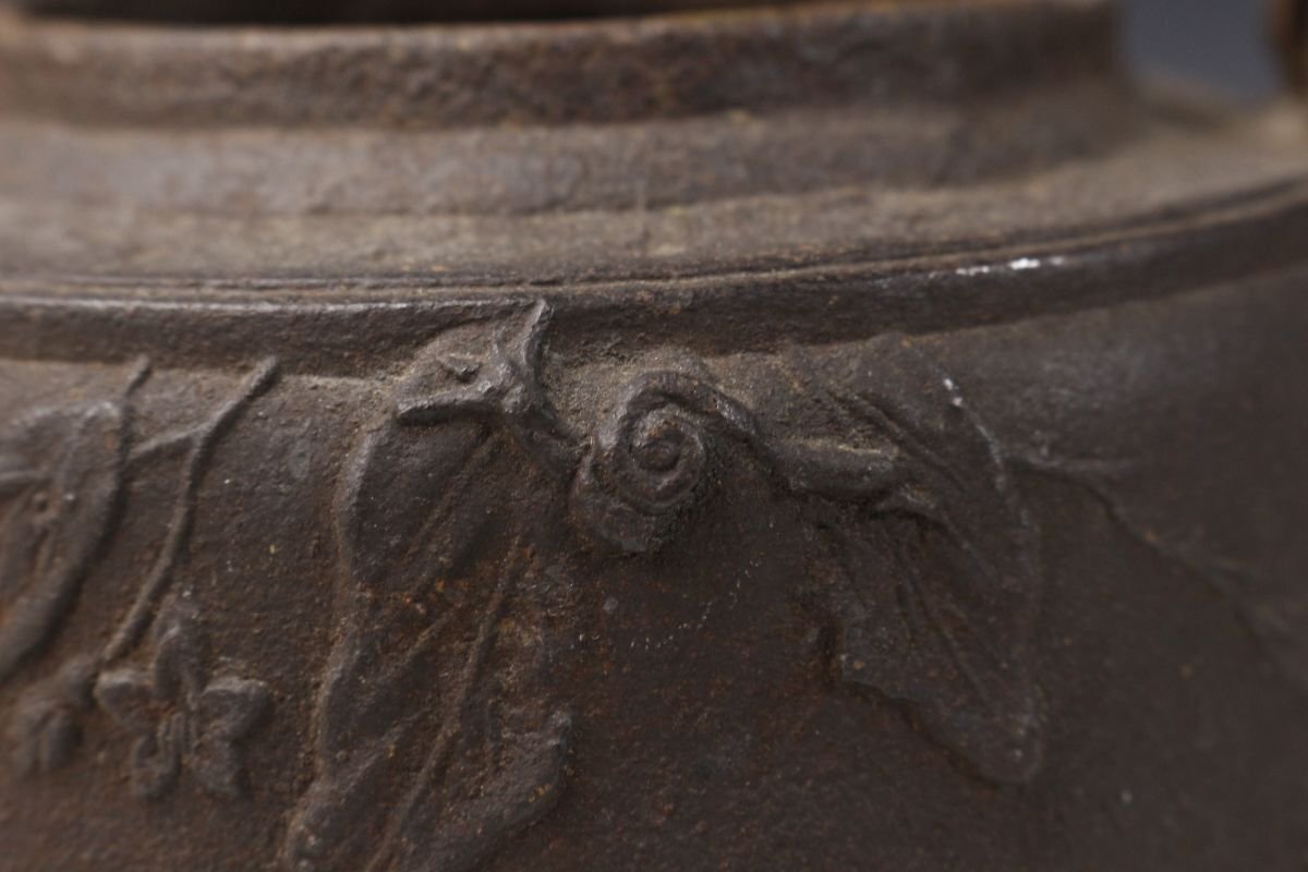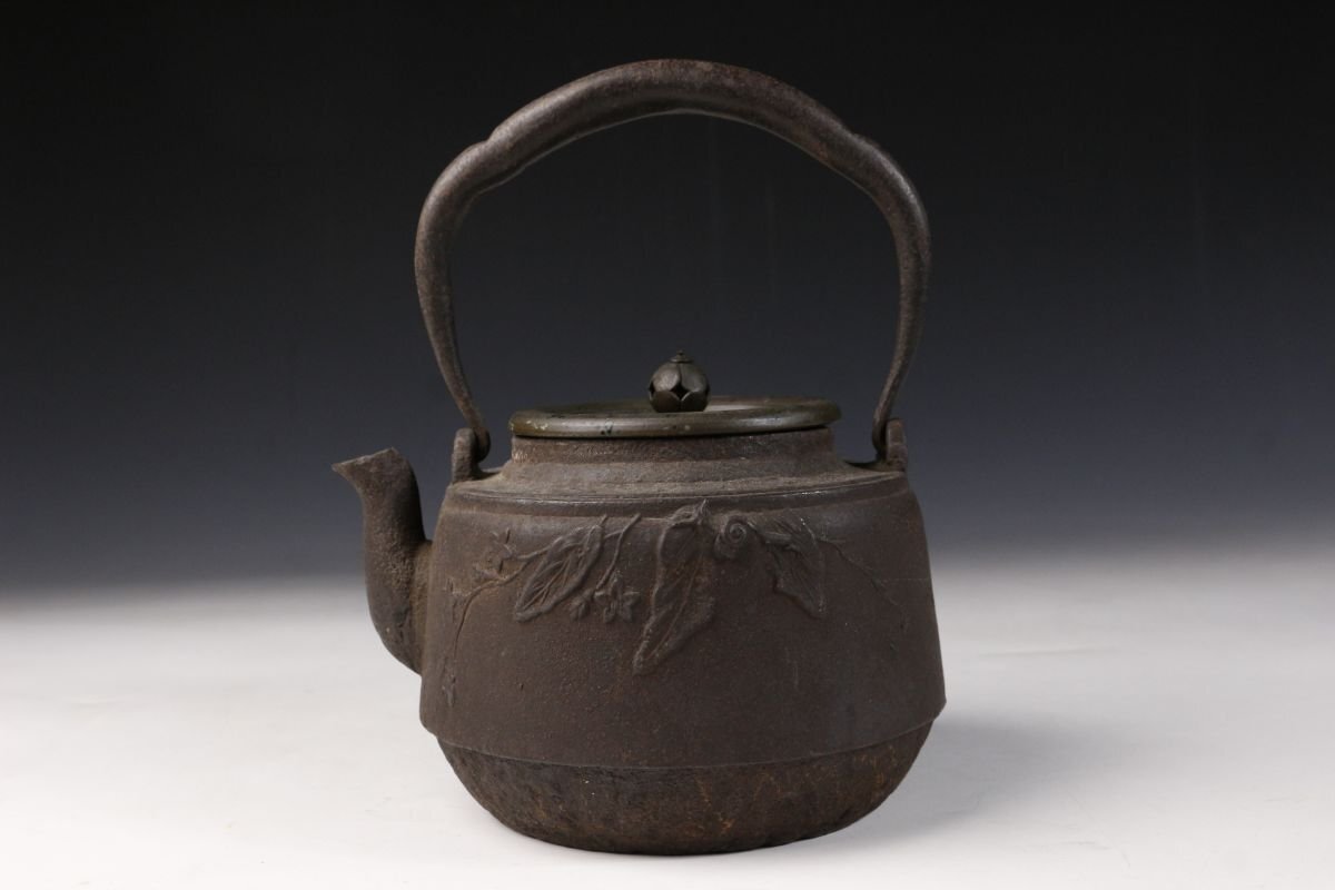* * * 商品詳細 * * * ここでしか出逢うことのできない唯一の美をご紹介させて頂きます。 龍文堂の手による浮彫蝸牛草花文 時代鉄瓶でございます。 静かに佇む草花の中に、ふと現れる一匹の蝸牛。 その愛らしくも詩的な姿は、自然と共にある暮らしの情景を想起させ、 使う者の心に静かな喜びを灯します。 胴部には、繊細な浮彫技法で描かれた草花が広がり、 その間をゆっくりと這う蝸牛の姿は、まるで時を忘れたかのよう。 控えめながらも豊かな表情を持つその意匠には、 “侘び寂び”の美意識が見事に表現されています。 蓋摘みや口造りにも気品が漂い、茶の湯の道具としてはもちろん、 四季折々の床飾りや静物としても映える逸品でございます。 時代を経た鉄肌の味わいと、自然へのまなざしが宿る造形美。 日々の湯に、ひとしずくの詩情を添える、 龍文堂ならではの名品でございます。 ■サイズ/横15㎝×高19.5㎝×奥行13㎝ ■状態/ スレ、傷、汚れ、錆がございます。 ※水漏れはございません。 ※写真にてご確認、ご了承の上ご入札下さい。