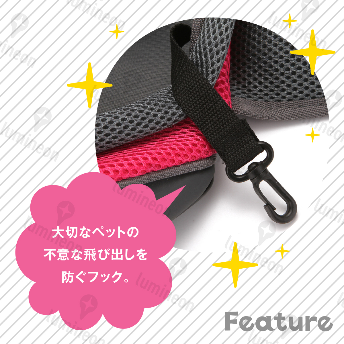 不意の飛び出しを防ぐフック付き。