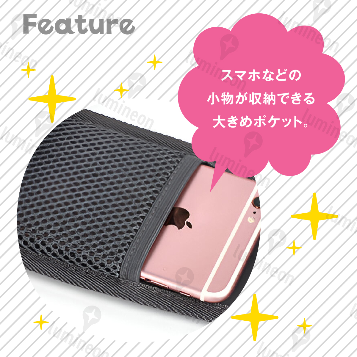 スマホ等を収納できる大きめのポケットもポイント。