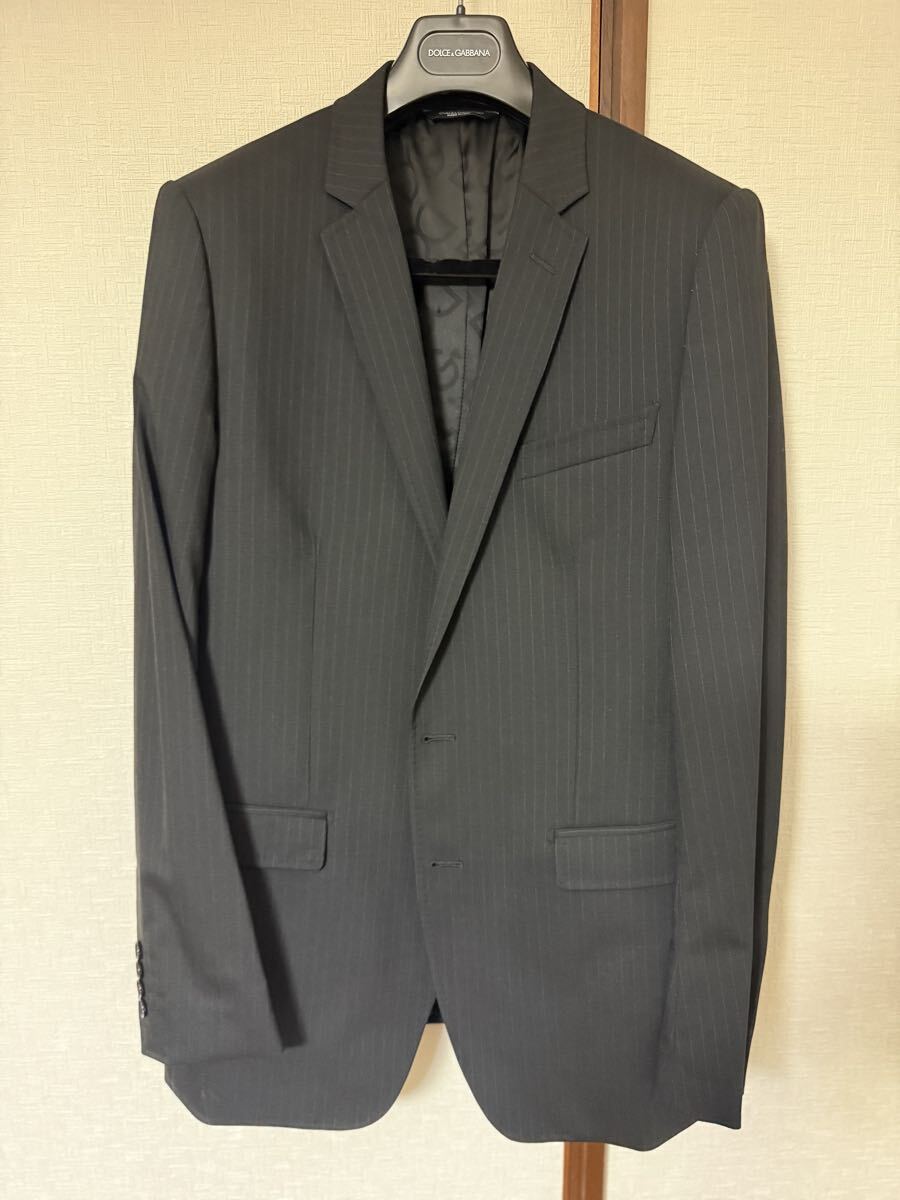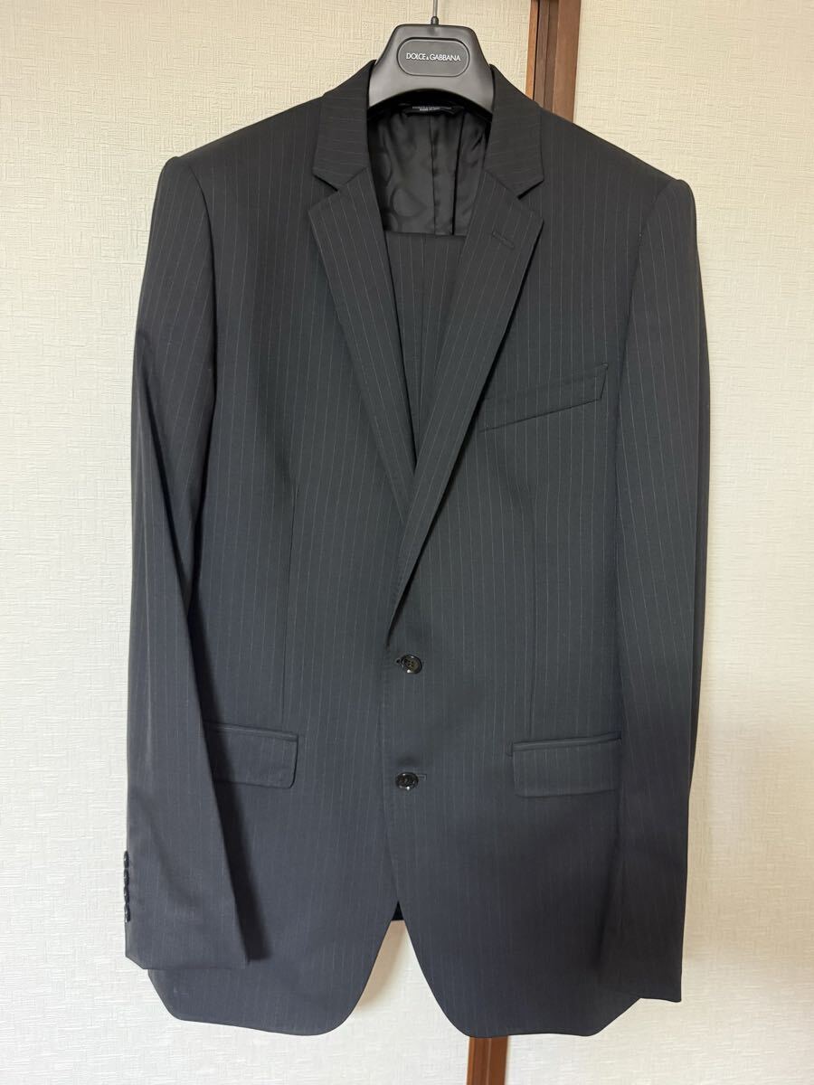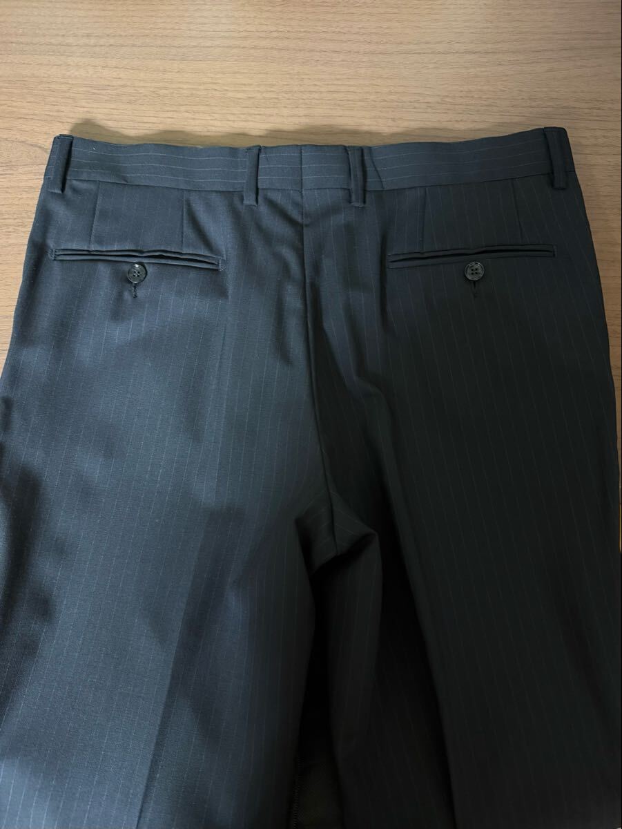 ストライプデザインのブラックフォーマルスーツ、ウール混紡素材で高級感があります。