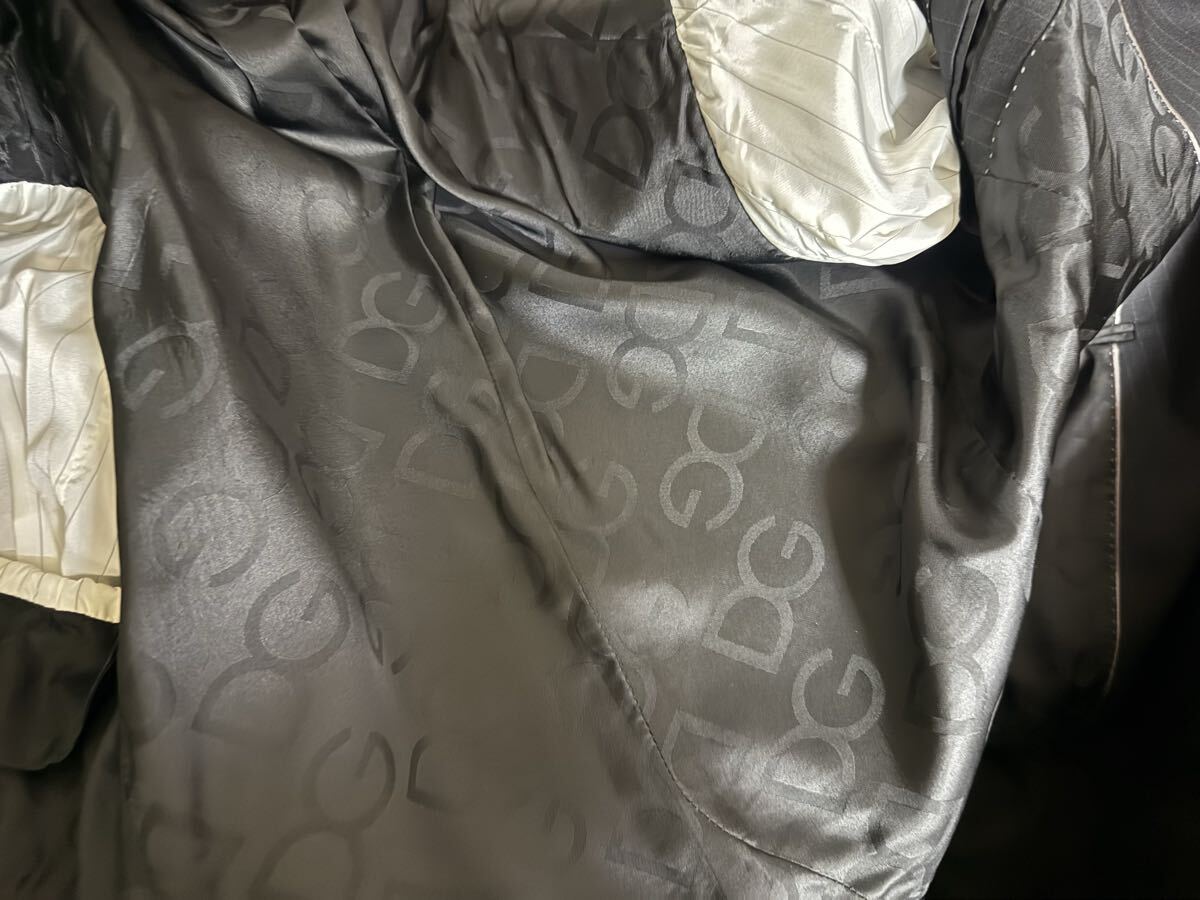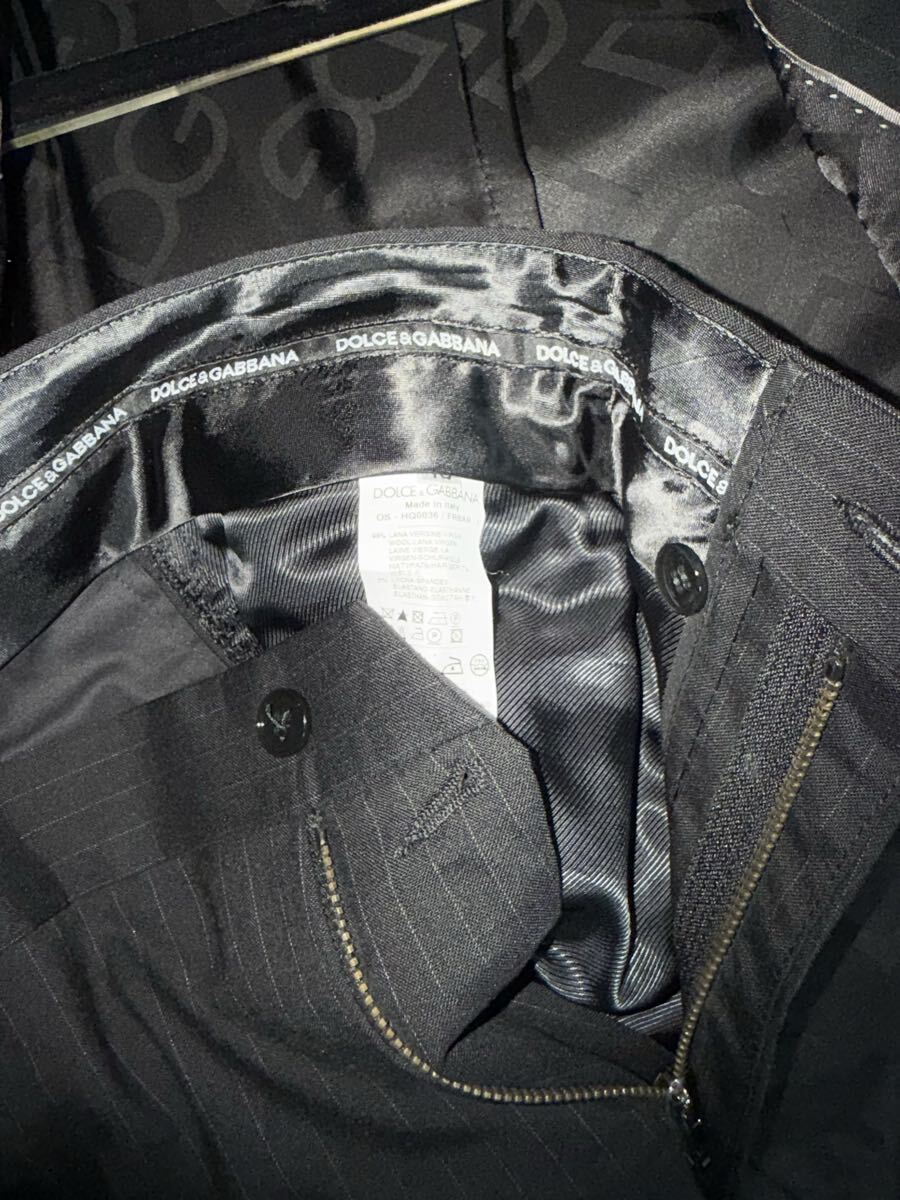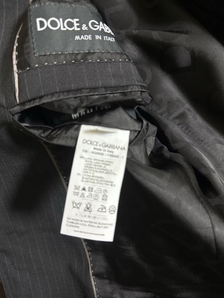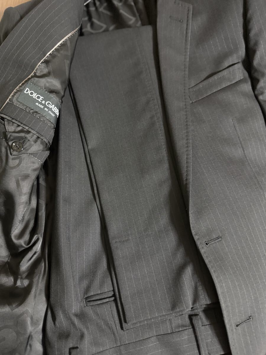 ストライプデザインのブラックフォーマルスーツ、ウール混紡素材で高級感があります。