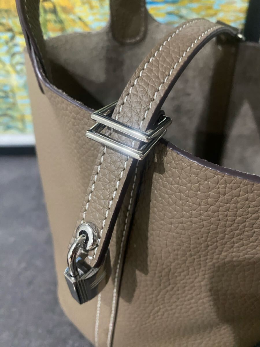 ■糸について 製造過程の熱処理にも耐え、変質や糸切れ・目とびの起こりにくいバッグ専用の糸を使用しております。また菱縫いは耐久性に優れるため、長くお使いいただけます。
