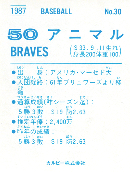 【未使用品】カルビー1987 アニマル(阪急) レギュラーカード #30