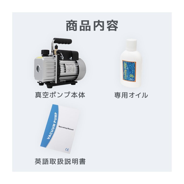 小型で使いやすい電動真空ポンプです。 カーエアコン、家庭用エアコンの真空引きに対応できます。 オイル逆流防止機能がついているのであらゆる冷媒に対応しており、幅広い用途に使えます。 R12、R22、R134a、R502などに対応。 【仕様】 ローター方式:シングルステージ式 到達真空度:75ミクロン(10pa) 排気速度:30 l/min(50Hz)、36 l/min(60Hz) 電源:AC100V(AC110V) 50Hz/60Hz 消費電力:120W 回転数:1440rpm(50Hz)、1720rpm(60Hz) 吸気口径:1/4"フレア(UNF7/16-20) サイズ:W115×D240×H230mm 重量:約6kg 逆流防止:あり イル封入量:160ml 【内容】 本体 真空ポンプオイル 英文取扱説明書 (真空ポンプ エアコン 電動真空ポンプ 小型 シングルステージ 冷媒 エアコン クーラー 真空引き 真空 ポンプ 電動 自動車 カーエアコン ルームエアコン 修理 人気 おすすめ ) |