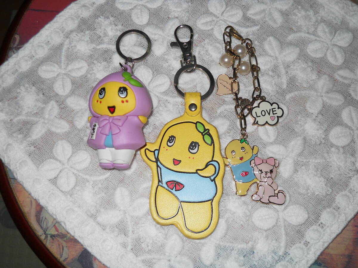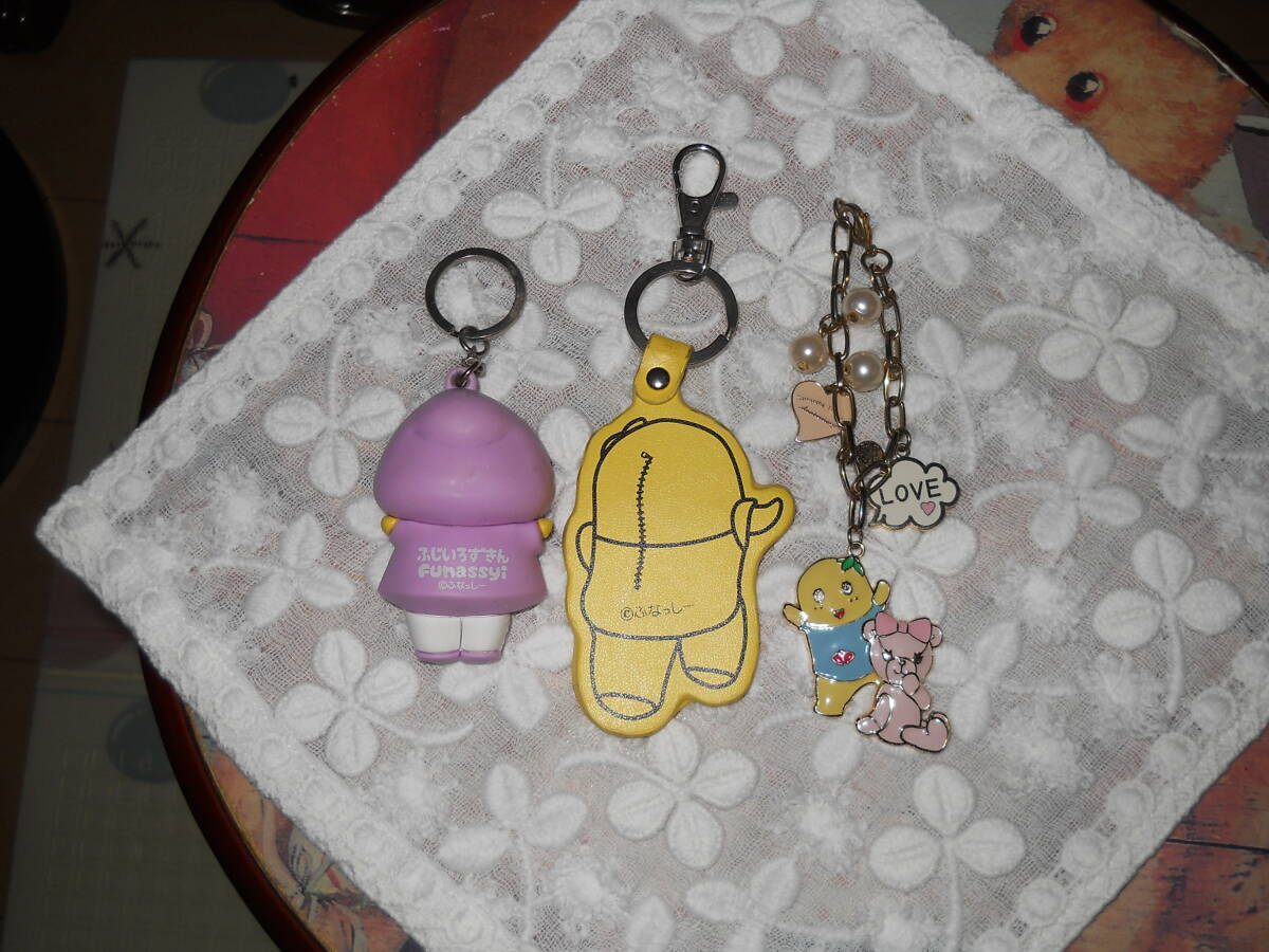 ふじいろずきんふなっしーマスコット(6、5㎝位)、ふなっしー型キーホルダー(淵部分に少し汚れあり)、サマンサタバサとコラボしたキーホルダーは新品です。