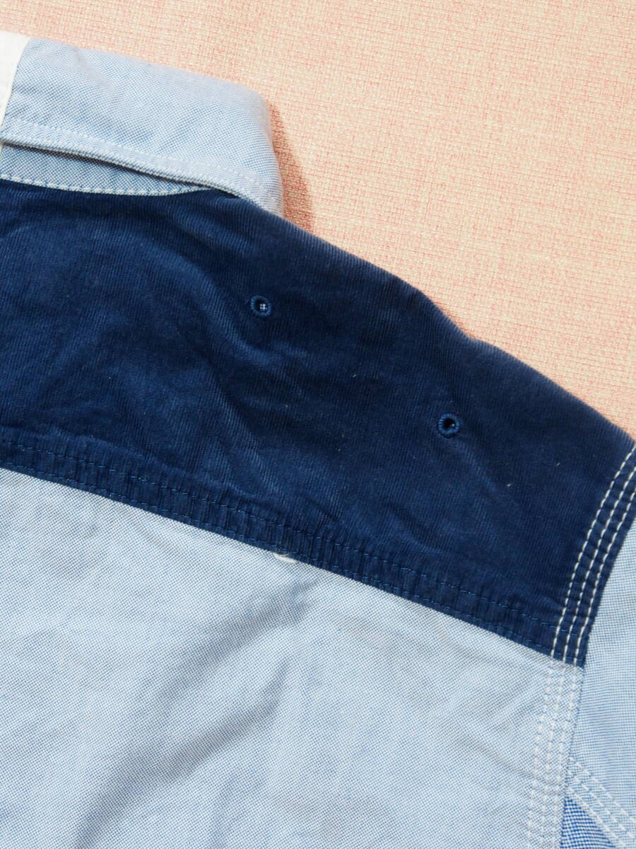 コラボレーションしたシャツです。サックスブルーのボタンダウン生地に、
