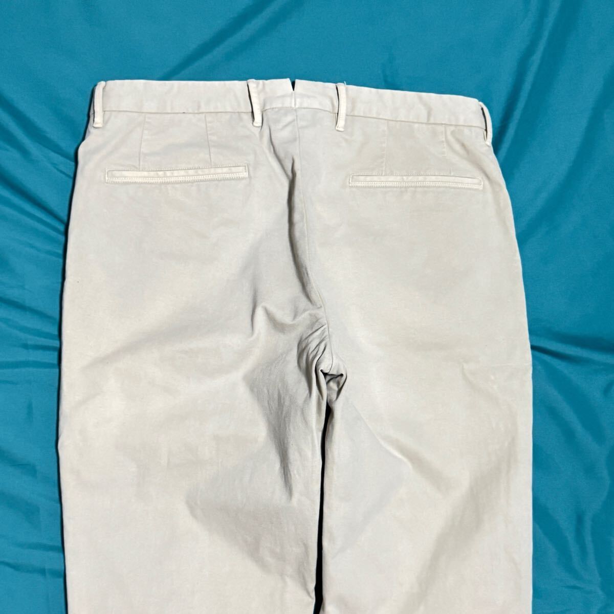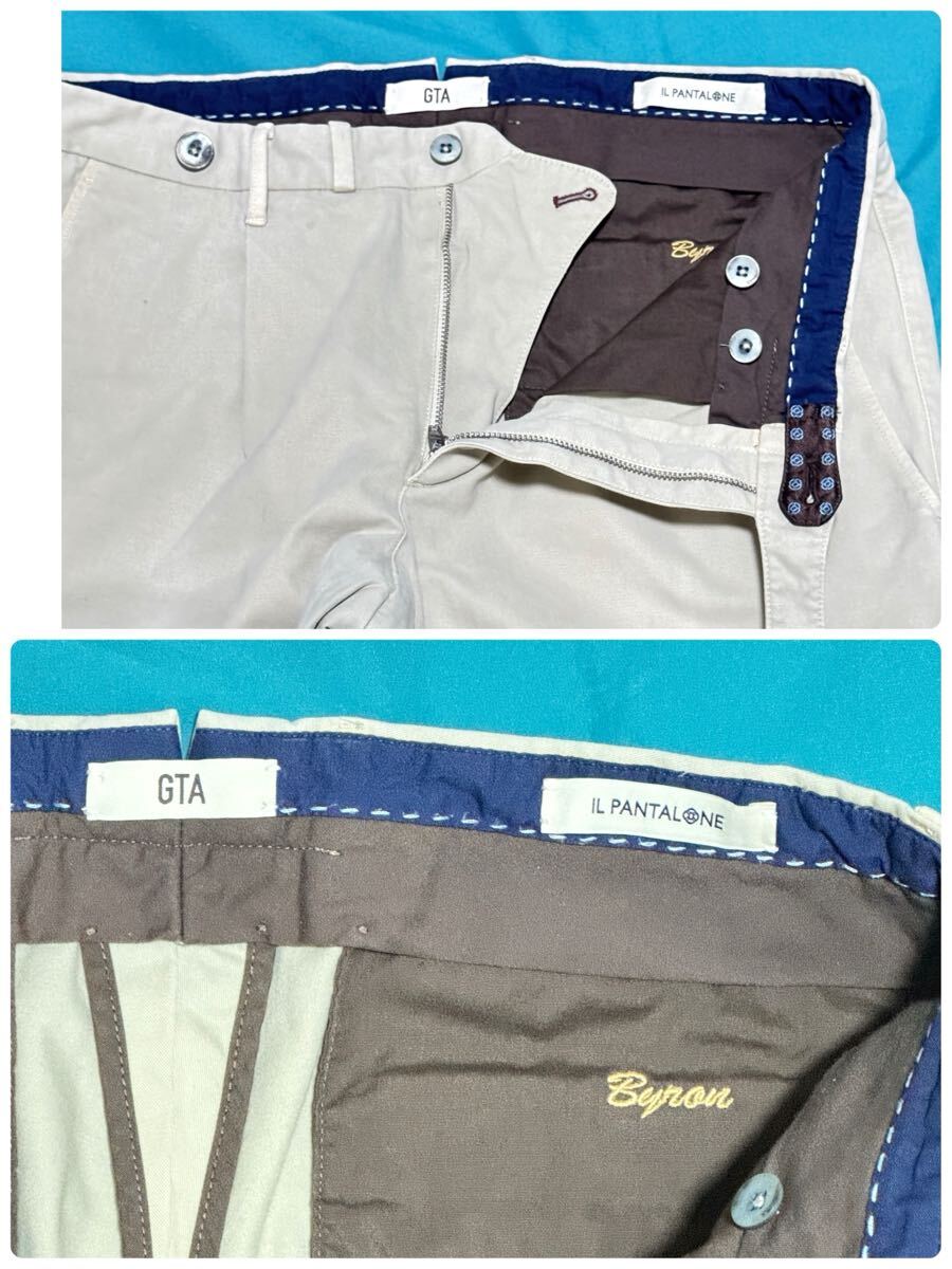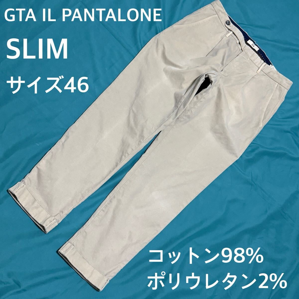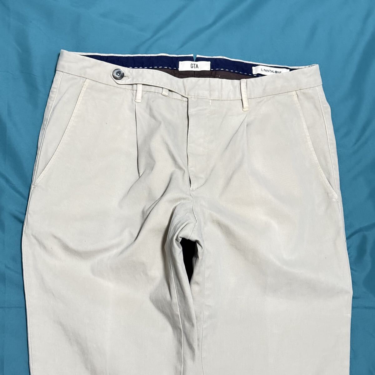 イタリアブランド「GTA」の人気モデル、IL PANTALONEスリムチノパンツです。サイズ46、ベージュカラー。上質なコットン98%・ポリウレタン2%素材で、快適な穿き心地と美しいシルエットを実現。裾はダブル仕上げでロールアップスタイルも可能。ビジネスからカジュアルまで幅広く活躍できる一本です。薄いシミはありますが、全体的に良好なコンディションです。