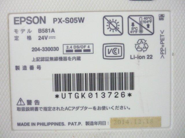 ★EPSON/エプソン★A4モバイルインクジェットプリンター★PX-S05W★印刷枚数4290★ACアダプター欠品★インク残量少★現状渡し★a2314