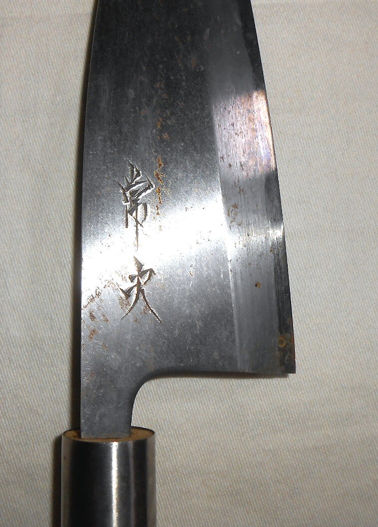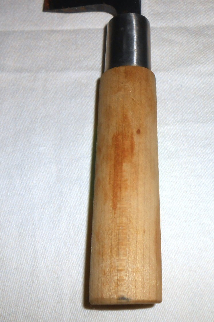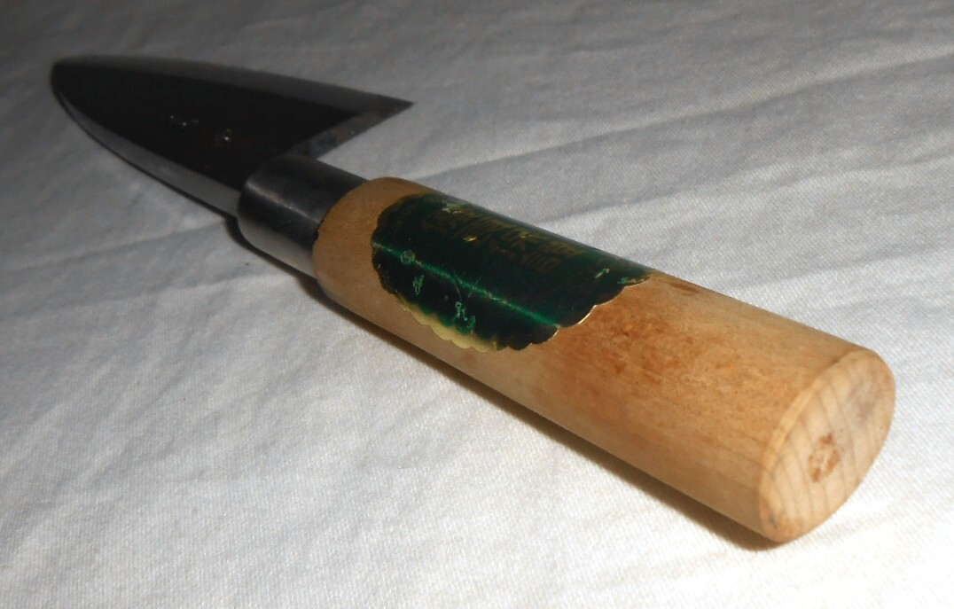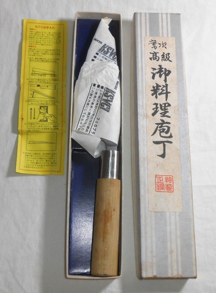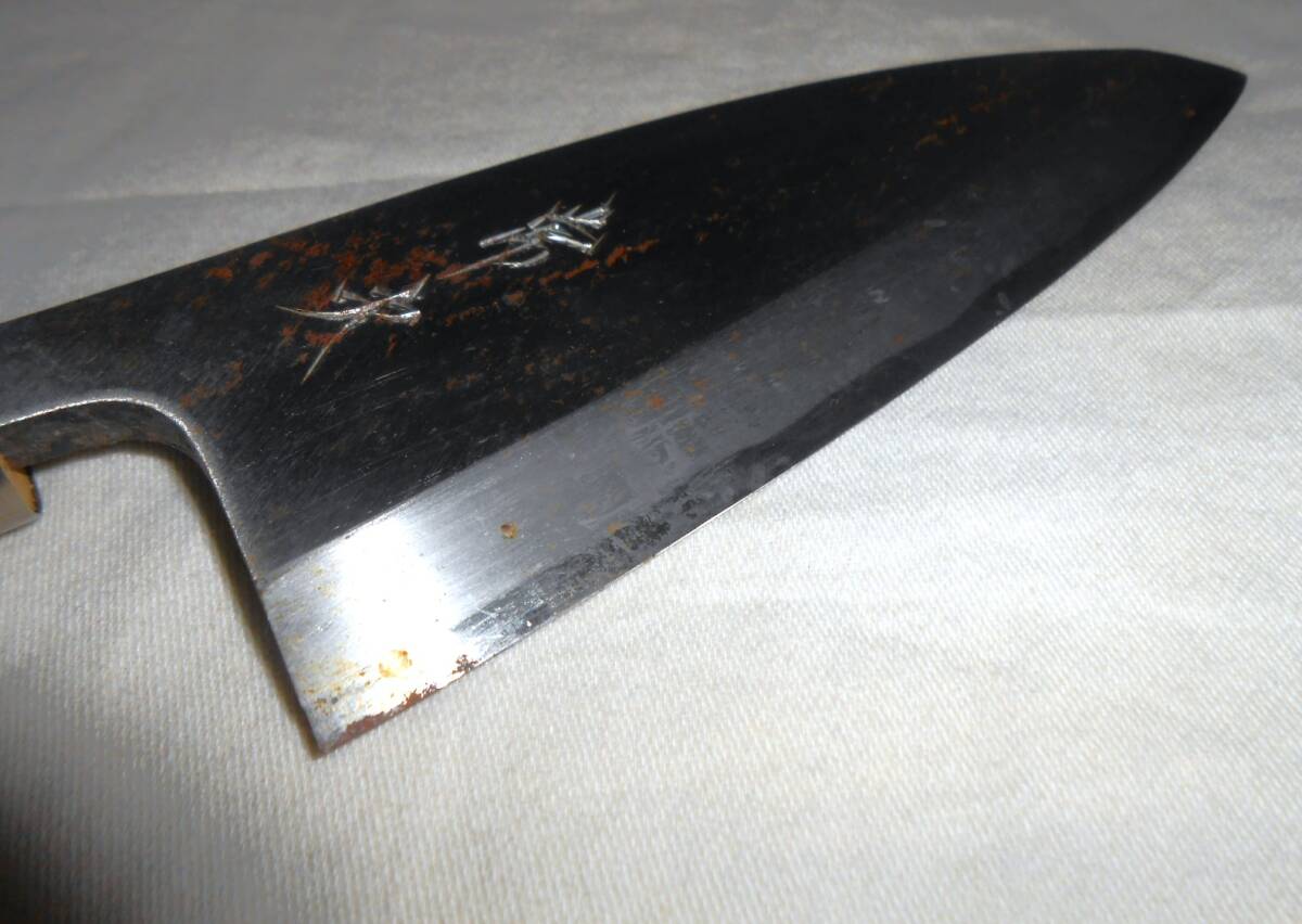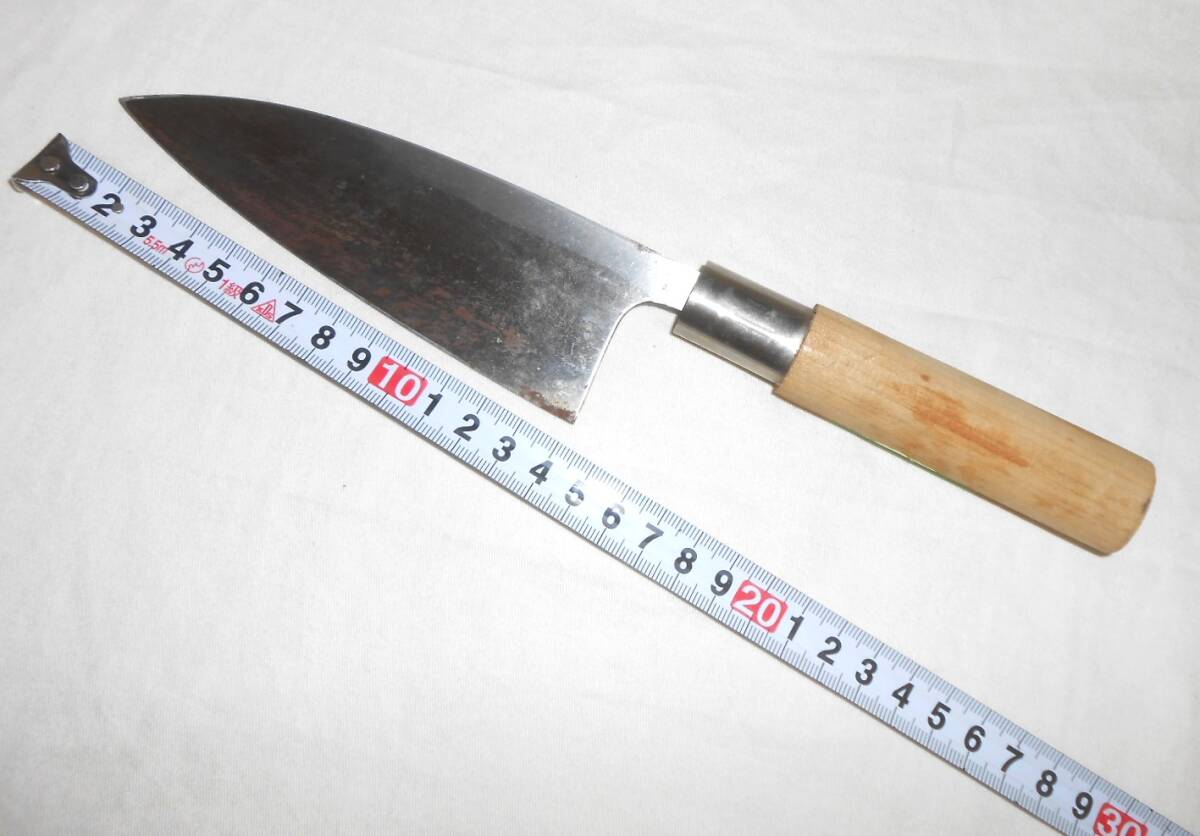 箱入保管品であまり使われた形跡は見られませんが、経年のためか刃先等に錆の出た部分があり、持ち手木材にもシミのようなものがあります。ちょっと研いでいただければ、使用は全く問題ないと思います。箱はシミや汚れ等あります。刃渡り約14cm、持ち手部分も含めて全長約26,5cm、重量約193gです。