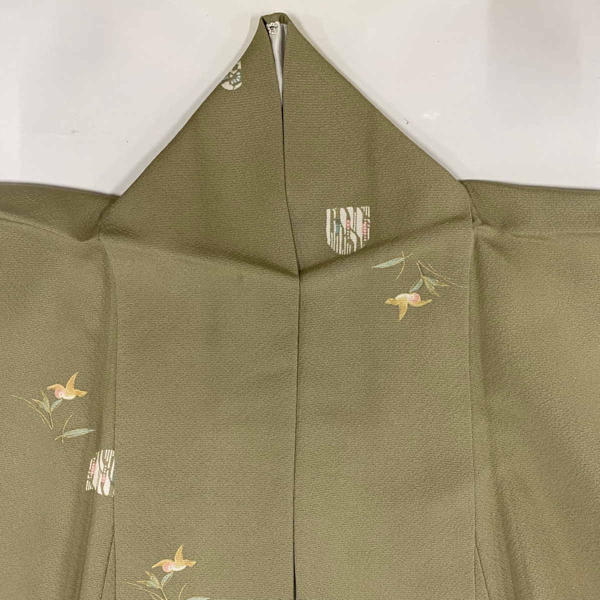 | 小紋 美品 秀品 葉柄 鳥 灰緑 袷 身丈172 裄丈66 M 正絹 【中古】 |