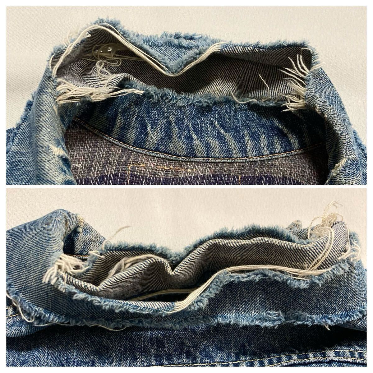 襟に大きなダメージ、袖先に解れやダメージ、内側ブランケットの破れ、細かいステッチ抜けが多数あります。