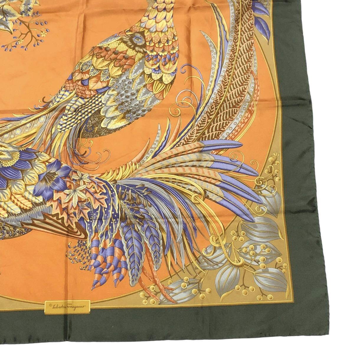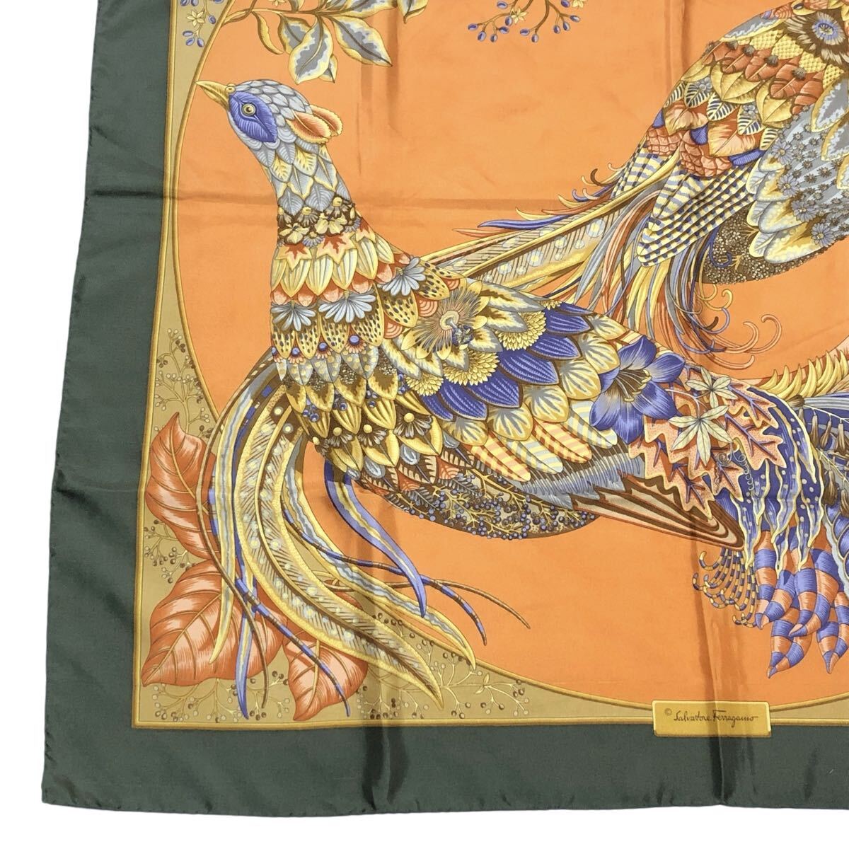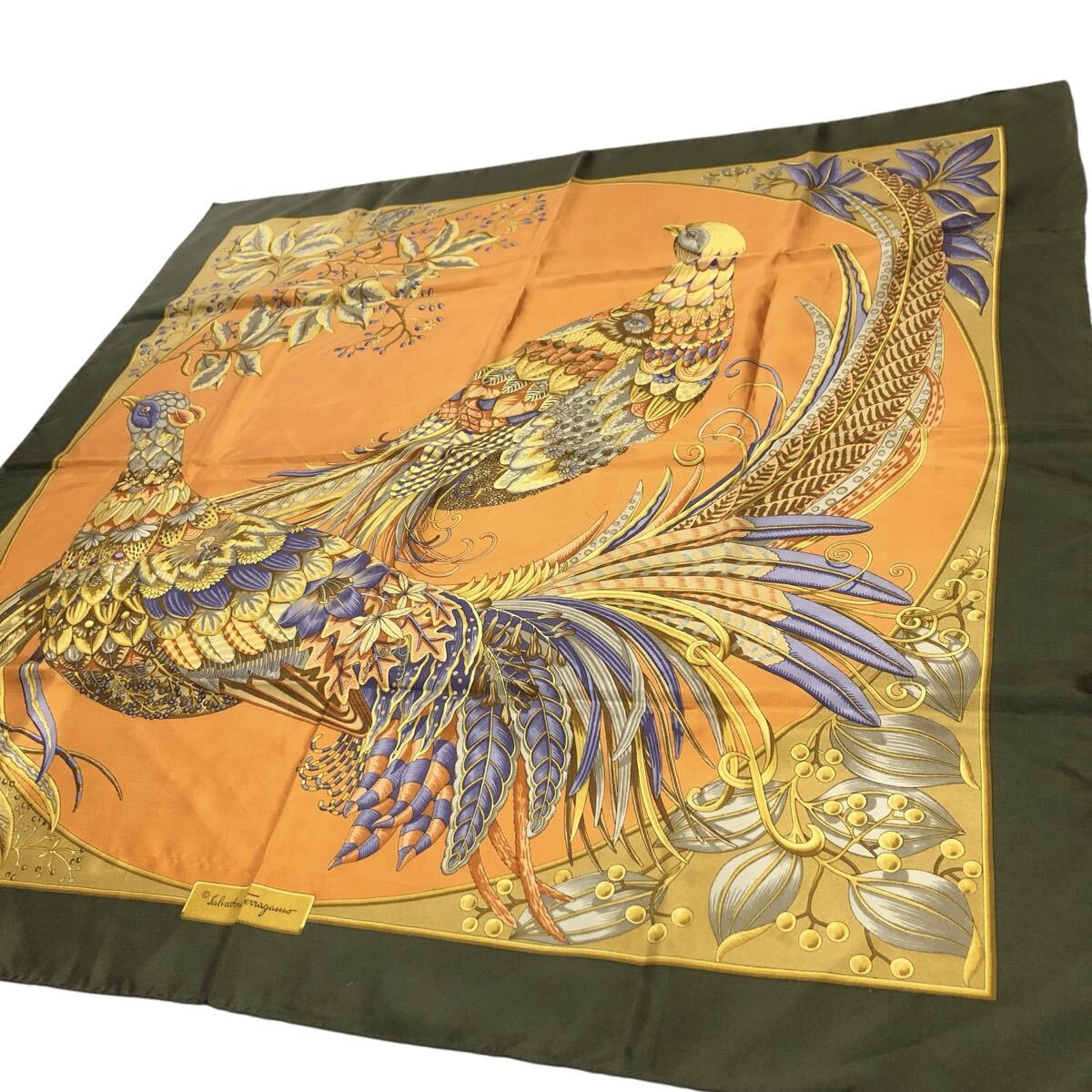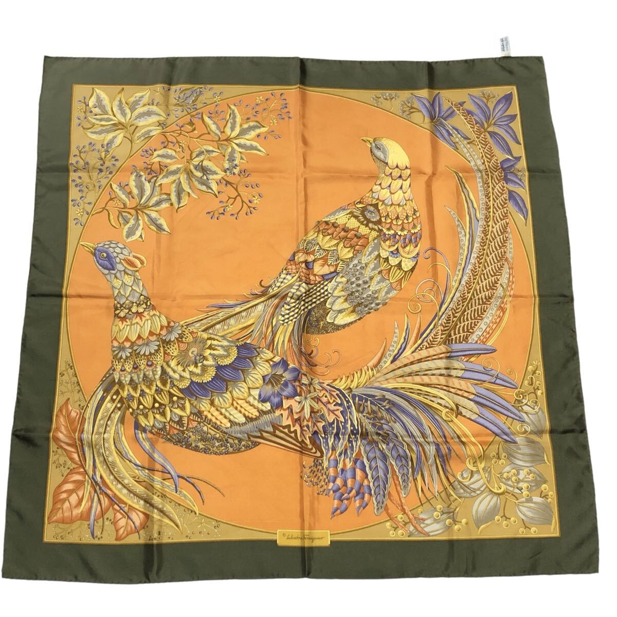 良品【フェラガモ】本物 Ferragamo 孔雀模様 鳥 大判スカーフ 88cm×86cm シルク100% ストール ショール マフラー メンズ レディース 伊製