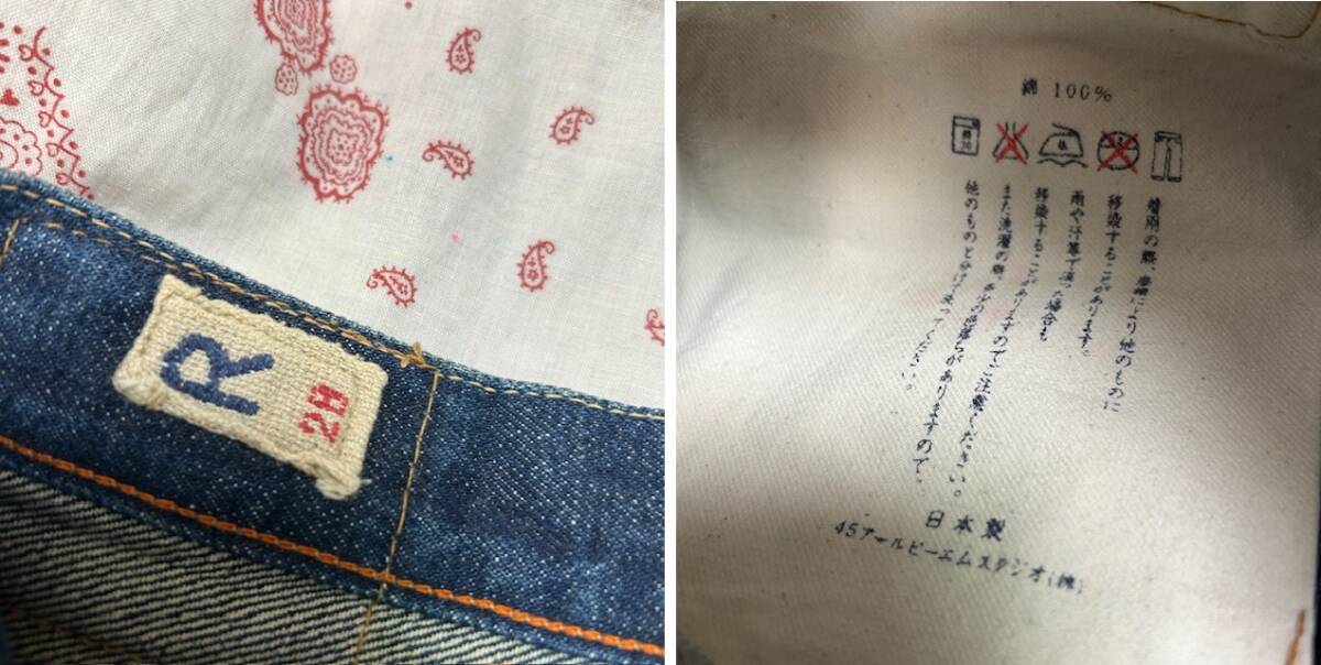 ●商品説明・・・90年代~00年代前半頃のオールドの45rpmの赤ミミセルヴィッジデニムのリーバイスで言う501xxタイプのデニムパンツです。ストレートシルエットです。仕様としてはセルヴィッジデニム・Vステッチ・隠しリベット・ボタンフライ・革パッチなどです。アタリので始めたしっかり濃紺よりの濃いインディゴ色(気持ち緑がかったようなヴィンテージデニム感の有る色合い)のこれから履き込んでいただけるデニムパンツです。日本製で、素材はコットンで、昔ながらのしっかりしたデニム生地です。サイズ表記は28で、今のXS程度のサイズ感で、小柄なメンズやレディースの方向けのサイズ感かと思います。裾はチェーンステッチです。