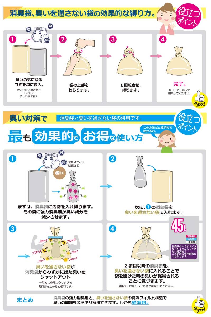 ●お部屋もゴミ箱も臭わない!病院や介護施設などにもおすすめの消臭成分配合のゴミ袋 ●臭い成分を吸収し、ゴミ捨て時も快適です。 ●しっかり結んで捨てるだけ、手軽に使えて便利です。 ●生ゴミやオムツなどの汚物を捨てる際に便利です。 臭いがもれないので外出時にも活躍します。 ●中身が見えにくく、生理用品の廃棄にも適しています。 ペットのフンの処理にもおすすめです。 ●【使用上の注意】対象物を入れた後は、しっかり結んで下さい。 可燃物ですので火のそばに置かないで下さい。 本来の使い方以外には使用しないでください。 液体を入れた場合、漏れる恐れがあります。 突起物を入れると材質上破れることがあります。 摩擦により衣服などに色がつく場合がありますのでこすらないで下さい。 オムツを廃棄する際は事前に汚物をトイレに流してから使用してください。 本品の仕様は予告なく変更することがあります。
