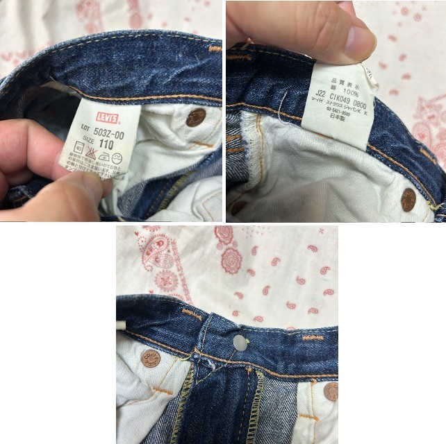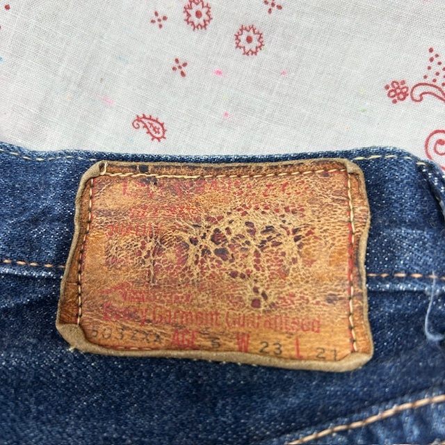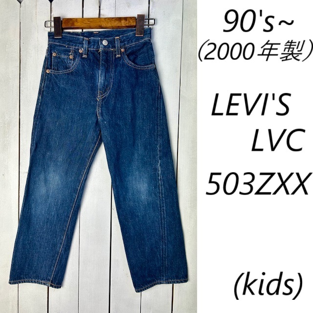 ●商品説明・・・90年代~(こちらは2000年製)の今では希少となったヴィンテージ復刻のオールドの珍しいkids用リーバイス 503ZXXです。60s頃のヴィンテージの復刻・レプリカモデルになります。501xxよりも太めのゆったり感のあるシルエットです。大人用同様にしっかり作り込みされたLVC(ヴィンテージクローシング)ラインで、仕様としてはbigE・赤ミミセルヴィッジデニム・革パッチ・ジッパーはSCOVILL・隠しリベット・Vステッチ・2色ステッチ・裾チェーンステッチなどです。しっかり濃いインディゴ色で、いい感じにアタリ・色落ちの出始めている風合いのよい一着です。made in Japan (日本製)で、素材はコットンで、オールド物のしっかりしたオンスの昔ながらのデニム生地です。110~120程度のサイズ感かと思います。
