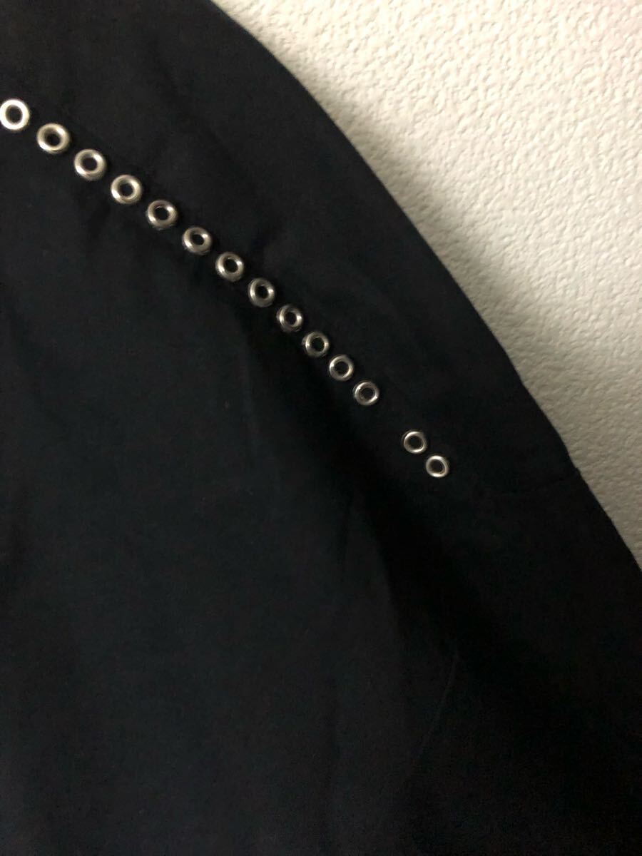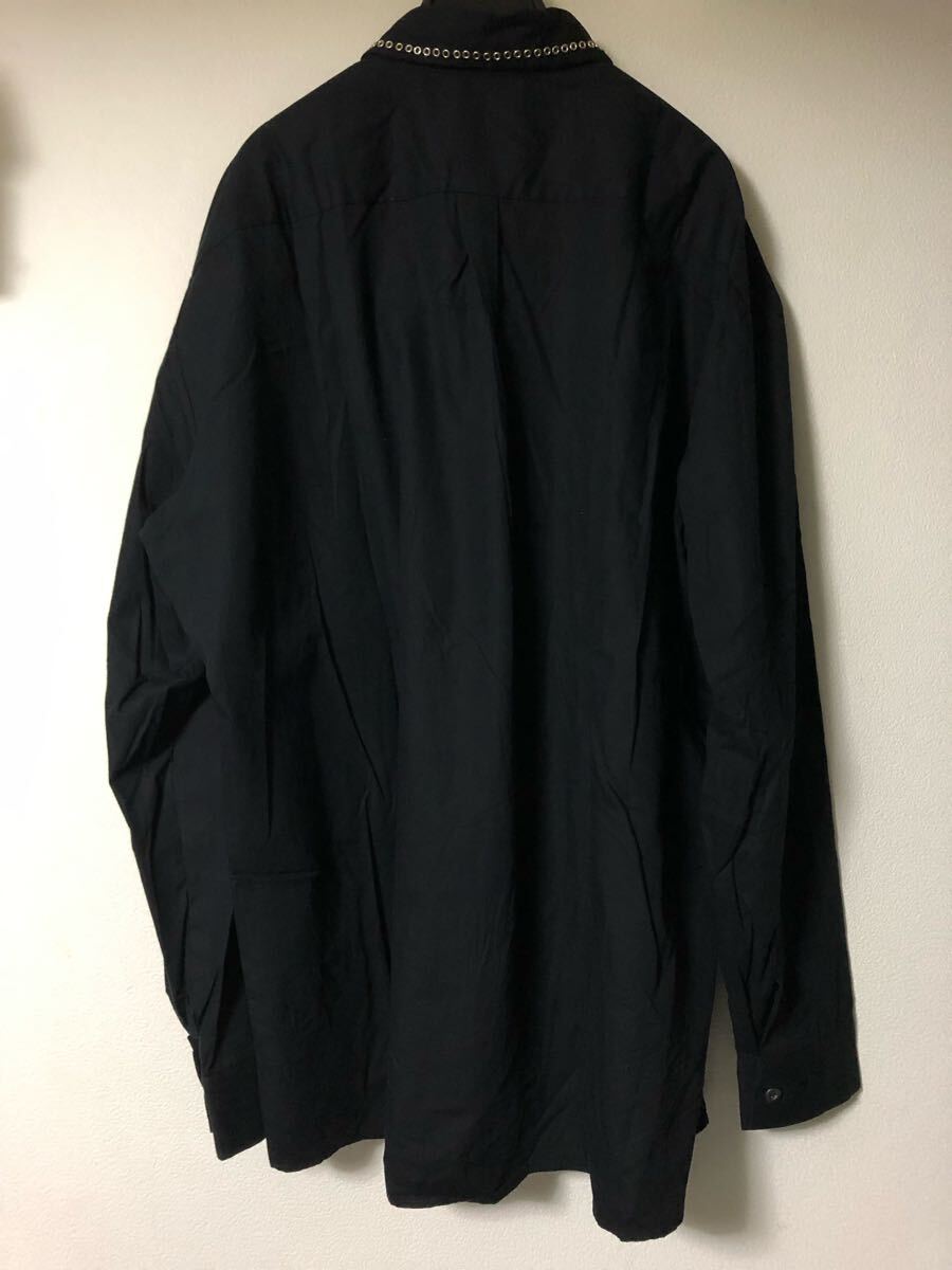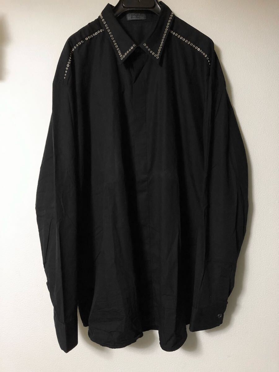 オーバーな比翼の黒シャツに、メタル装飾の入ったデザインです。