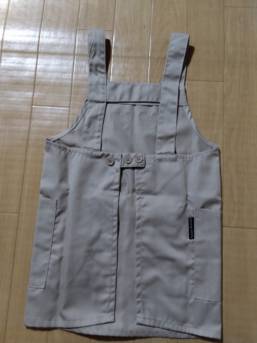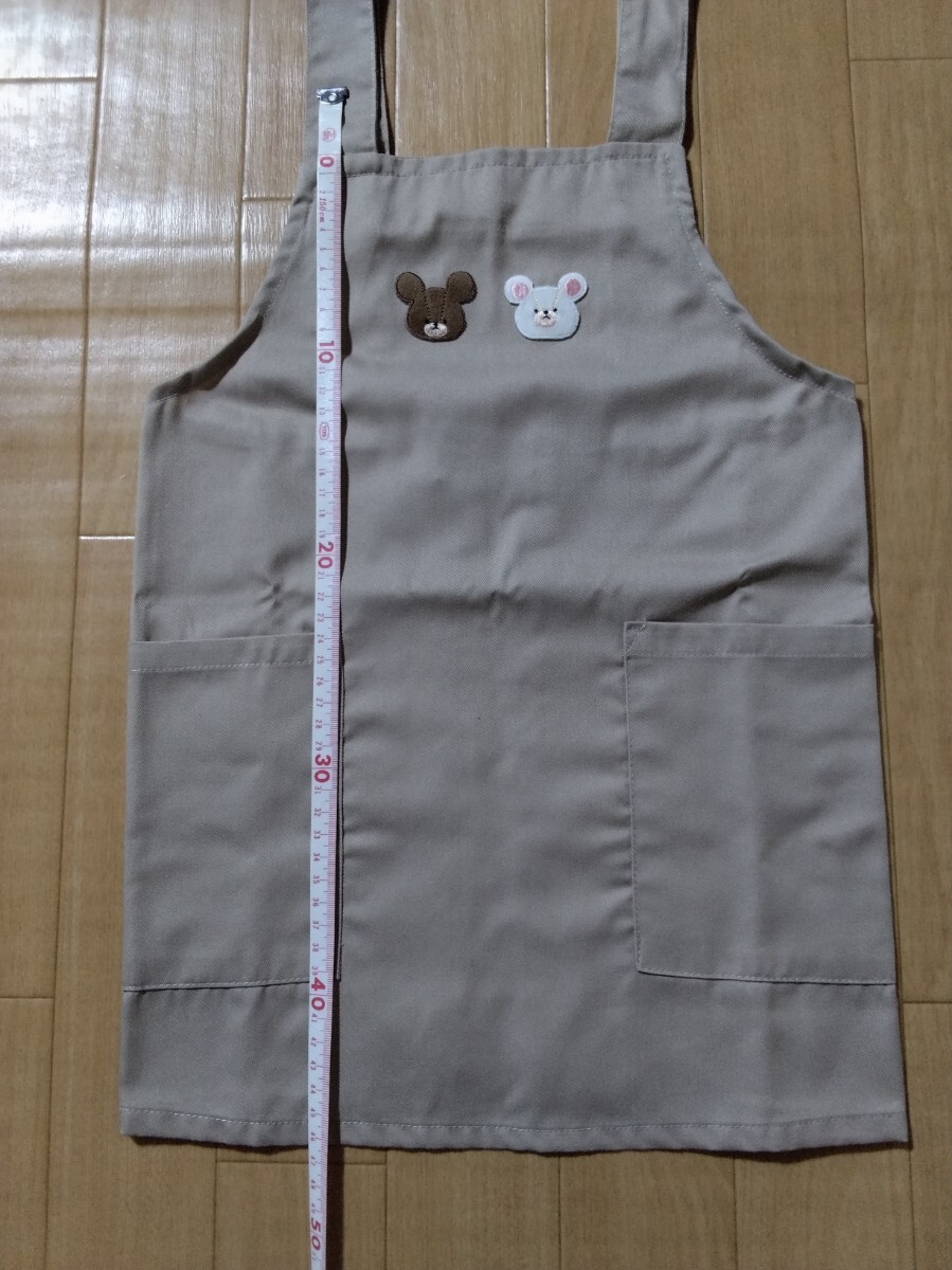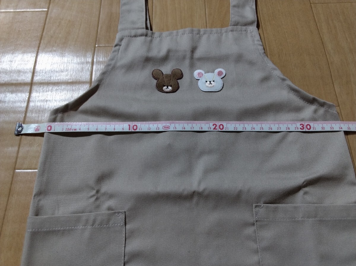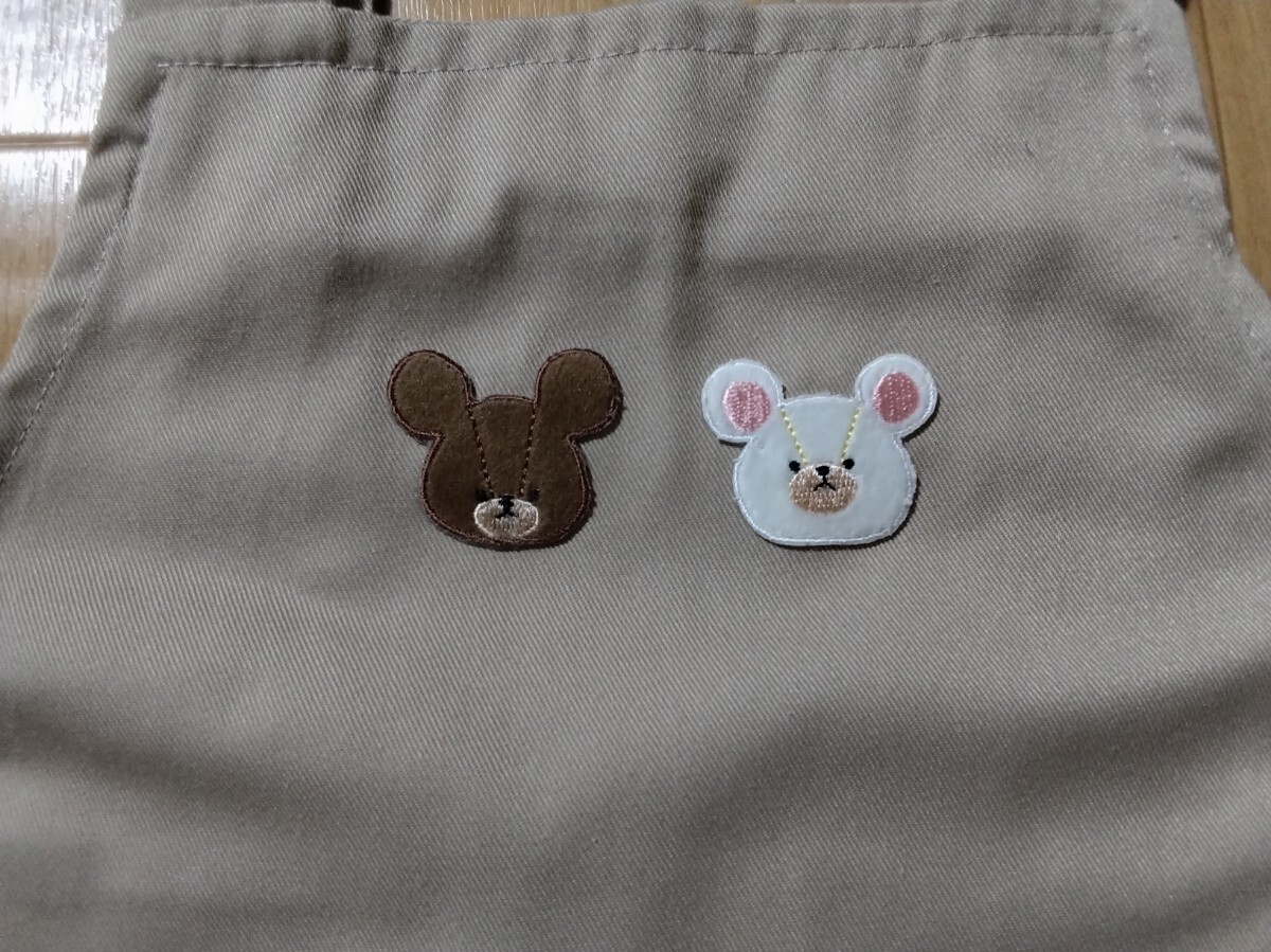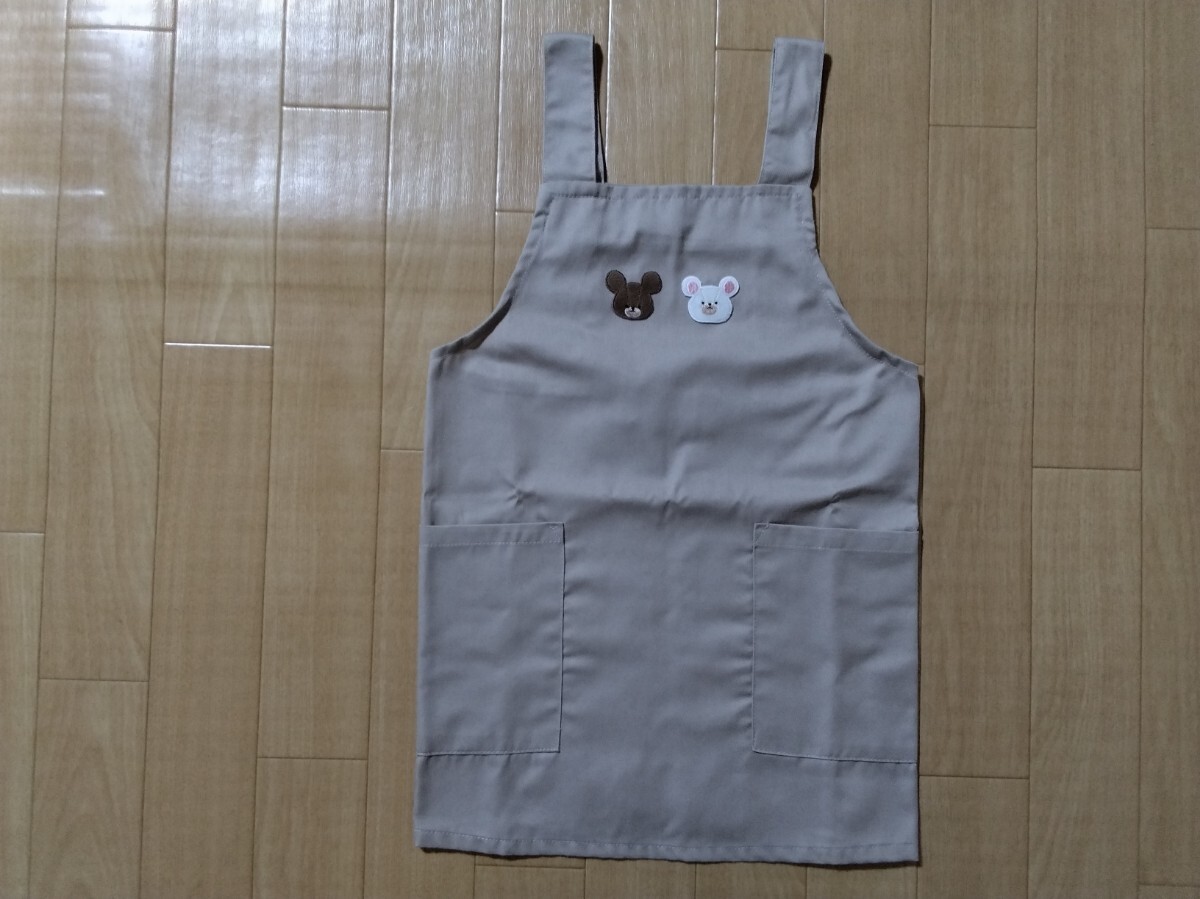 無地のエプロンに くまのがっこうのワッペンをアイロンでつけました。