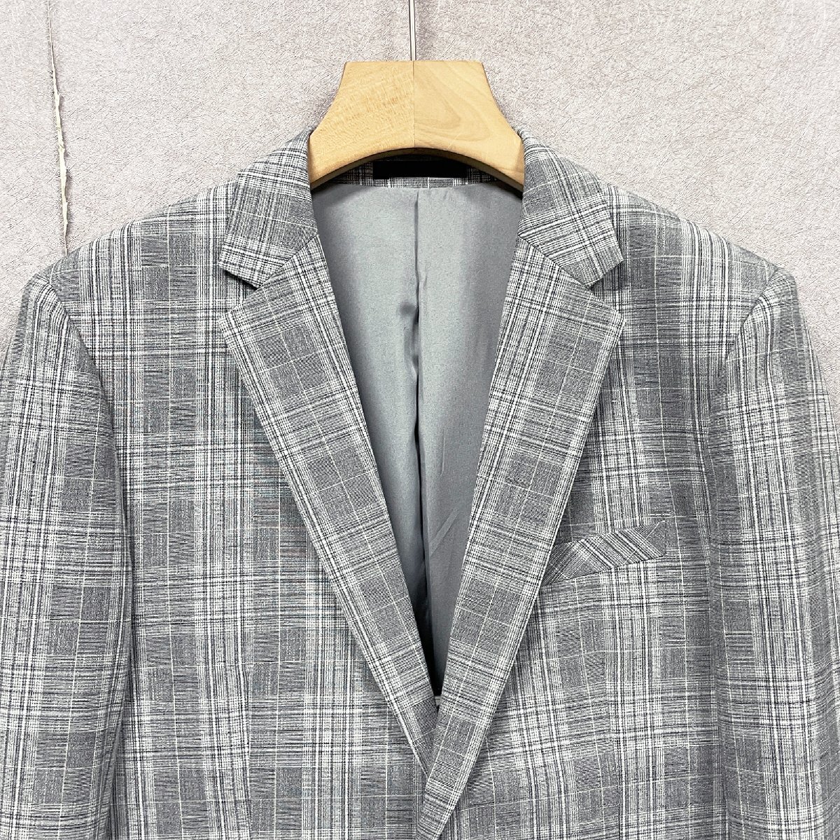 おしゃれなチェック柄デザインで、羽織るだけで紳士の魅力を演出してくれます。定番な襟のデザインが簡潔で、男性のがっちりしたネックラインを見せてくれます。また、前たてに付いたボタンは、1つだけど程よい存在感を生み出します。袖口も三つボタン付きのデザインで、おしゃれな重ね風を感じます。