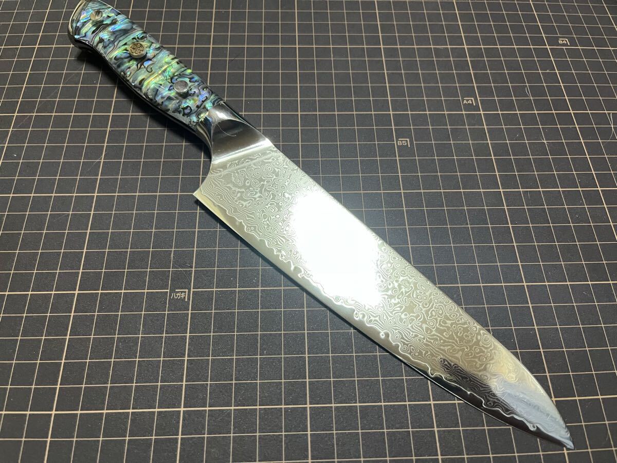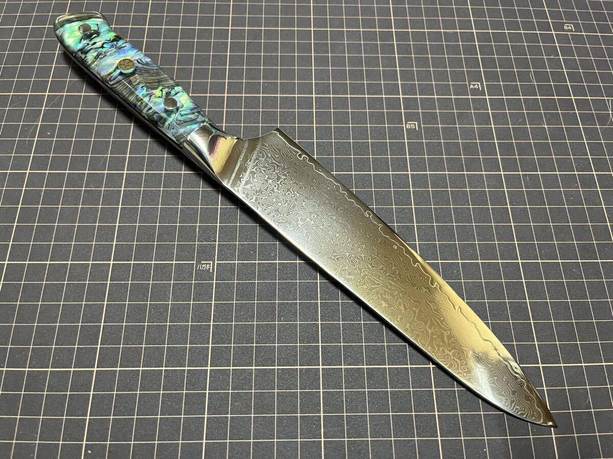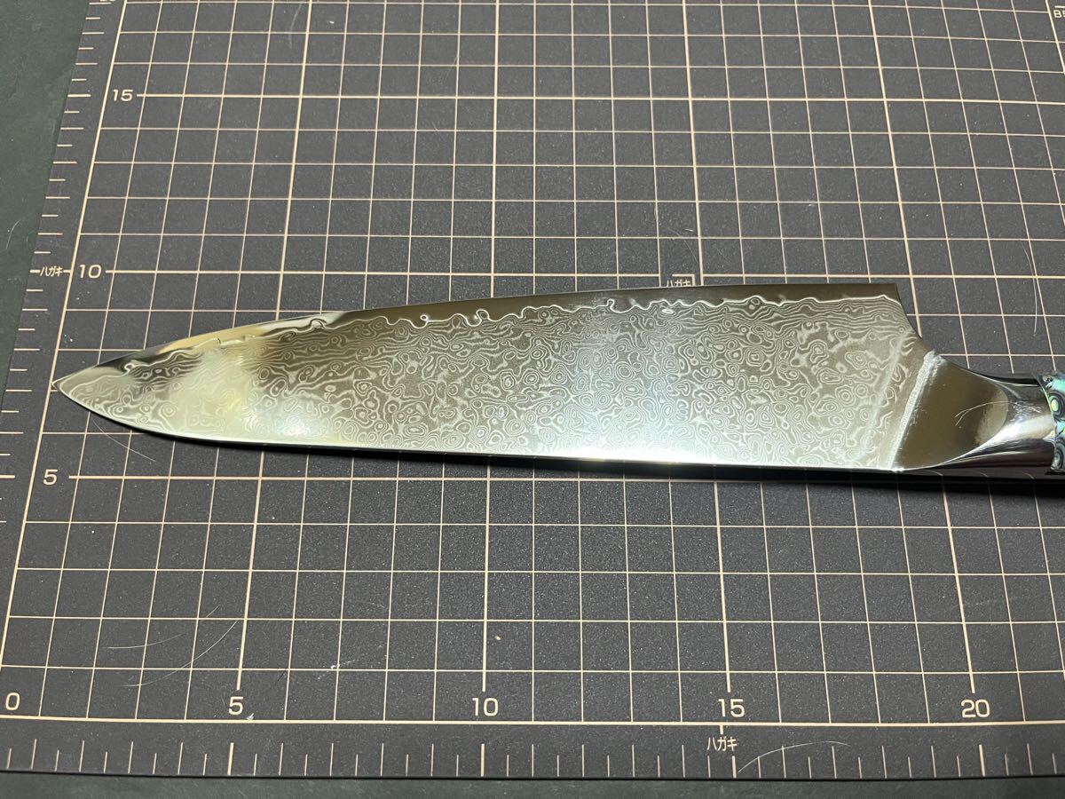 ダマスカス模様の刃と青色装飾のハンドルが特徴的な牛刀。