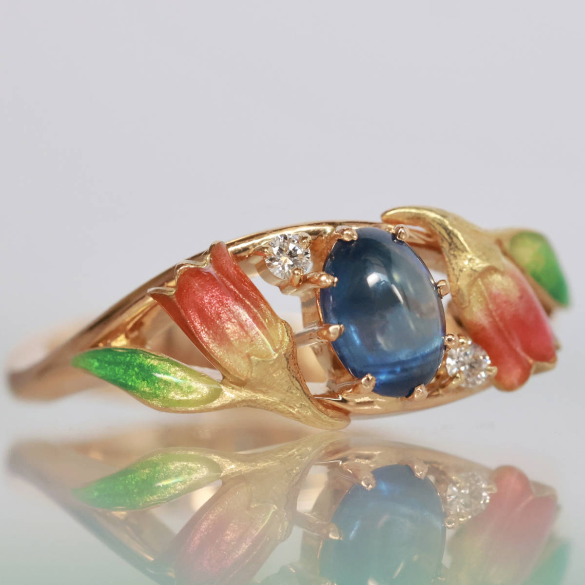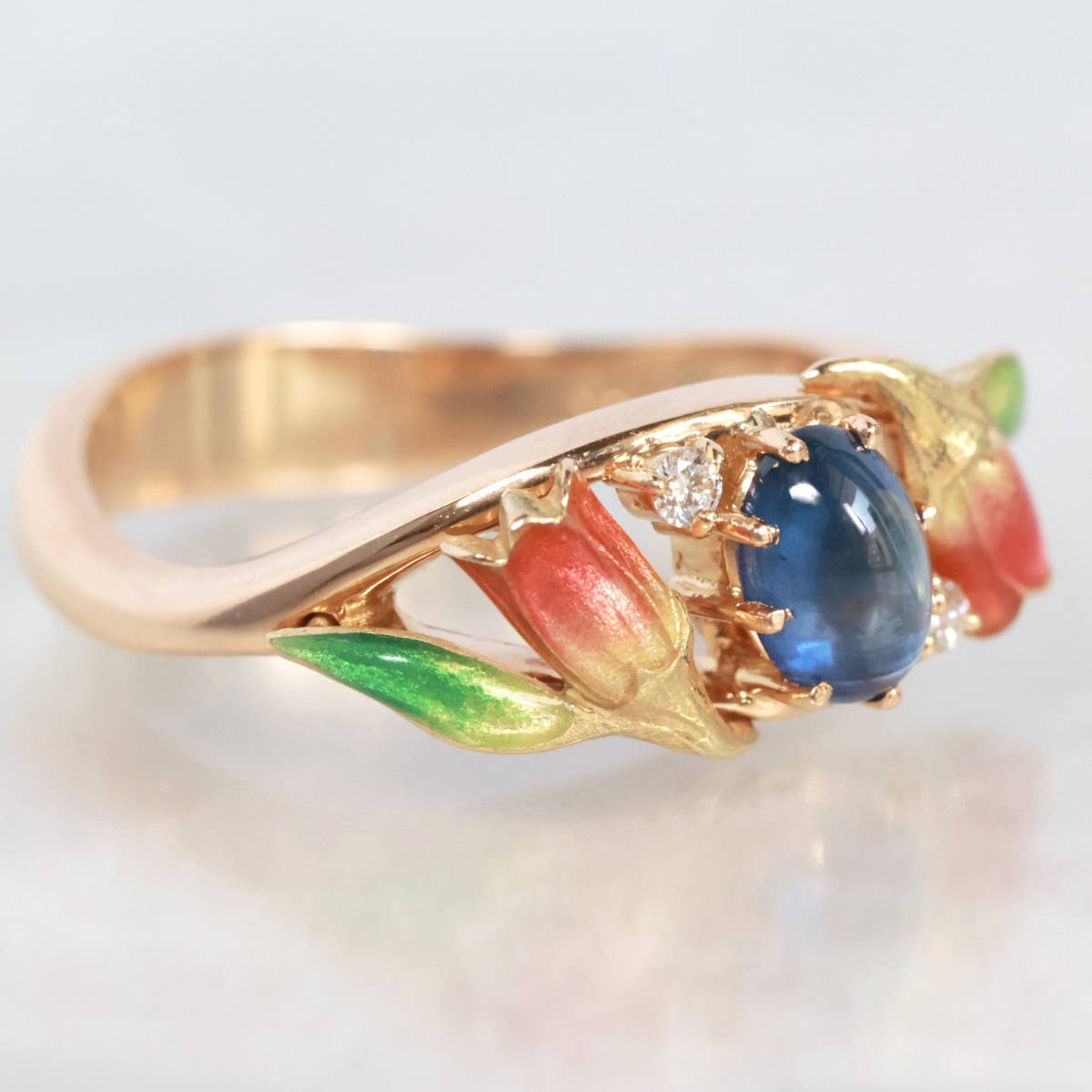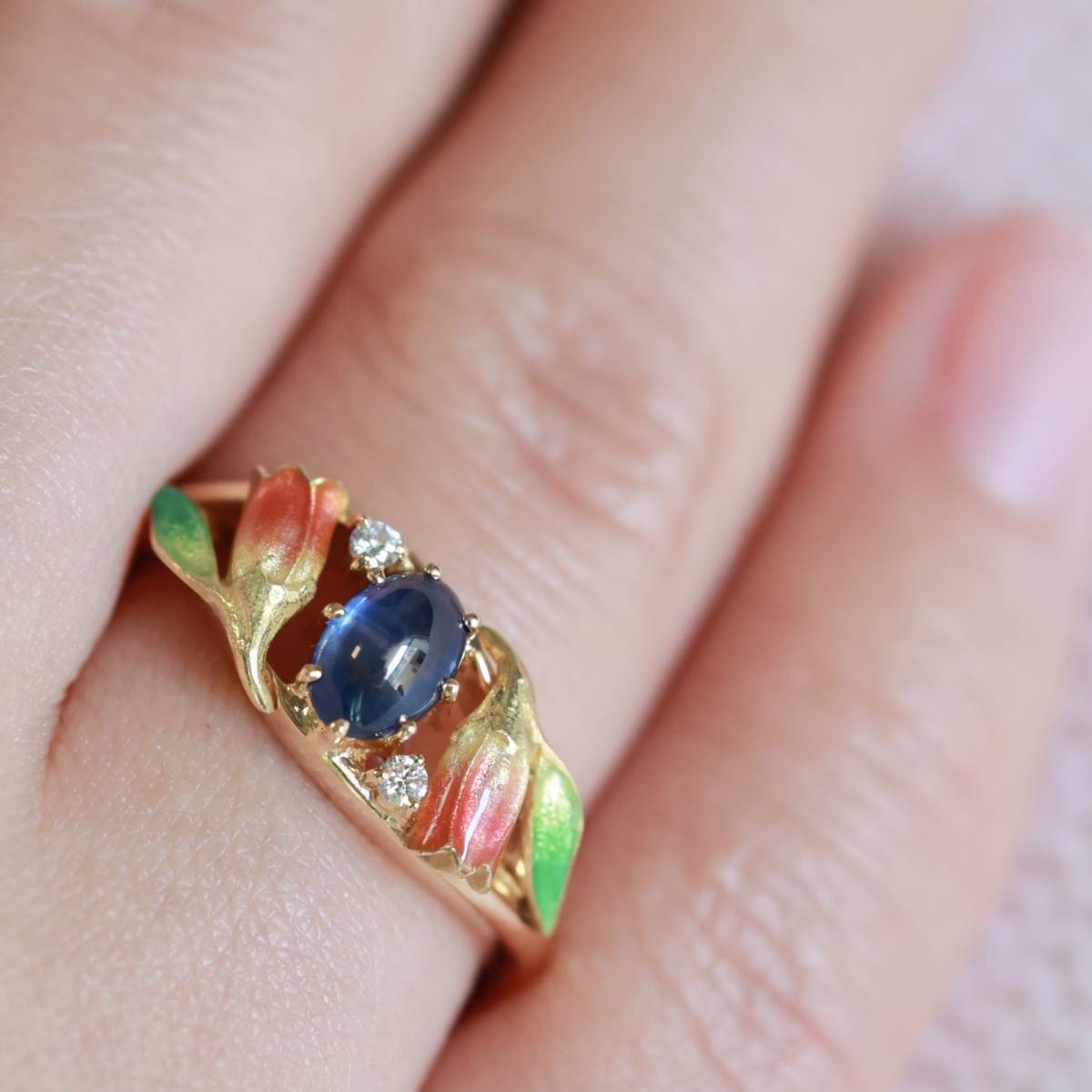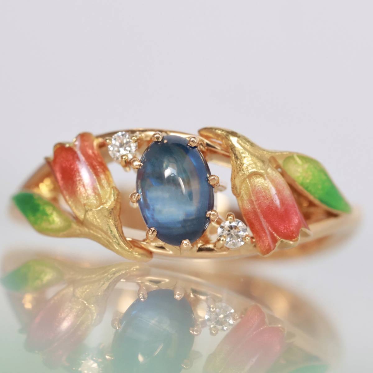 750 中嶋邦夫 バスタイユ エナメル サファイア ダイヤモンド リング チューリップ K18 YG