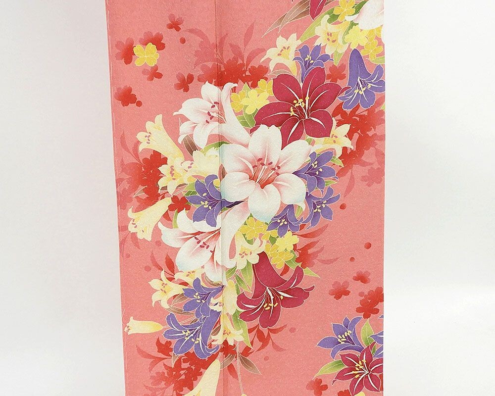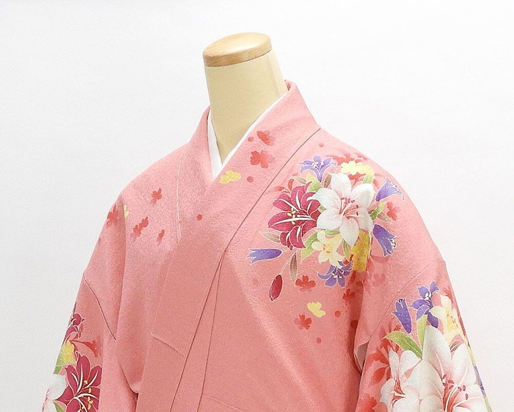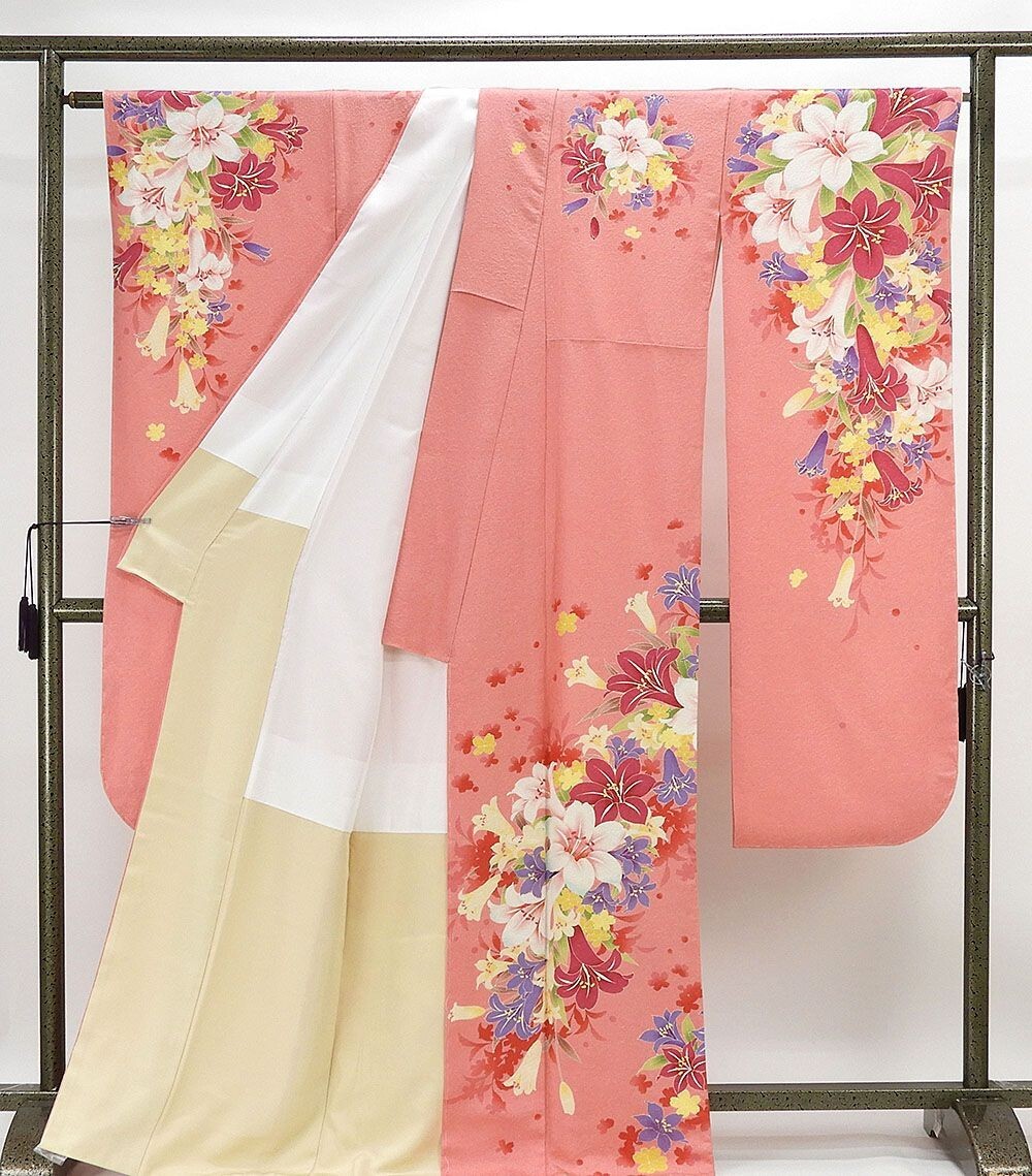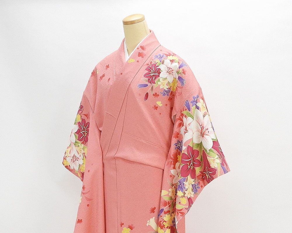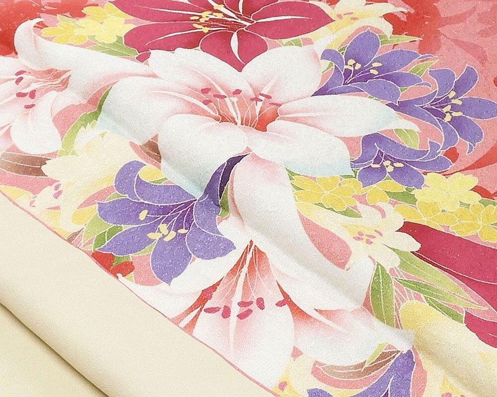 銀通し氷割地紋のコーラルピンク地に多色で百合や桜模様が柄付けされています。