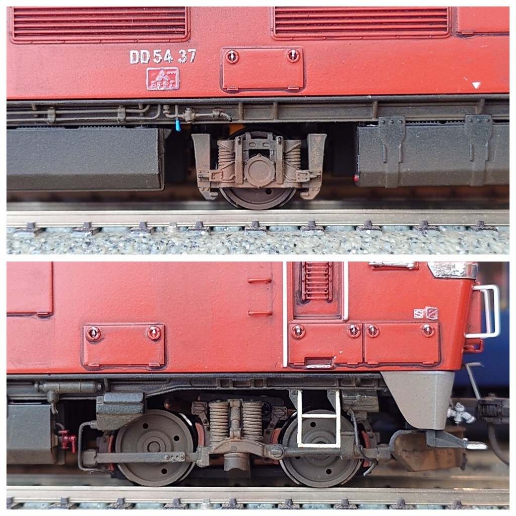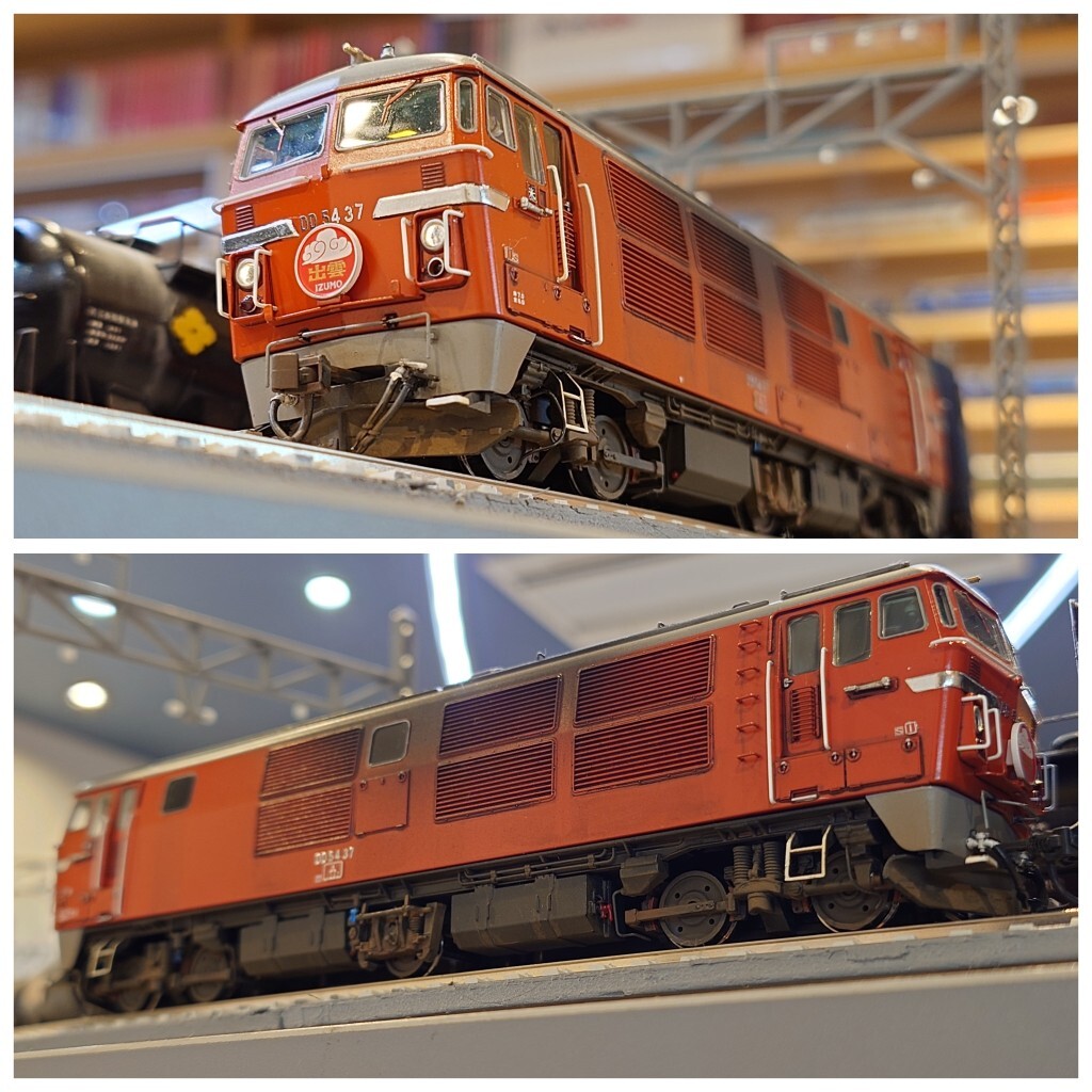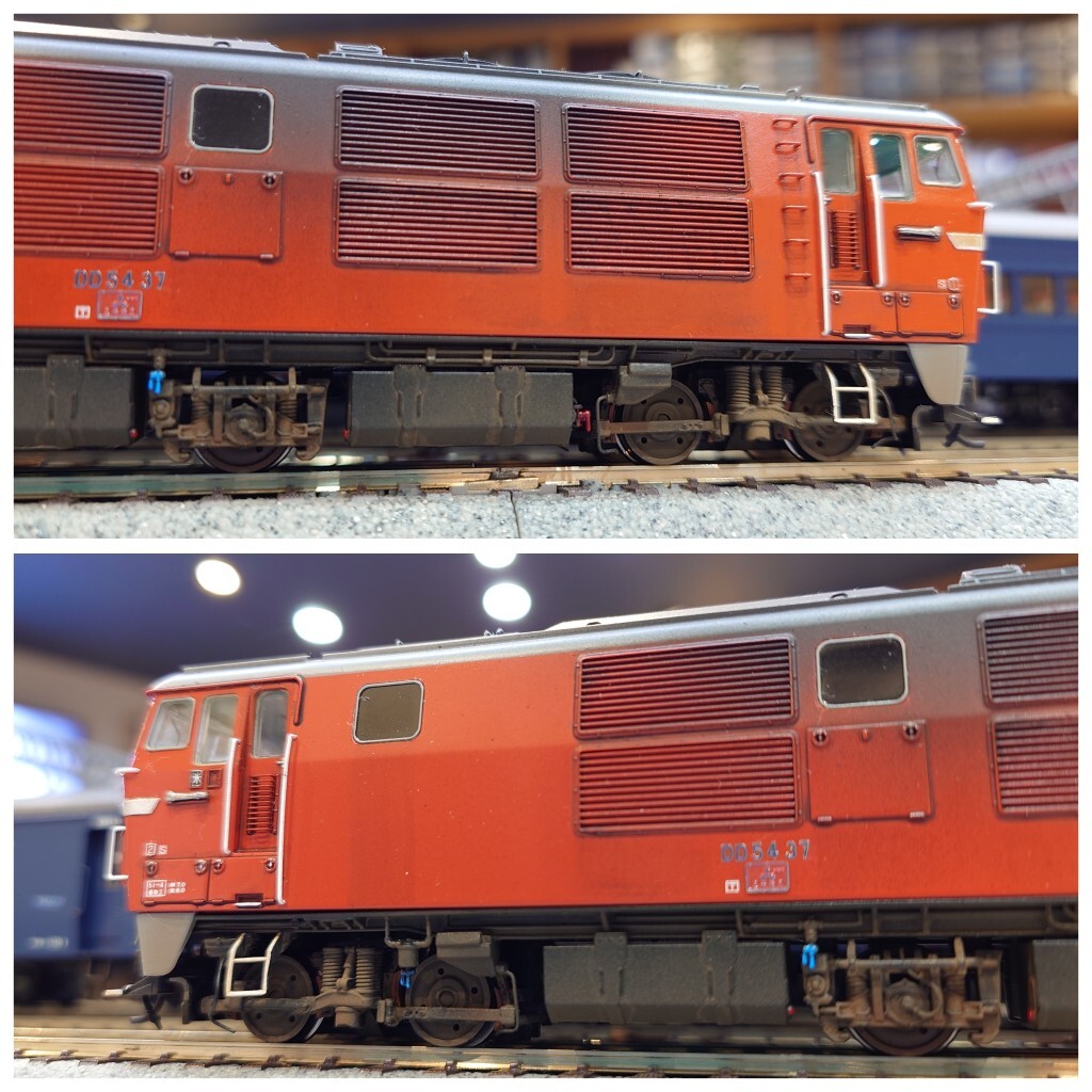 ●まずはじめに…当方は業者ではありません。納品書、領収書は発行いたしません。●ご覧いただきありがとうございます。造形村DD54 6次形 激汚しカスタマイズ37号機を出品いたします。●RM MODELS ARCHIVE 鉄道車両ガイドvol.1 DD54に画像が掲載されている37号機をモチーフとしました。●1エンド側に「出雲」ヘッドマークを、2エンド側にヘッドマーク受けパーツを設置。少量のゴム系接着剤で止めてますので、落札者様で配置を変えることは可能です。●画像では2エンド側のジャンパホースを福知山タイプ(連結器左右のホースを外した元空気溜引き通し栓のみ残した姿)にしていますが、1エンドと同様の米子タイプにして出荷いたします。福知山機にするための白コックパーツを4個お付けします。●種車は本年8月に大手中古ショップより購入した2012年ロットの未使用保管品です。走行痕ありません。灯火(主灯、尾灯スイッチ入り切り問題なし)、走行に問題はありません。極めてスムーズに走行しますが、元の製品をいじり倒して台無しにしておりますので1円スタートといたします。メーカー出荷直後の店頭状態や、転売目的押し入れ熟成手袋扱いの潔癖状態をお望みの方は本オークションへの参加をご遠慮願います。●付属品はお付けするものが全てです。●カスタマイズは以下の通りです。①車番はトレジャータウンのメタルインレタ。他のインレタと共に貼付後に2種類のコーティング塗装実施。②車体全体を艶出し塗装し、適所強めのウェザリング。ルーフの煤汚れはもちろん強めに表現。③車体側面の点検蓋ロックに白の色差し。④中間台車TR104Aの非公式側に速度検知ケーブルを真鍮線で表現。⑤スカートのエアホースはTOMIX製パーツに換装。⑥足回りは全てバラし、洗浄、ミッチャクロンにて下地処理の後にサフ処理。塗装で新製状態にしたのち全体をミディアムな汚し。ブレーキシュー周り、動輪に赤錆のニュアンスを強調させ技巧を尽くしたウェザリング加工を施しております。実機同様のメリハリと奥行きのある造形表現をお楽しみください。⑦台車フレーム、燃料タンクのコック類に色差し。⑧運転席の機器類塗装。1エンド側に運転士(KATO製国鉄運転士)を乗務させています。●元々のプラが見えているところは皆無です。浅薄なプラの質感を払拭すべく徹底的に手を加えております。●車輪は踏面のクリーニングを実施。再組み立ての際にグリスアップ(製作派に定評あるベルハンマーNo.2を使用)を施し、より滑らかに走行致します。●ウェザリングはウォッシングとブラシワークを駆使し「汚し」⇒「定着処理」⇒「化粧汚し」と3段階の作業をしております。塗膜は堅牢に仕上げてありますが、取り扱いにはご注意ください。●今回の作品も店頭商品の玩具状態に現実味を感じない方、働く車両に魅力を感じる方等、製作の意図をご理解いただける方のみご入札ください。素人が製作したものですのでメーカー完成品のような完璧なものがご所望の方は入札をご遠慮ください。●必要以上なマクロ撮影で肉眼では気付かぬアラも見えております。以上のような車両ですので現状は画像を参考にして、「ノークレーム、ノーリターン」でお願いいたします。●また、トラブル防止のため、新規の方、評価数が9以下の方、悪い評価が3以上の方(以前当方との取引実績のある方は除く)は入札をご遠慮ください。特に既に高額な入札額になっている場合は恐れ入りますが、こちらの判断で削除いたします。上記に当たる方で、どうしてもご入札を希望される方は、質問欄からまずご連絡くださいませ。●オークションのシステムが落札者保護に変更なったことをご了解のうえ、商品到着を迅速にご報告できる方のみご入札くださいませ。●まれに、締め切り延長まで散々競ったあげくに、なかなか最初の連絡がいただけない方がいらっしゃいます。迅速な対応が難しい環境にいらっしゃる方はオークションへの参加をご遠慮くださいますようお願い申し上げます。●落札後12時間以内に取引開始ができない場合、落札後48時間以内にかんたん決済お手続きがなされない場合は「落札者都合」にて削除。速やかに補欠繰り上げと致します。●落札後12時間以内にかんたん決済でお支払い手続きしていただけましたら即日発送いたします。かなわぬ場合は発送が翌週になることがありますのでご了解ください。●元箱におさめ、ゆうパック(80サイズ、元払い)のみでお届けいたします。●お支払い手続き次第では発送が翌週末以降になることもありますのでご了解願います。