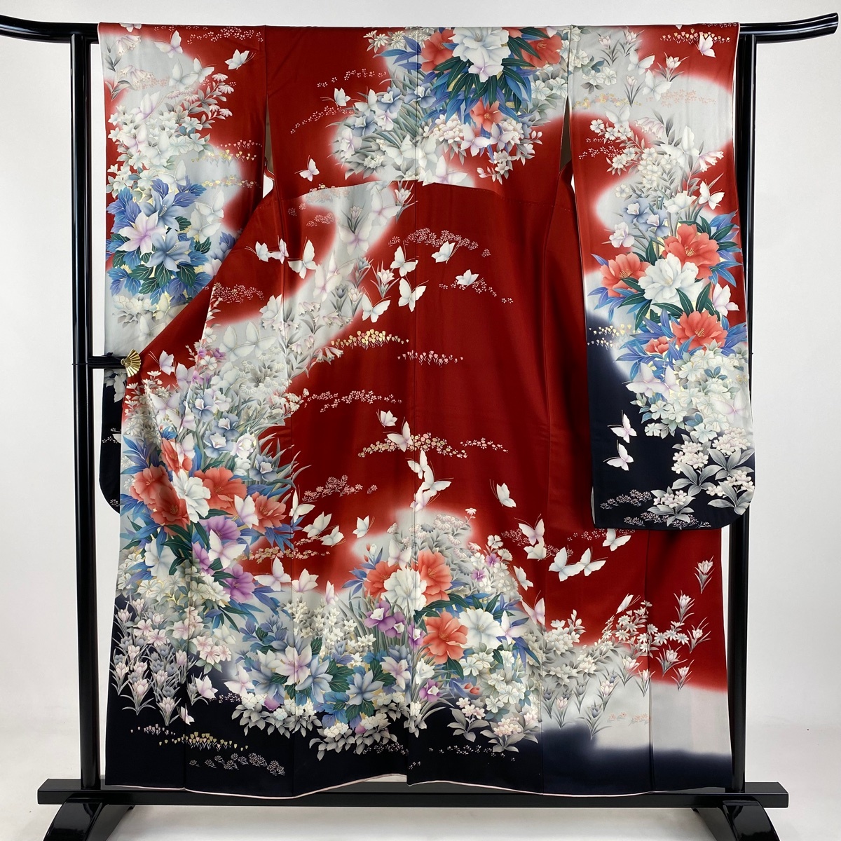 振袖 秀品 草花 蝶 金彩 染分け 赤 袷 身丈154.5 裄丈61 S 正絹 【中古】 |
