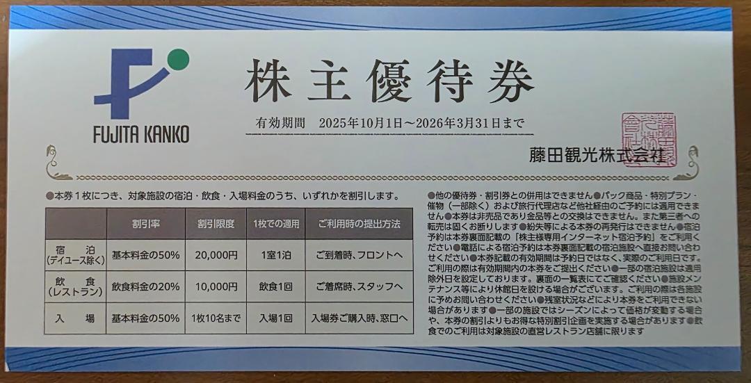 商品説明 | 【最新】藤田観光株主優待 有効期限2026年3月31日 施設の詳しい情報につきましてはホームページで確認お願いします。 使い方の分かる方のみ入札をお願い致します。 詳細は藤田観光のサイトでご確認ください。 1.レジャー施設入場 割引(1枚で10名様まで) ①箱根小湧園ユネッサン 50%割引 ②下田海中水族館 50%割引 2.宿泊 50%割引 ①ホテル椿山荘東京 ②箱根小湧園 天悠 ③箱根小湧園 三河屋旅館 ④箱根小湧園 美山楓林 ⑤伊東小湧園 ⑥伊東 緑湧 ⑦十和田ホテル ⑧永平寺 親禅の宿 柏樹関 ⑨藤乃煌 富士御殿場 ワシントンホテル ホテルグレイスリー WHGグループホテル ホテルフジタ福井 ※宿泊50%割引は年末年始適用除外日あり。 3.ご飲食20%割引 ①箱根小湧園内 鉄板焼き・しゃぶしゃぶ 迎賓館 蕎麦 貴賓館 ②炉端焼き 紅葉 ③東京大学伊藤国際学術研究センター内レストラン 詳細はHPをご確認ください。 当方、非喫煙者でペットの飼育もしていませんので 商品にタバコの匂いがついたり ペットの毛が付いていることもありません。 大切に扱っていますので安心して入札ください。 平日3日以内に入金して頂ける方のみ入札をお願い致します。 値引き交渉を質問からされた場合のお返事は致しません。 |